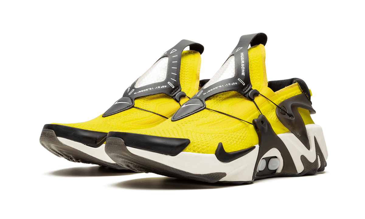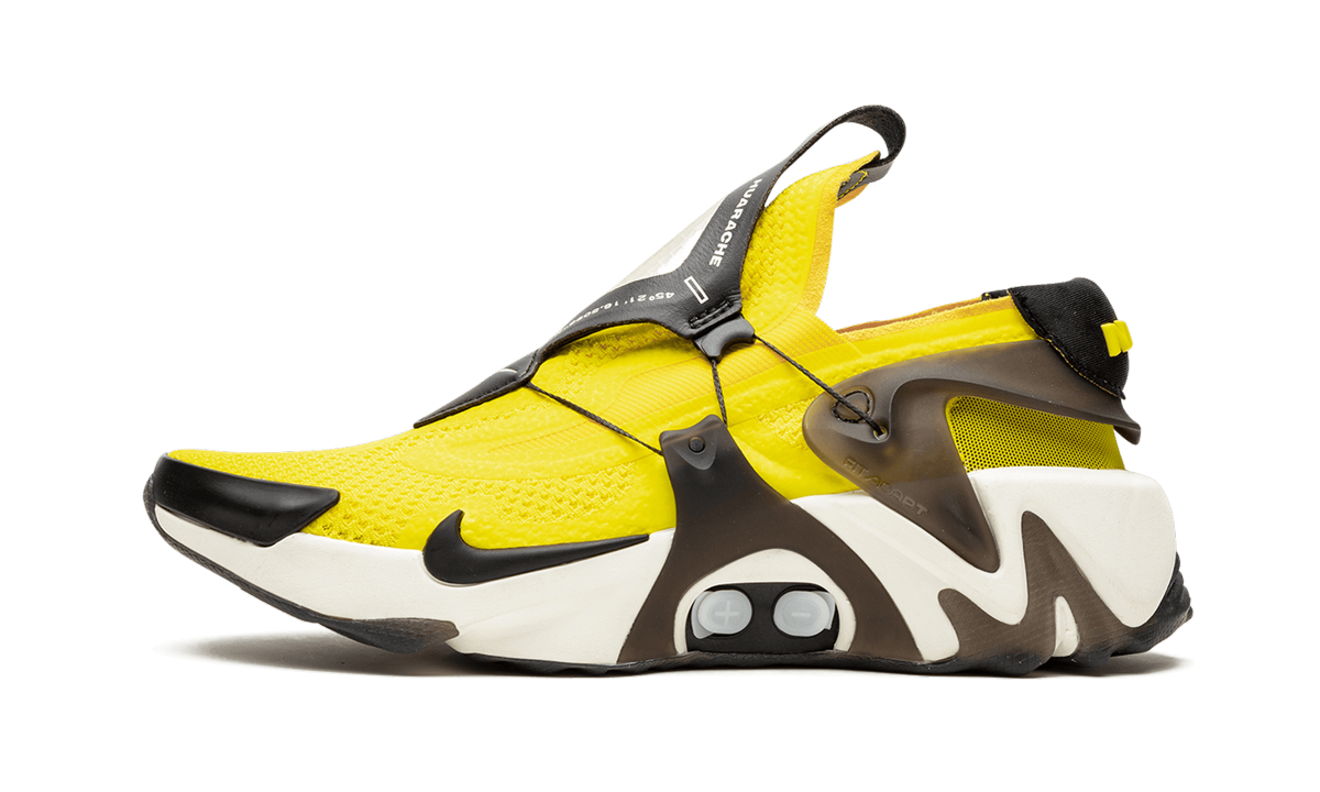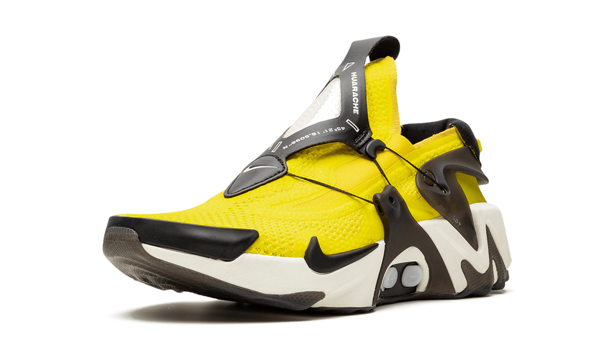 The Nike Adapt Huarache “Opti Yellow” takes the innovative Huarache performance running model to the future with revolutionary Nike FitAdapt technology. The impressive piece of footwear tech updates and adapts along with the user via a midfoot motor and a multi-dimensional Nike Adapt app; a truly groundbreaking function. As for the appearance of the Adapt Huarache, covering the upper is a positively bold Opti Yellow neoprene bootie and exoskeleton upper that is both foot-hugging in form and flexible in its construction. Translucent black TPU overlays appear on the mid-panel and protrude from the midsole below acting as part of the unique Nike AdaptFit system that aids in holding the black leather overlay over the tongue in place. Further contrasting cues include a black leather patch on the tongue with a white Swoosh, a black Swoosh hit on the forefoot above the midsole, and a black synthetic patch on the heel with yellow Nike branding in a 3-D texture. Lastly, the self-lacing Nike Adapt system is housed in the white rubber midsole that features a semi-translucent outsole. The Nike Adapt Huarache “Opti Yellow” was released on September 13th, 2019. Opti Yellow