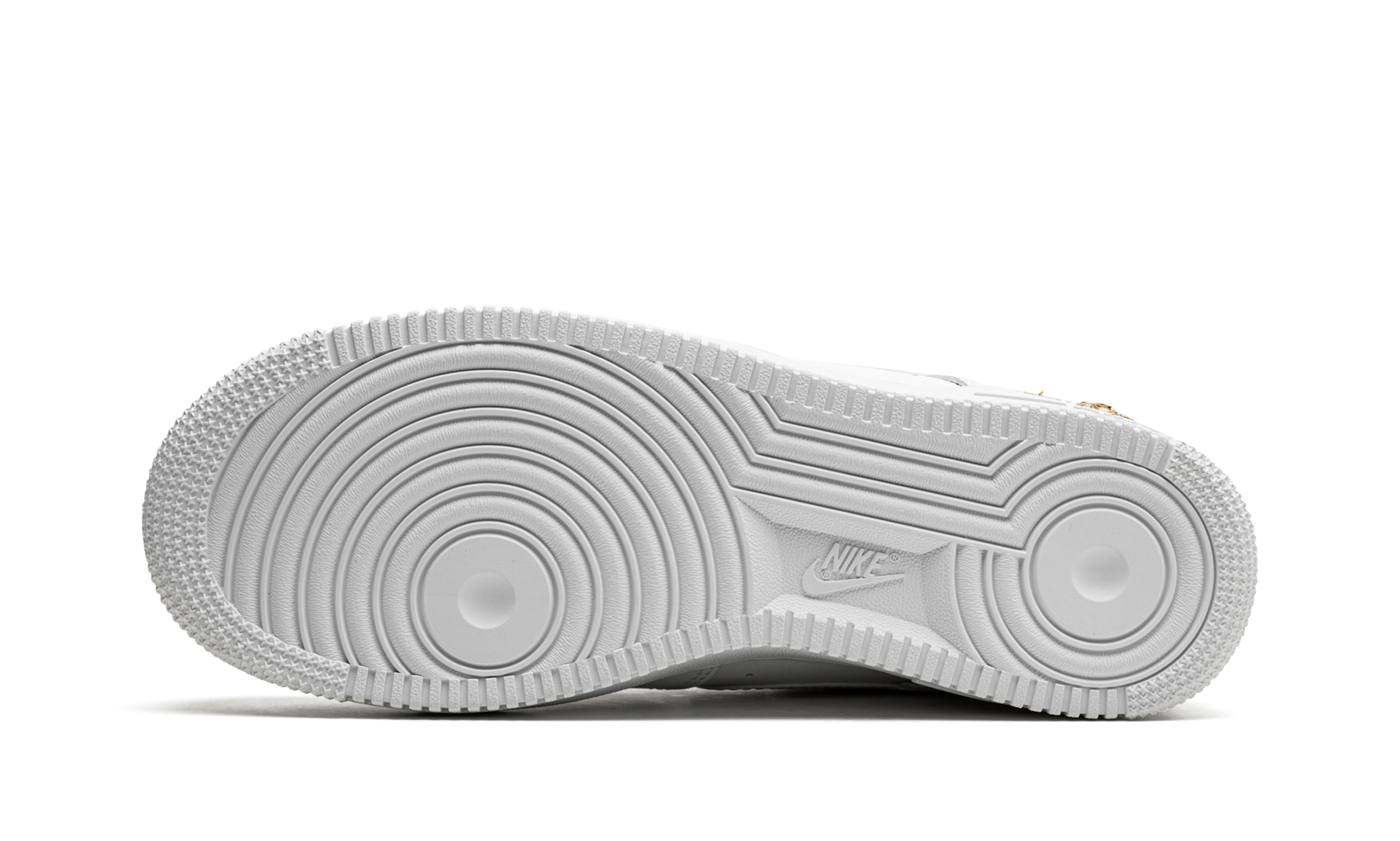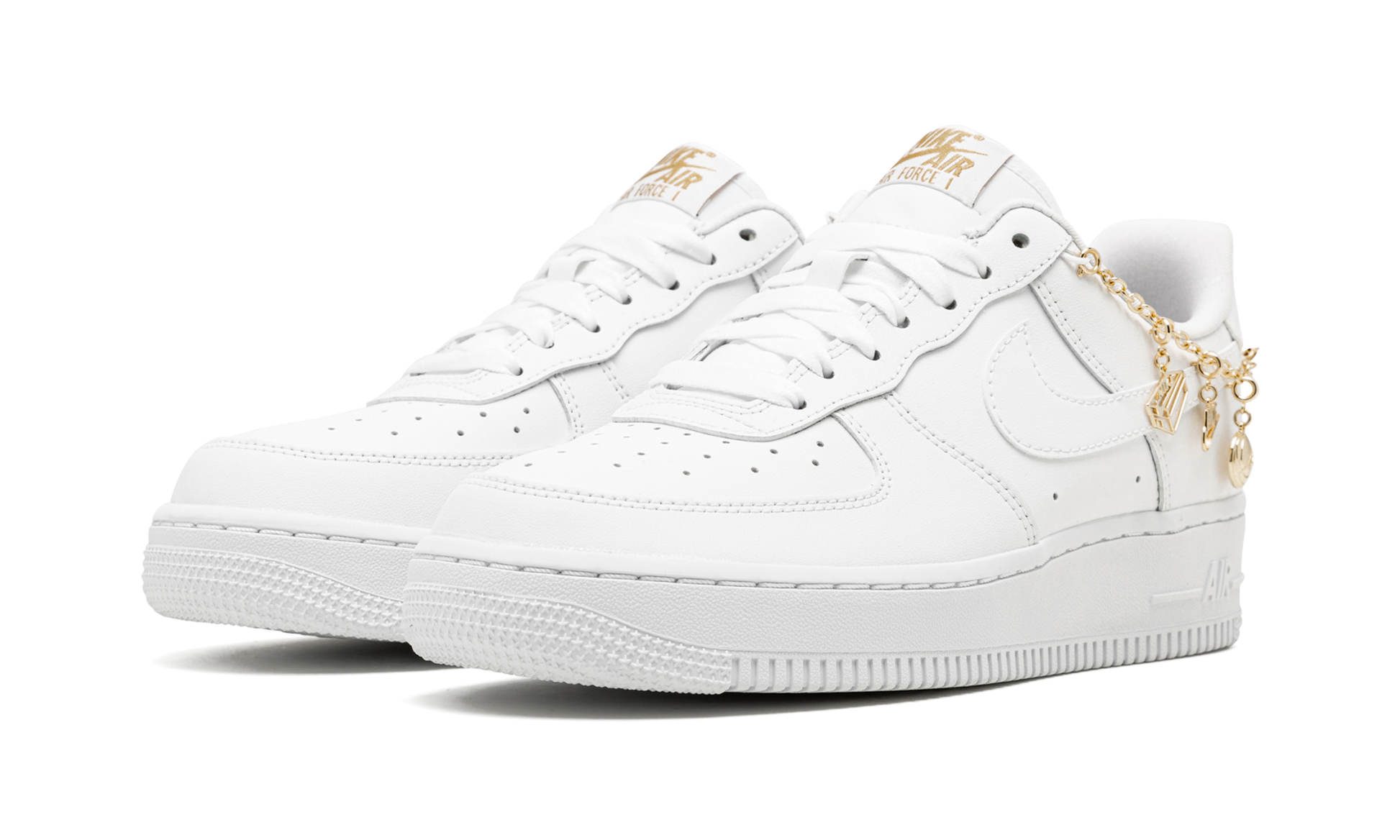 The Women’s Nike Air Force 1 Low “Lucky Charms” is a women’s version of the retro basketball shoe in a casual, white-based colorway that features added jewelry on its design. The “Lucky Charms” is one of several women’s-exclusive variations of the Air Force 1 with flashy jewels on its design, the others being the “Bling” and Air Force 1 Shadow “Charms.” On the “Lucky Charms,” the entire upper, including the perforated toe, overlay panels, and Swoosh branding, are designed in white leather. Contrasting Metallic Gold “Nike Air” and Swoosh detailing are embroidered on the heel and printed on the white nylon tongue tag. A Metallic Gold chain with Nike-adjacent charms is found on the collar. Release date: November 11, 2021 Lucky Charms