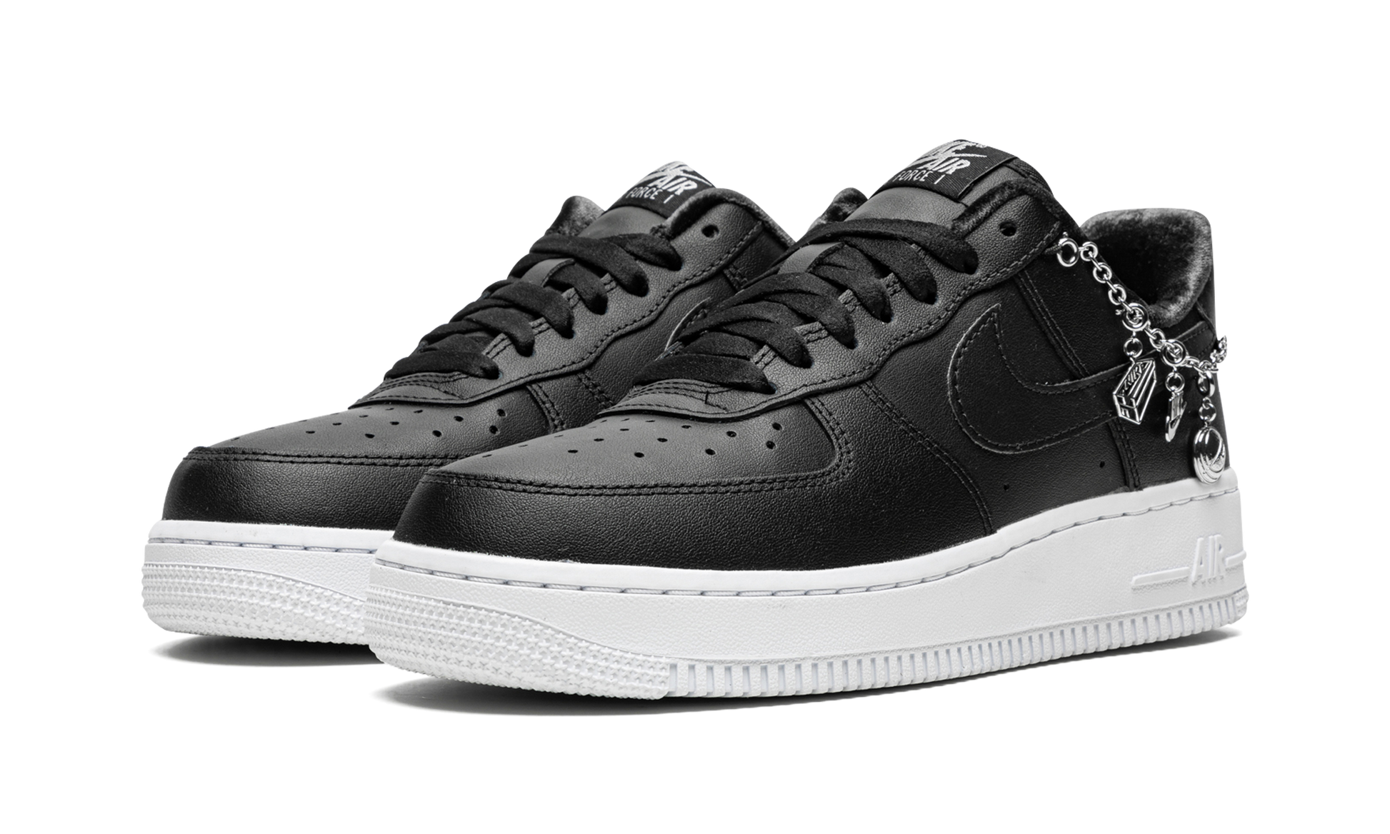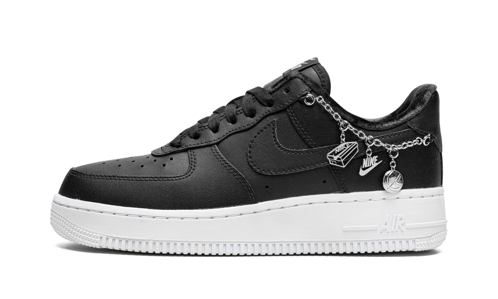 The Women’s Air Force 1 Low “Lucky Charms - Black” is a creative, women’s exclusive colorway of the lifestyle shoe that features jewelry on its design. Playing into the “shoe jewelry” trend in sneakers, the “Lucky Charms” AF1 progresses the vintage basketball shoe’s design into a contemporary look for modern times. Clip-on enamel charms, including a shoe box, a “Nike” logo, and a basketball, appear on the collar. The shoe’s upper features a monochromatic black leather construction with the perforated toe, mid-panel, and Swoosh all appearing in black. A silver “Nike Air Force 1” logo is printed on the nylon tongue tag. The shoe rides on a white rubber sole. Lucky Charms - Black