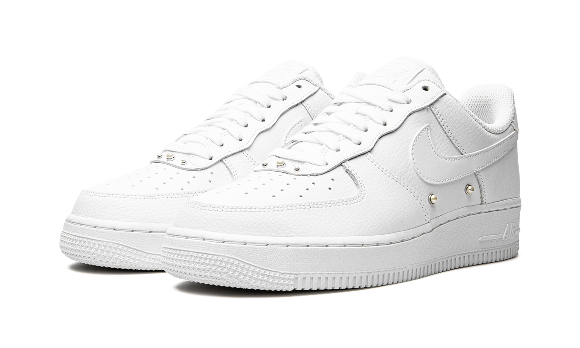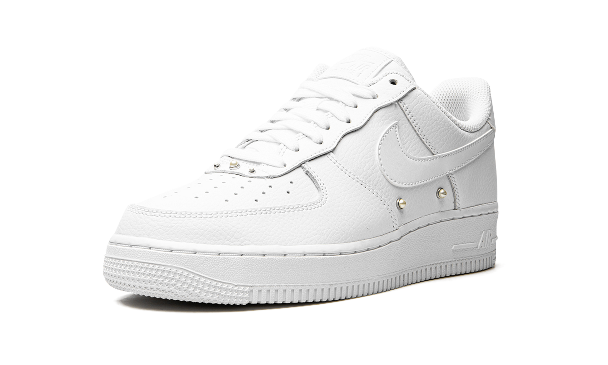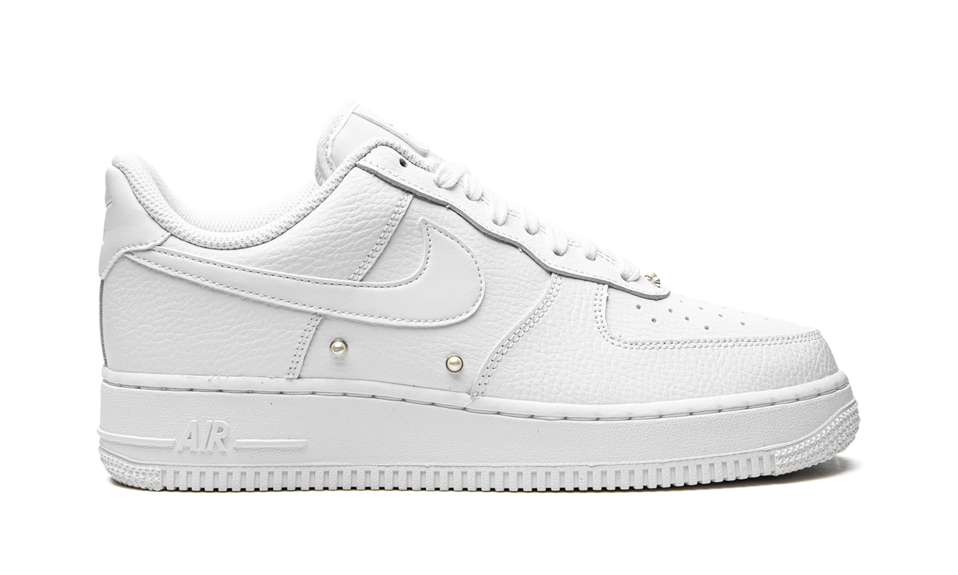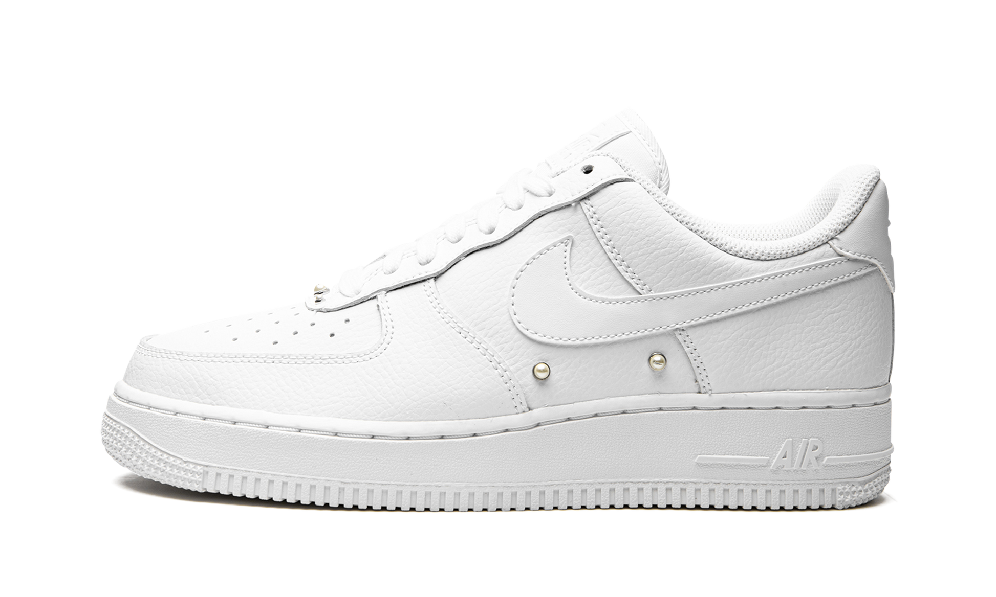 The Women’s Nike Air Force 1 Low “Pearls” is the women’s sizing of the retro basketball shoe in a colorway with added pearl studs. The “Pearls” colorway is another popular Air Force 1 Low for women that incorporates jewelry into its design, following releases such as the Swarovski x Nike Air Force 1 from 2021. Moreover, the mostly monochromatic white design shows love to the Air Force 1’s iconic “White on White” colorway. The shoe’s entire upper is designed in crisp white leather, including the base, overlays, and the Swoosh branding found on either side. Pearl studs can be found on the mid-panel and on the eyestay. A white rubber sole completes the look. Pearls
