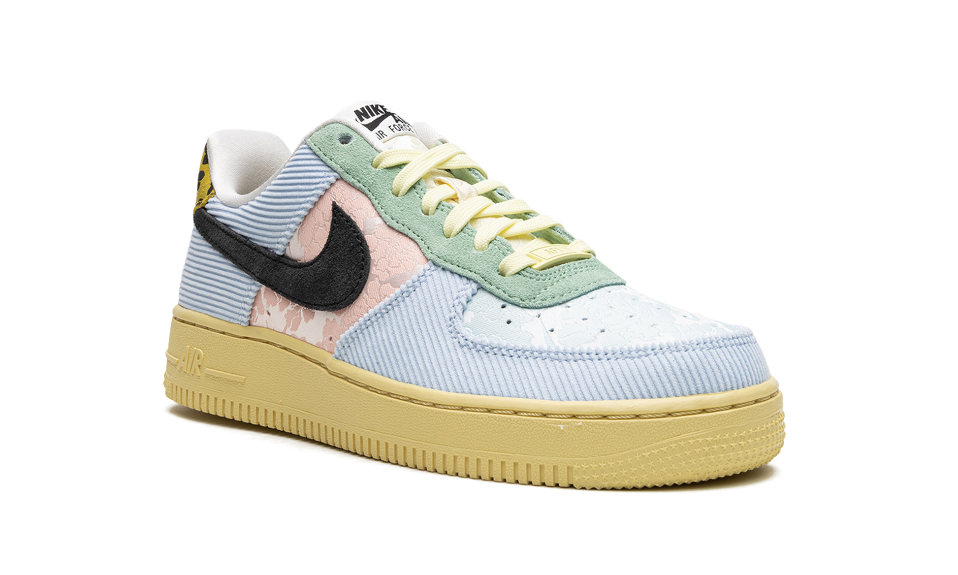 The Women’s Nike Air Force 1 Low “Celestine Blue” is a women’s-exclusive colorway of the classic sneaker with a mismatched design. Arranged in a blend of pastel hues, the “Celestine Blue” features shades of blue, yellow, green, and pink on its design in materials such as corduroy, suede, and a floral pattern in pink. A black Swoosh appears on the mid-panel. Classic “Nike Air Force 1” branding is printed on the tongue tag and “Nike Air” detailing is found on the animal print heel tab. Underfoot, a yellow rubber sole completes the look. Release date: April 13, 2023 Celestine Blue