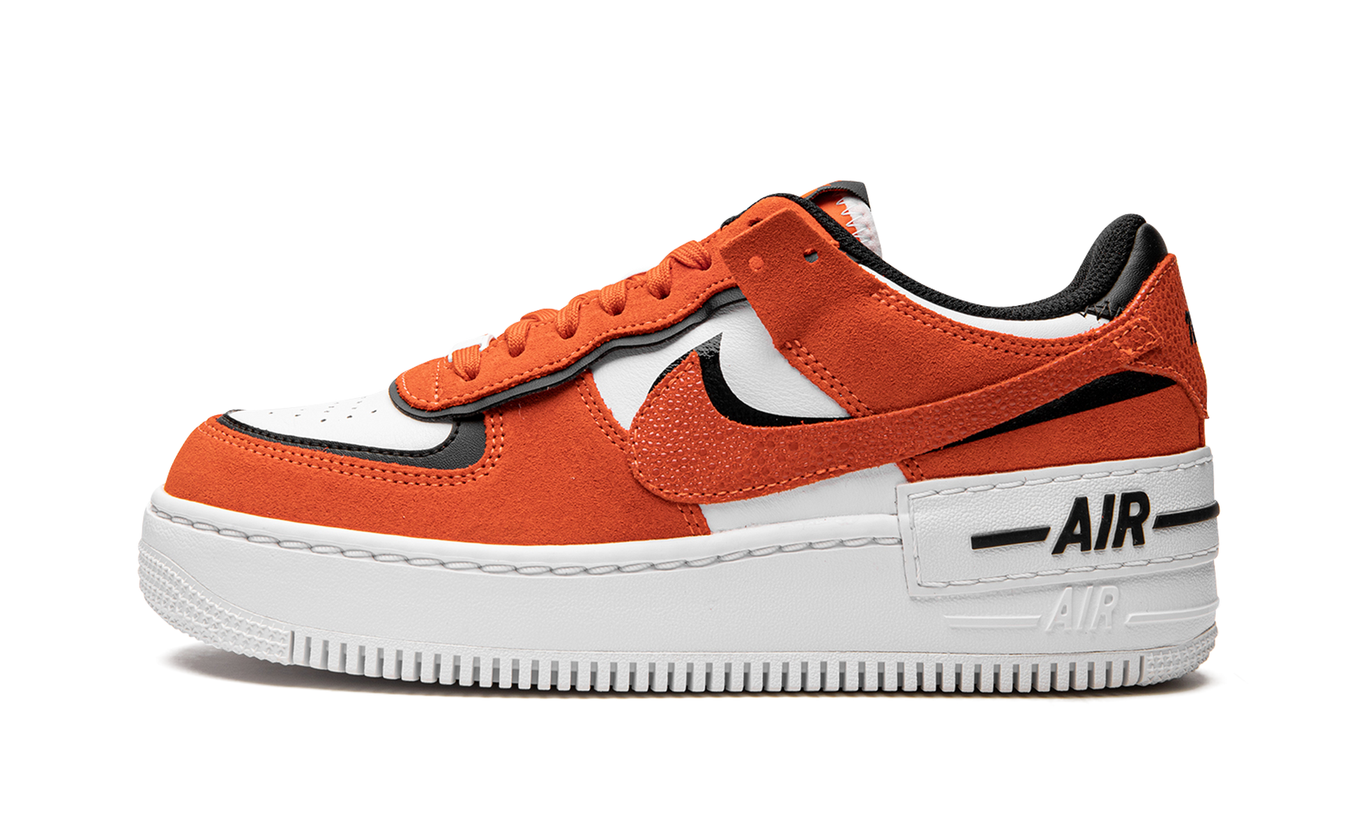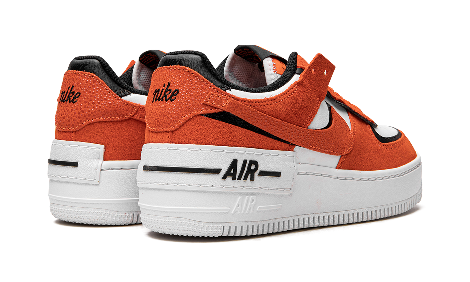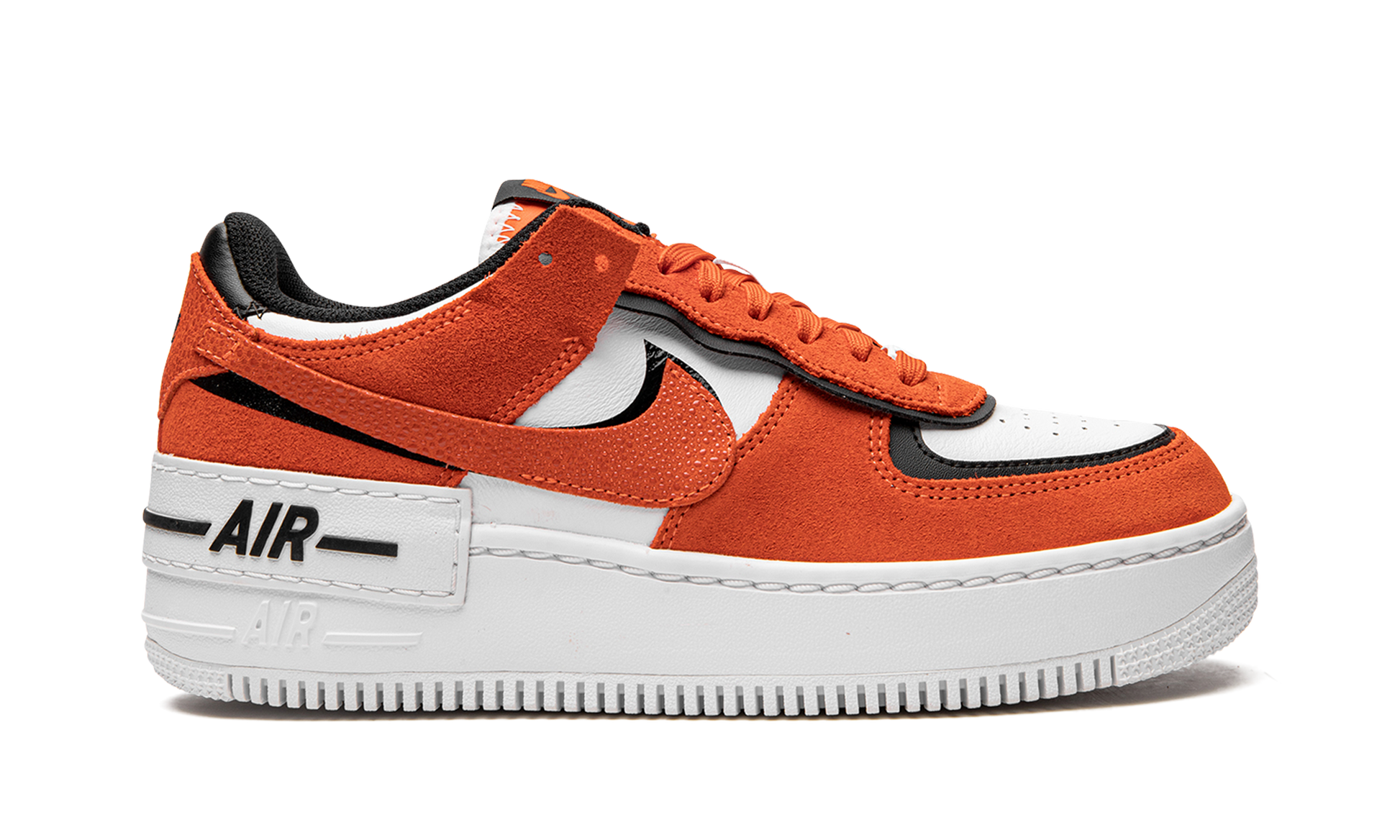 The Women’s Nike Air Force 1 Shadow “Rush Orange” is a women’s-exclusive colorway of the boldly modified AF1 design. With its layered overlays and other contemporary design elements, the Air Force 1 Shadow is unofficially inspired by Off-White’s collaborations with Nike. The “Rush Orange” features a deconstructed aesthetic that was made popular by Abloh, Off-White, and Nike, and even nods to the avant-garde look of Sacai and Nike’s “double” aesthetic. The upper is constructed with a white leather base with orange suede layered over black leather panels. A Rush Orange-colored suede Swoosh is placed on top of a black leather Swoosh on the sides of the shoe. A white rubber panel with black “Air” branding is found above the tonal “Air” logo on the white rubber midsole.