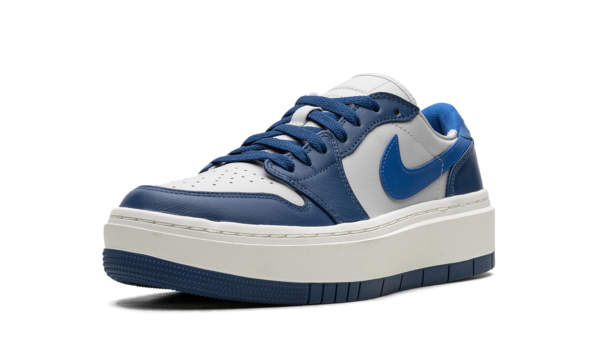 The Women’s Air Jordan 1 Low Elevate “Georgetown” is a women’s-exclusive colorway of the casual shoe with an exaggerated, platform-style sole that shows love to the Georgetown Hoyas college basketball team. While not officially associated with the Hoyas, the Jordan 1 Low Elevate “Georgetown” nonetheless features a color block in the team’s colors. The shoe features a white leather base with blue leather overlays and a blue leather Swoosh. A raised “bubble” style “Wings” logo appears on the heel. The Jordan 1 Low Elevate gives the wearer a significant boost in height with its unique platform-style rubber sole. Release date: May 18, 2023 Georgetown