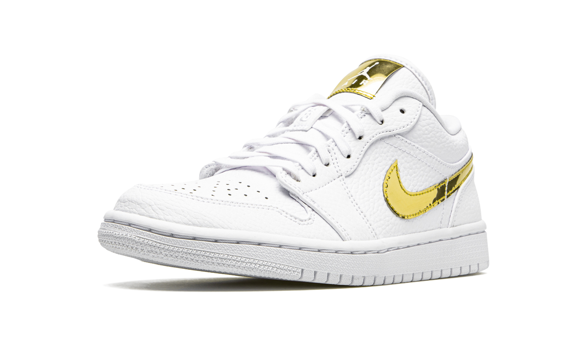 The Women’s Air Jordan 1 Low “White/Metallic Gold” is Michael Jordan’s first signature shoe in its low-top height dressed in a luxurious color scheme. Over time, the Jordan 1 Low has become known for its selection of lifestyle focused colorways, and this “White/Metallic Gold” look is no exception. The entire upper is covered in white tumbled leather, including the perforated toe, mid-panel, collar, and heel. Metallic Gold Swooshes on either side bring a premium look to the shoe. Additional gold detailing can be found on the embroidered “Wings” logo on the heel, and on the metallic tongue tab with white Jumpman insignia. Tonal shoelaces and white “23” embroidery on the lace cover complete the look of this crisp Jordan 1 Low in women’s sizing. White Metallic Gold