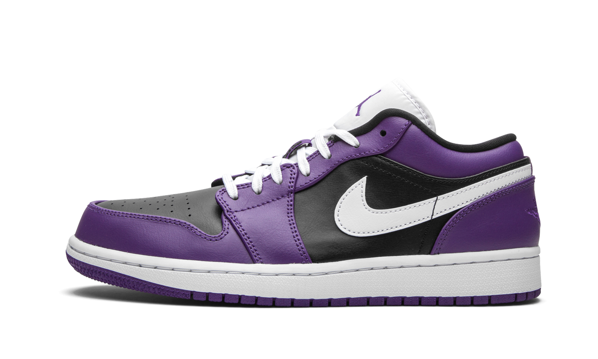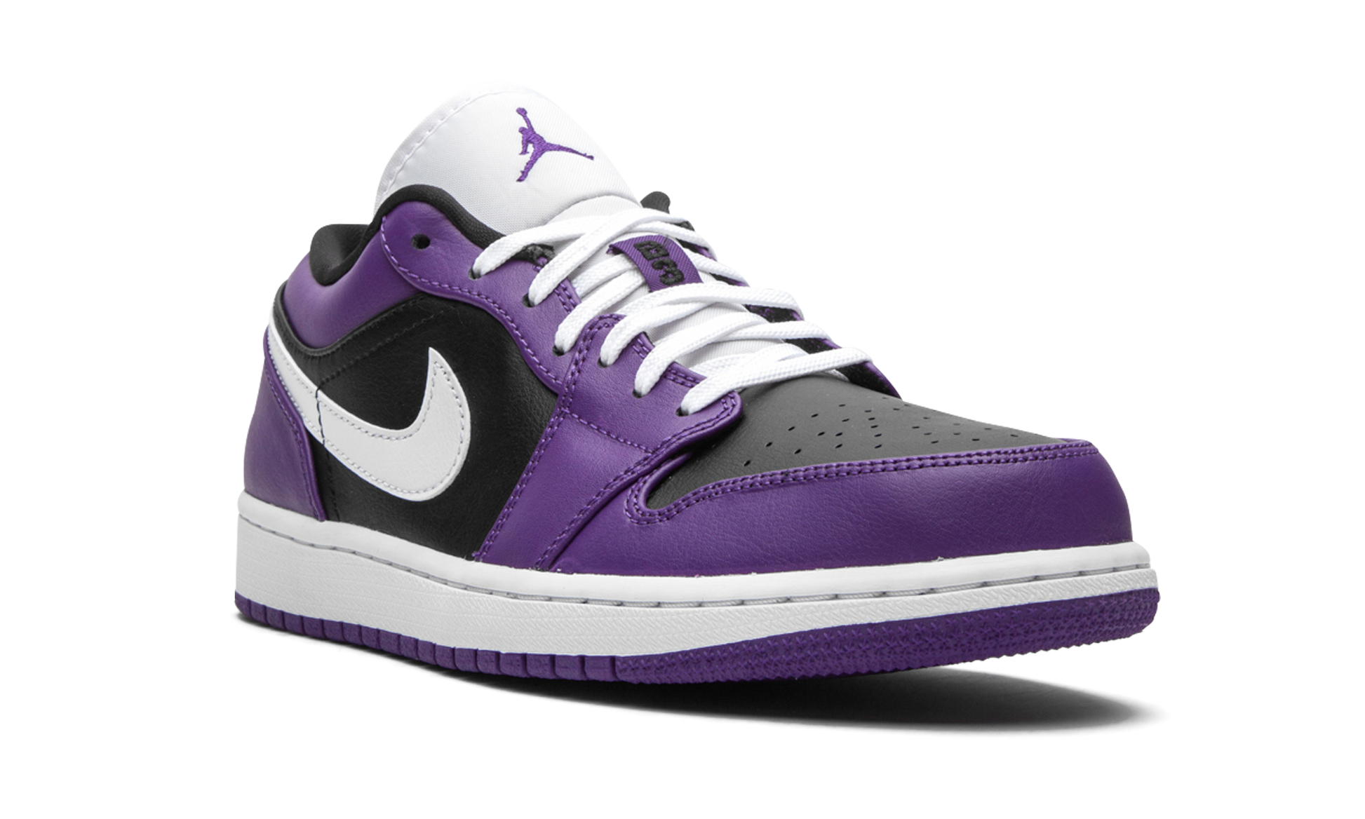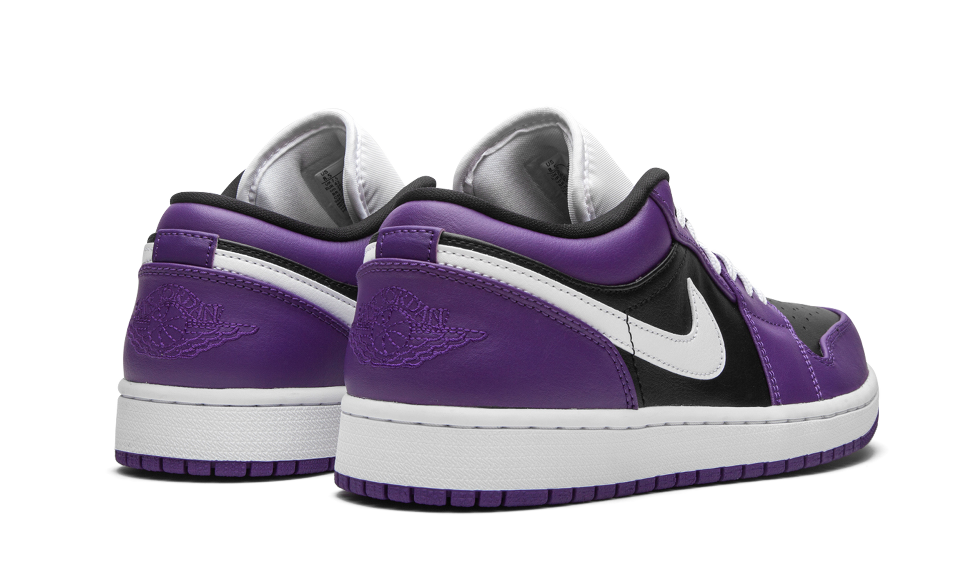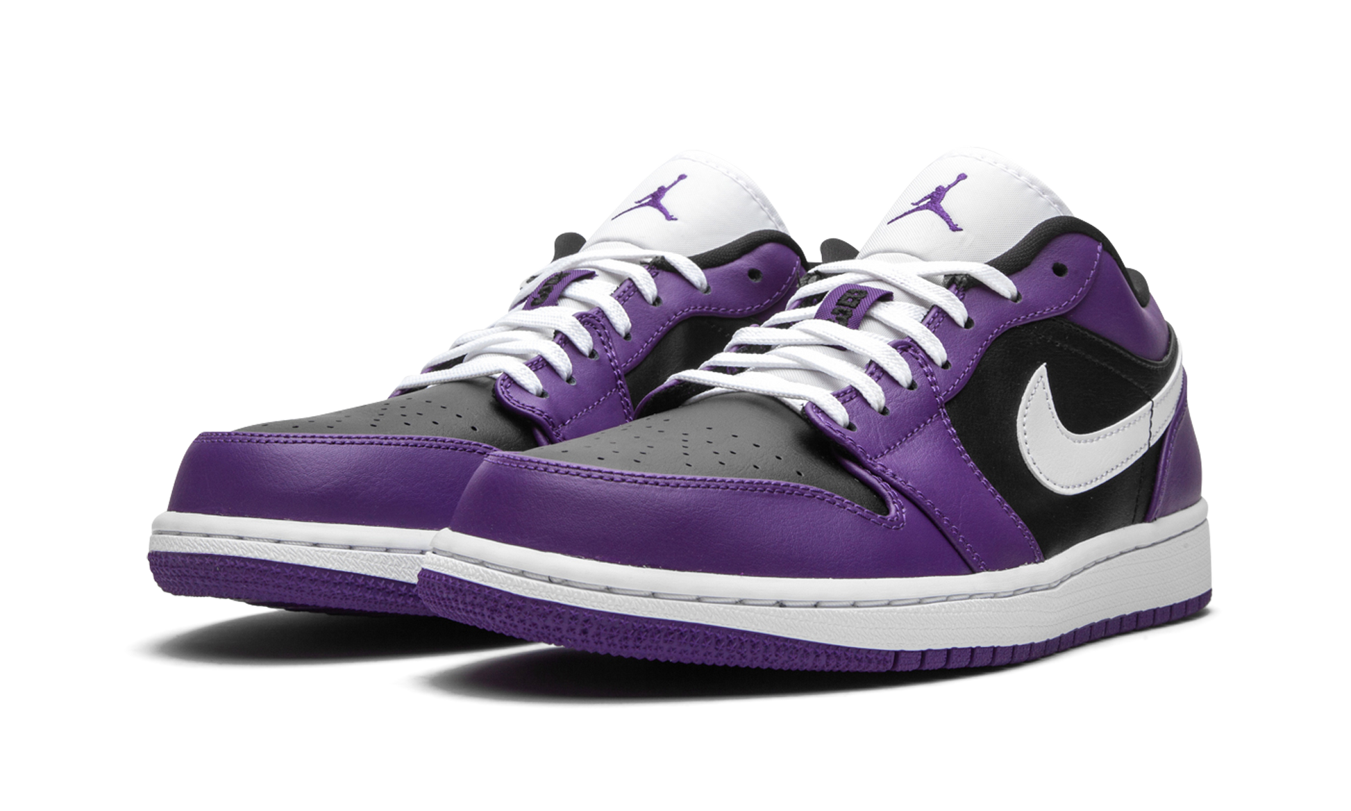 The Air Jordan 1 Low “Court Purple” finds Michael Jordan’s first signature shoe in low-top form in a decidedly regal colorway. Versatile as any Jordan 1 Low on the market, the “Court Purple” features a predominately two-tone color block of a black leather base visible on the perforated toe and mid-panel. Court Purple leather accenting can be found on the forefoot, eyelets, collar, and heel. White cotton laces, a white nylon tongue, and white leather Swoosh detailing on either side breaks up the dark appearance of the upper. A purple Jumpman insignia dots the tongue and tonal “Wings” embroidery is located on the heel. Court Purple