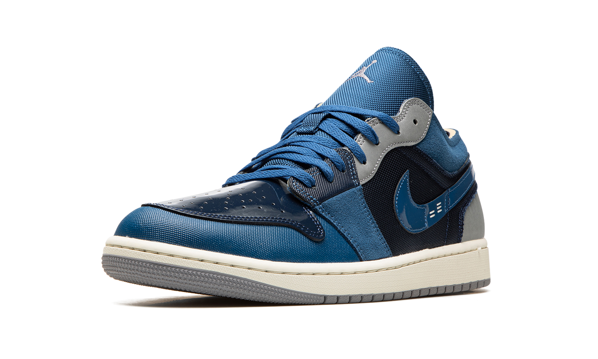 The Air Jordan 1 Low Craft “Obsidian” is a blue-based colorway of the modified version of the low-top shoe made from a unique combination of materials. The “Obsidian” Jordan 1 Low Craft is from a Nike collection of reconstructed “Craft” shoes. Here, the colorway features an upper designed in a mixture of leather, suede, and other textiles in Obsidian hues. Obsidian-colored patent leather is found on the perforated toe. Additional Obsidian accenting appears on the mesh mid-panel and mesh lower eyelet. French Blue detailing lands on the mesh toe cap, on the suede eyelet and suede collar, as well as on the leather Swoosh. Release date: November 8, 2022 Obsidian