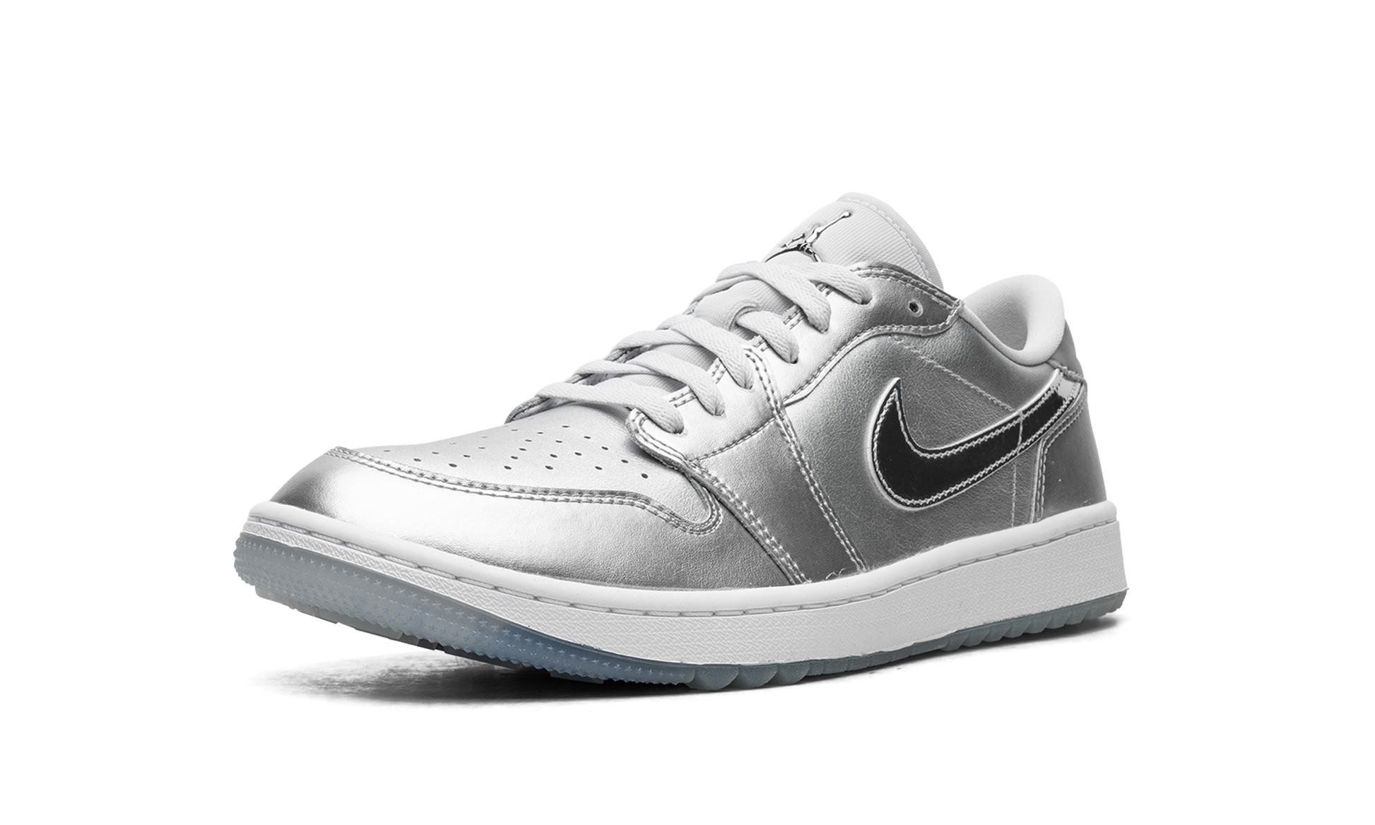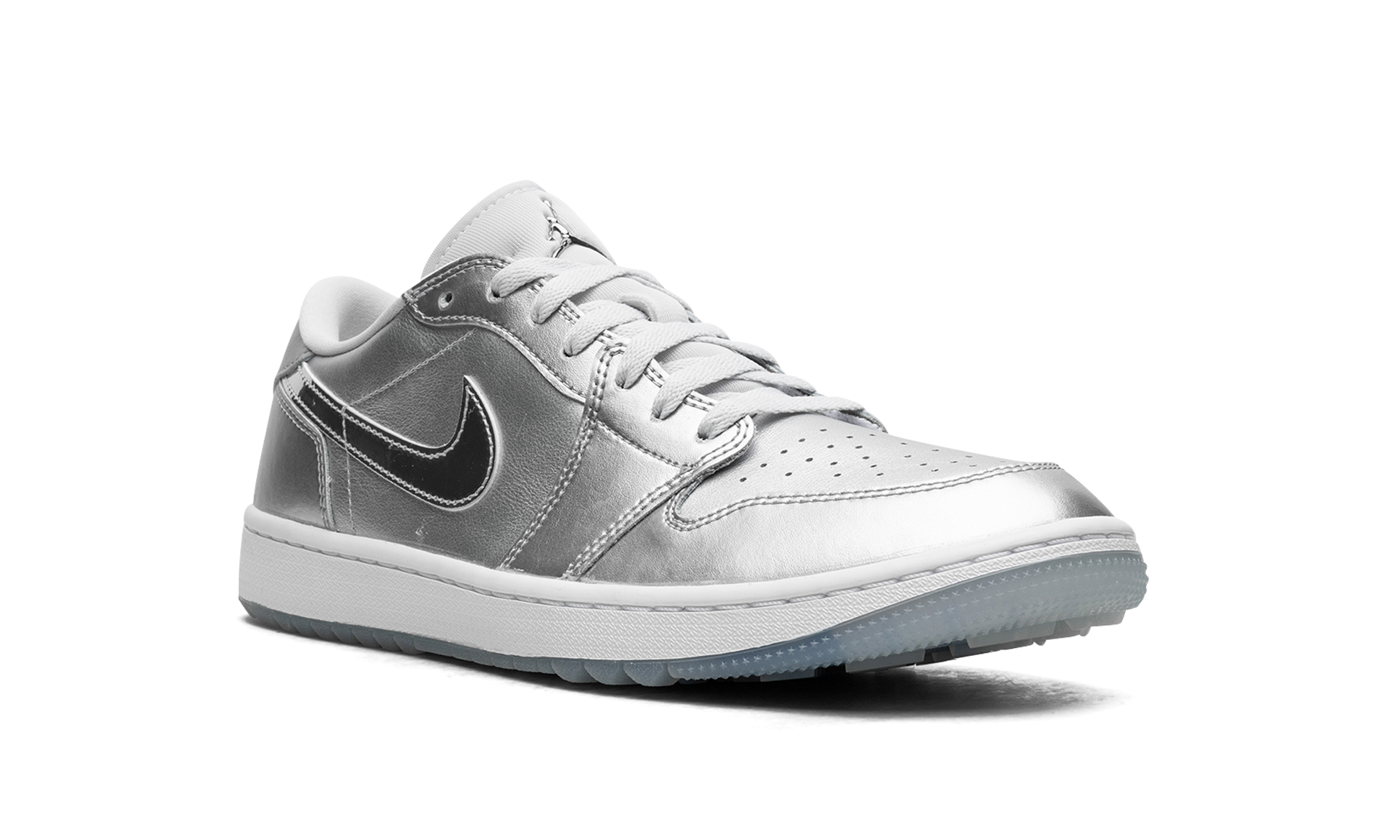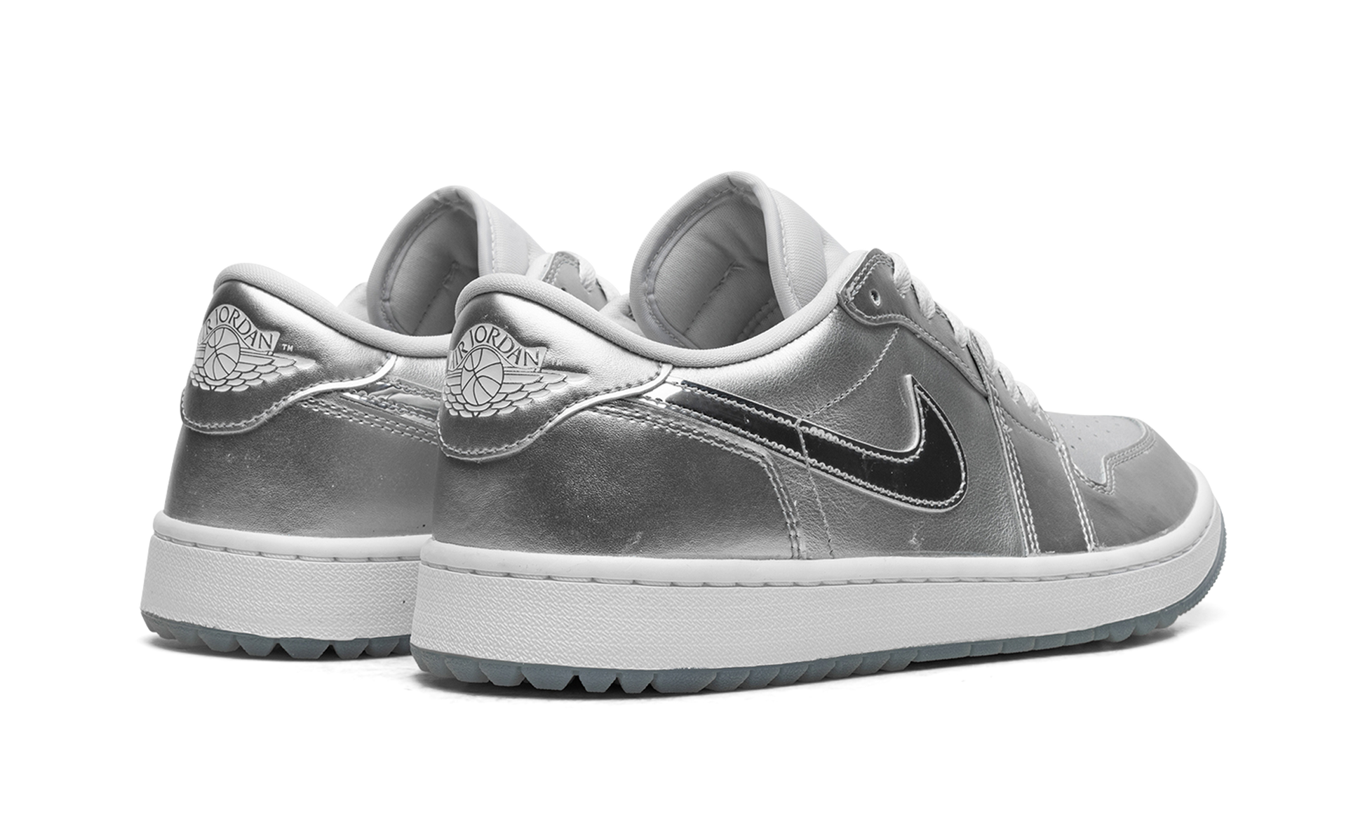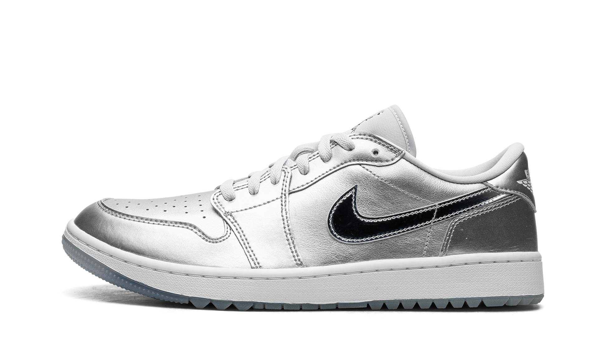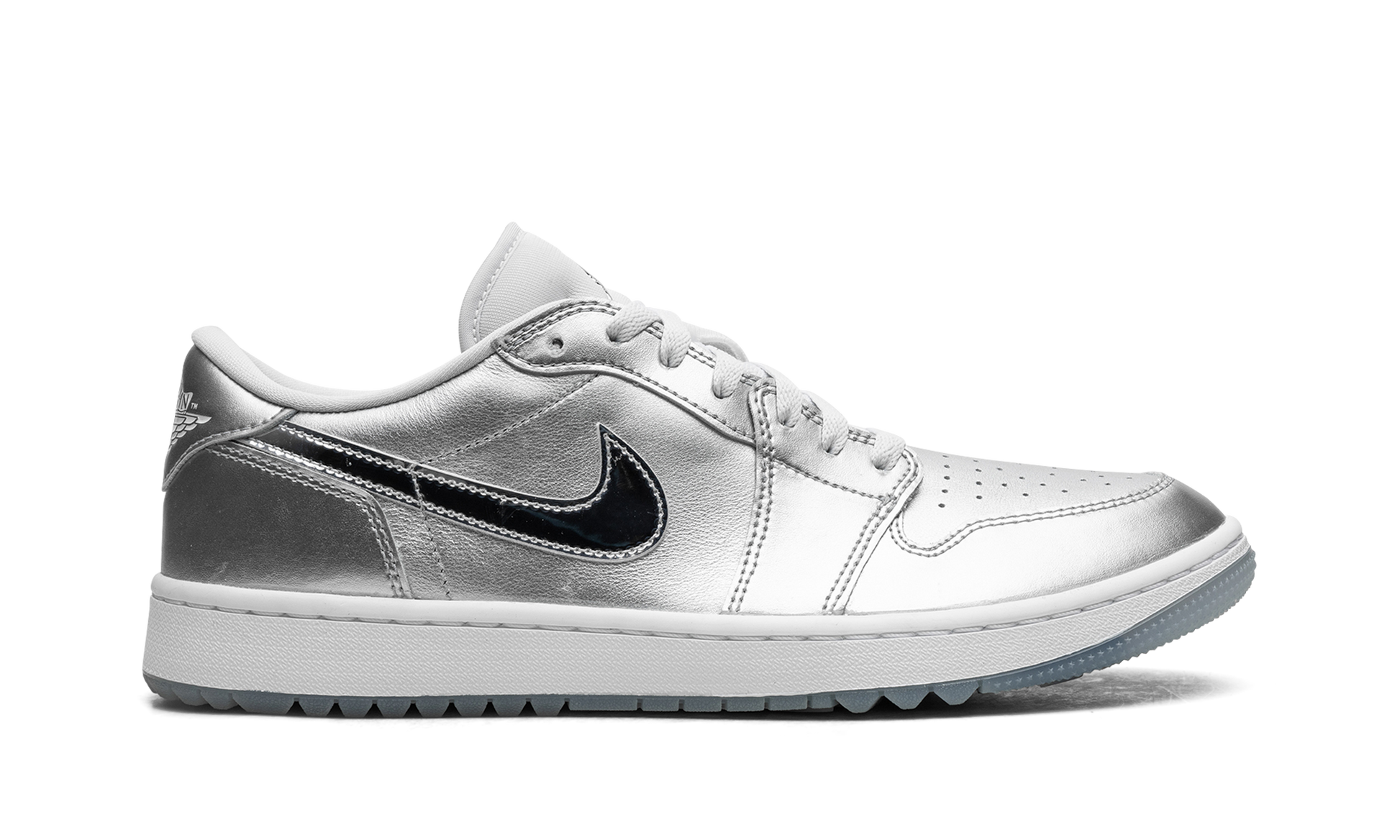 The Air Jordan 1 Low Golf "Gift Giving" is a colorway of the alternate version of the retro basketball shoe made for the golf course with an eye-catching, silver-based look. Loosely inspired by the Jordan 1’s “Tokyo” colorway that surfaced as part of Nike’s former “Concept Japan” or “Co.Jp” collection from the early 2000s, the “Gift Giving” features Metallic Silver accents throughout its design, with the flashy silver hue appearing on the base and overlays. A white leather Swoosh can be found on either side of the shoe. A “Wings” logo appears on the heel and a Metallic Silver Jumpman emblem is found on the tongue. Underfoot, a white rubber midsole and icy blue translucent outsole with small nubs completes the look. Release date: November 17, 2023 Gift Giving