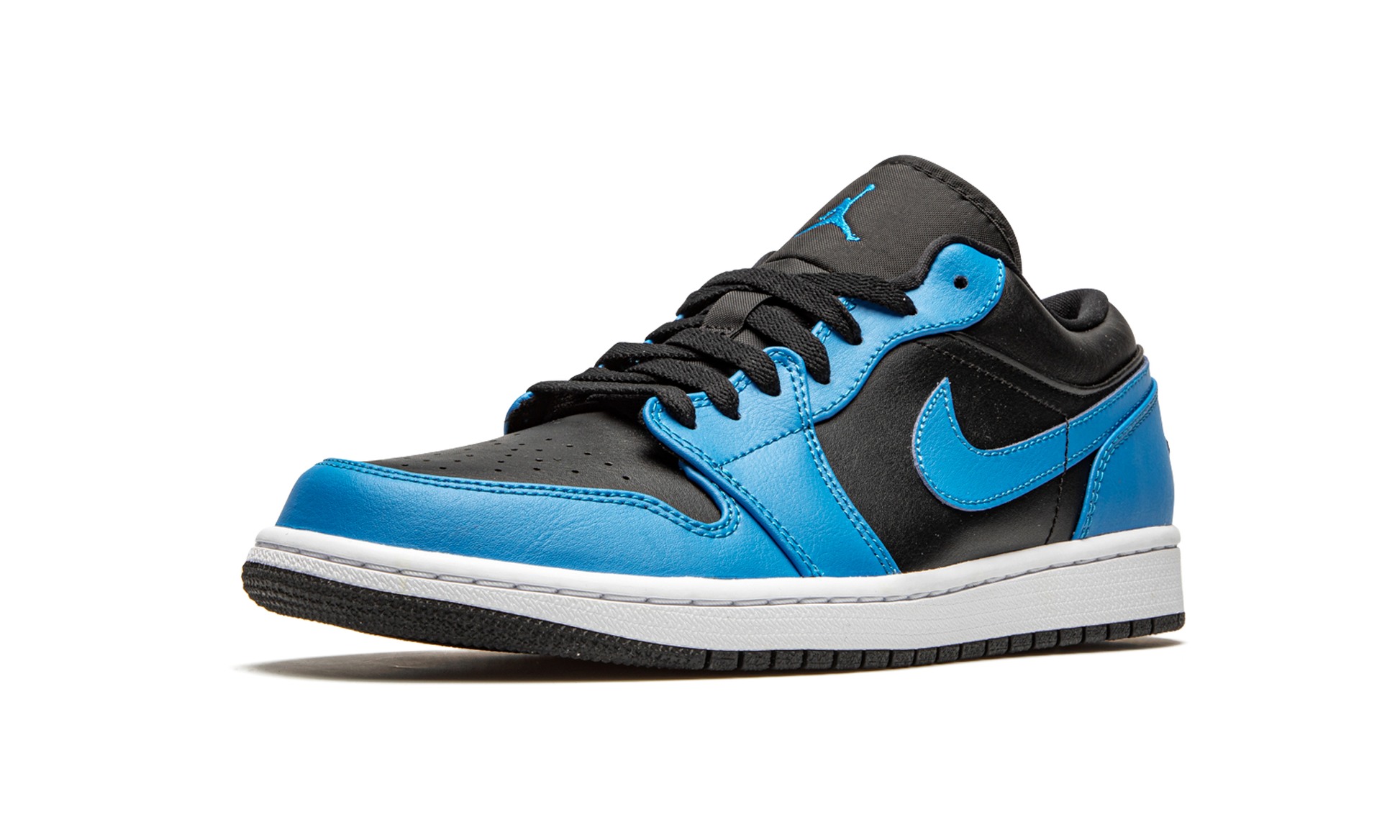The Air Jordan 1 Low “Laser Blue” is an intriguing colorway of Michael Jordan’s iconic first signature shoe in the versatile low-top silhouette. Released in Fall 2020, this Jordan 1 follows a similar color block to the “Bred” colorway of the Jordan 1 in that it features a black leather base, but instead of red, “Laser Blue” accenting appears in its place. The bright shade of blue can be found on the forefoot, eyelets, and heel. It also appears on the Swoosh insignia found on either side, and on the mini Jumpman emblem on the black nylon tongue. Black “Wings” embroidery is located on the heel. Laser Blue