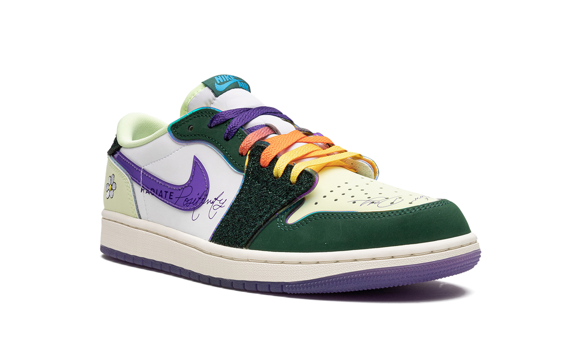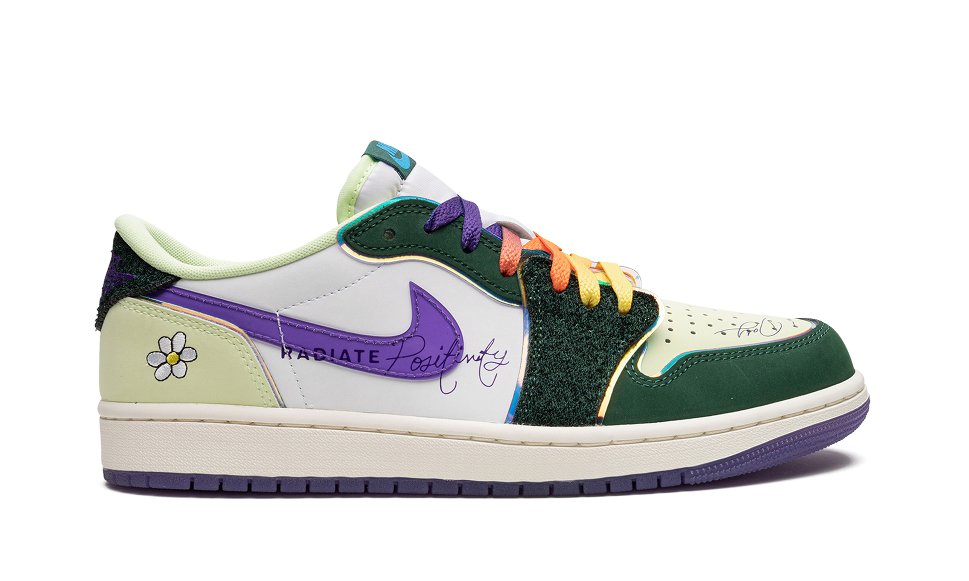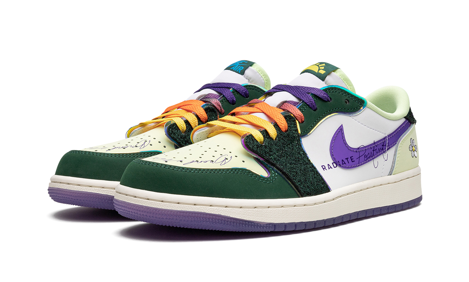 The Air Jordan 1 Low OG “Doernbecher” is a special colorway of the classic basketball shoe from Nike’s Doernbecher Freestyle collaboration with the Doernbecher Children’s Hospital of Portland, Oregon. Designed by patient Raddihi Mahajan, this creative look for the Jordan 1 Low OG features an eye-catching color scheme with unique branding elements. Specifically, the shoe has a Barely Volt perforated leather toe and heel. Hairy Gorge Green suede is found on the forefoot and on the leather toe cap and upper eyelet panel. Court Purple leather Swoosh branding appears on the sides. Raddihi adds her signature touches to the shoe with her own branding on toe, mid-panel, tongue, and insole. Doernbecher 2023