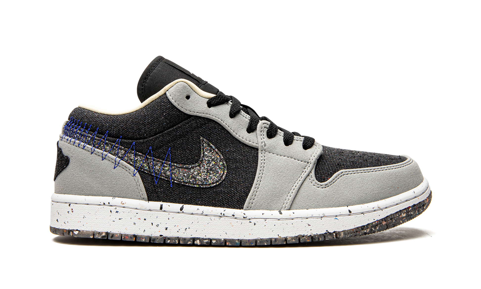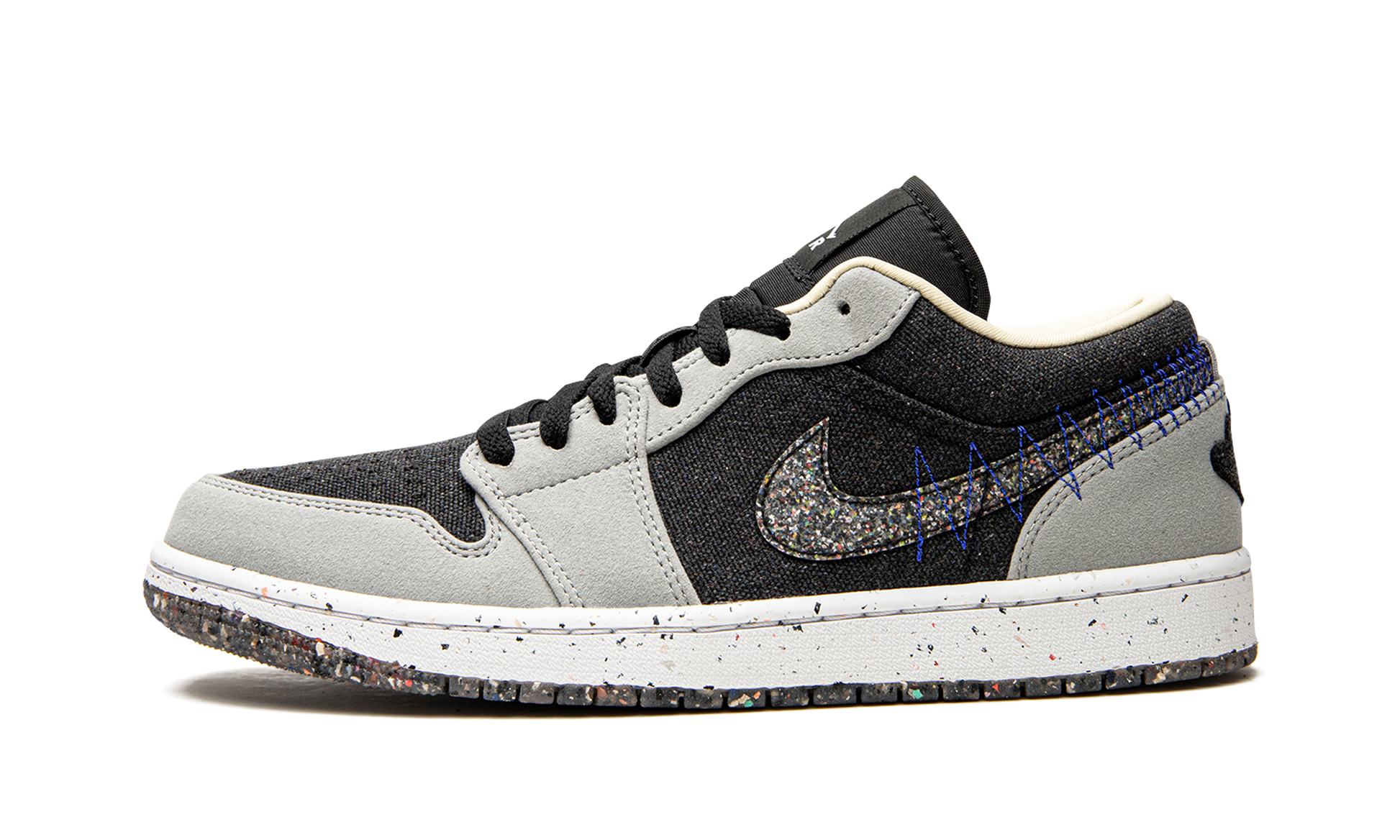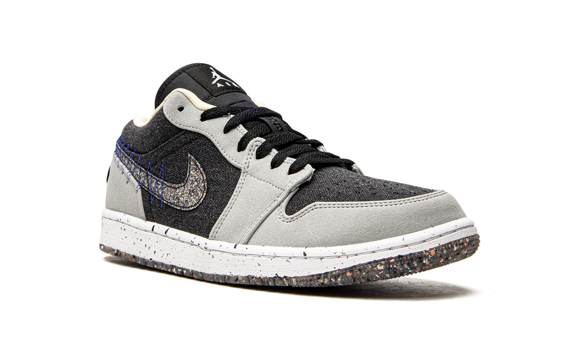 The Air Jordan 1 Low Crater “Light Smoke Grey” is an environmentally friendly version of the retro basketball shoe that was released in Fall 2021. A core offering from Nike’s “Move to Zero” initiative that places an emphasis on sustainability, the Jordan 1 Low Crater is an alternative to the standard Air Jordan 1 Low that is constructed from recycled materials. A lightweight black textile appears on the shoe’s perforated toe, mid-panel, and collar. The overlays are constructed from grey suede. A multicolor, threaded Swoosh composed of Nike Grind straps can be found on both sides and a modified, raised “Wings” graphic appears on the heel. Multicolor speckling on the white midsole and a Nike Grind outsole complete the look. Crater