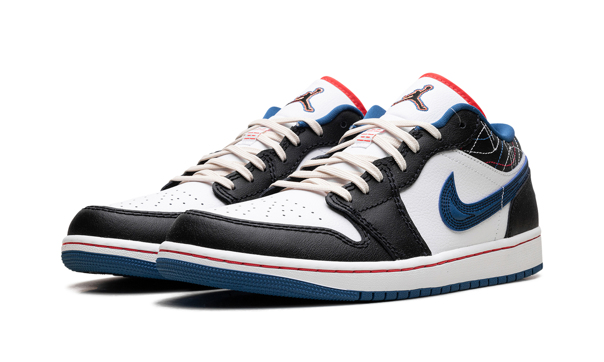 The Air Jordan 1 Low SE "Industrial Blue Sashiko'" is a colorway of Michael Jordan’s first signature shoe that features the decorative fabric of Japan on its design. Known for its durability and ability to patina over time with wear, sashiko is a popular fabric in the denim community, and it appears on the Jordan 1 Low’s Swoosh logo on the “Sashiko” colorway. As for the rest of the shoe, the upper features a white leather base and black leather overlays. Multicolor stitching can be found on the collar. A white midsole with a red contrast stitch, and an Industrial Blue outsole complete the look. Industrial Blue Sashiko