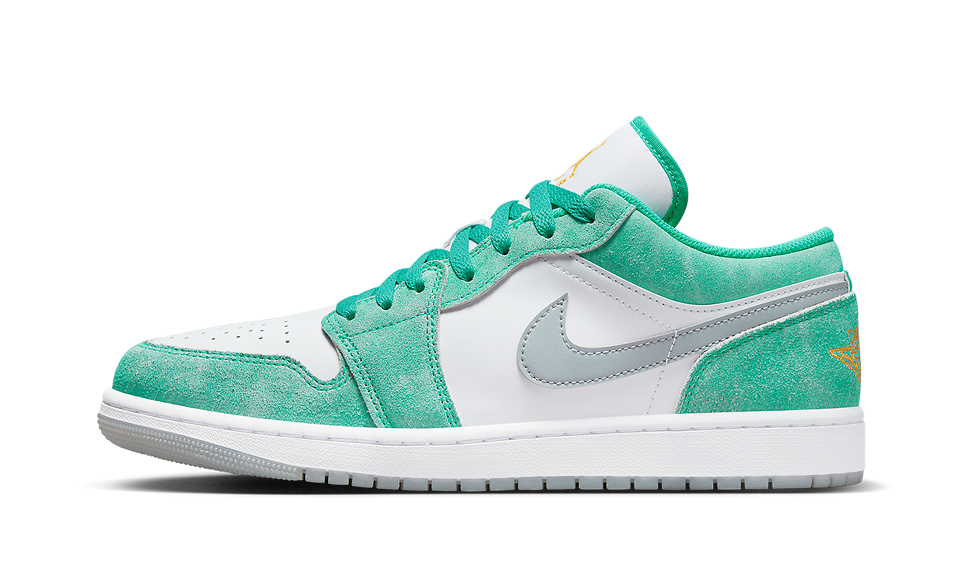 The Air Jordan 1 Low SE “New Emerald” is a clean look for the popular lifestyle shoe meant for casual wear. The “New Emerald” features white leather on its perforated toe and mid-panel. Contrasting New Emerald suede overlays contrast the neutral-colored base. A silver leather Swoosh appears on either side of the shoe while yellow “Wings” branding is embroidered on the heel. Both the Jumpman and “Air” logos on the white leather tongue are also designed in yellow. A two-tone, white midsole and grey rubber outsole completes the look. Release date: July 14, 2022 New Emerald