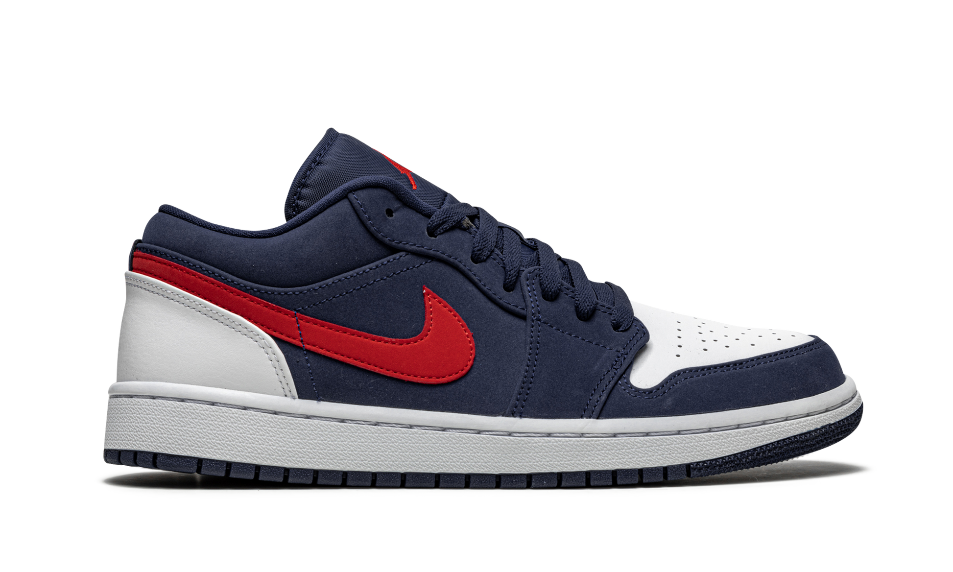 The Air Jordan 1 Low SE “USA” is a patriotic colorway of Michael Jordan’s first signature shoe in the popular low-top style. Jordan Brand’s dedication to elevating the Jordan 1 Low into the upper echelons of sneaker culture has seen the brand use the model in collaborations with Dior and Travis Scott since 2019. Here, the “USA” adds to the impressive assortment of Jordan 1 Lows by featuring the red, white, and blue color scheme of the American flag. A Midnight Navy suede material appears on the forefoot, mid-panel, collar, and eyelets. The University Red leather Swoosh logo on either side of the shoe breaks up the look. White leather can be found on the perforated toe and on the heel. A red embroidered Jumpman is stitched onto the navy blue nylon tongue. Finishing touches include a white rubber midsole and Midnight Navy outsole. USA