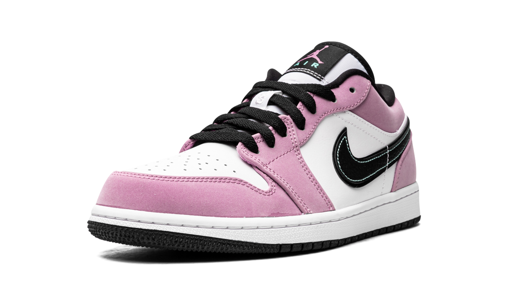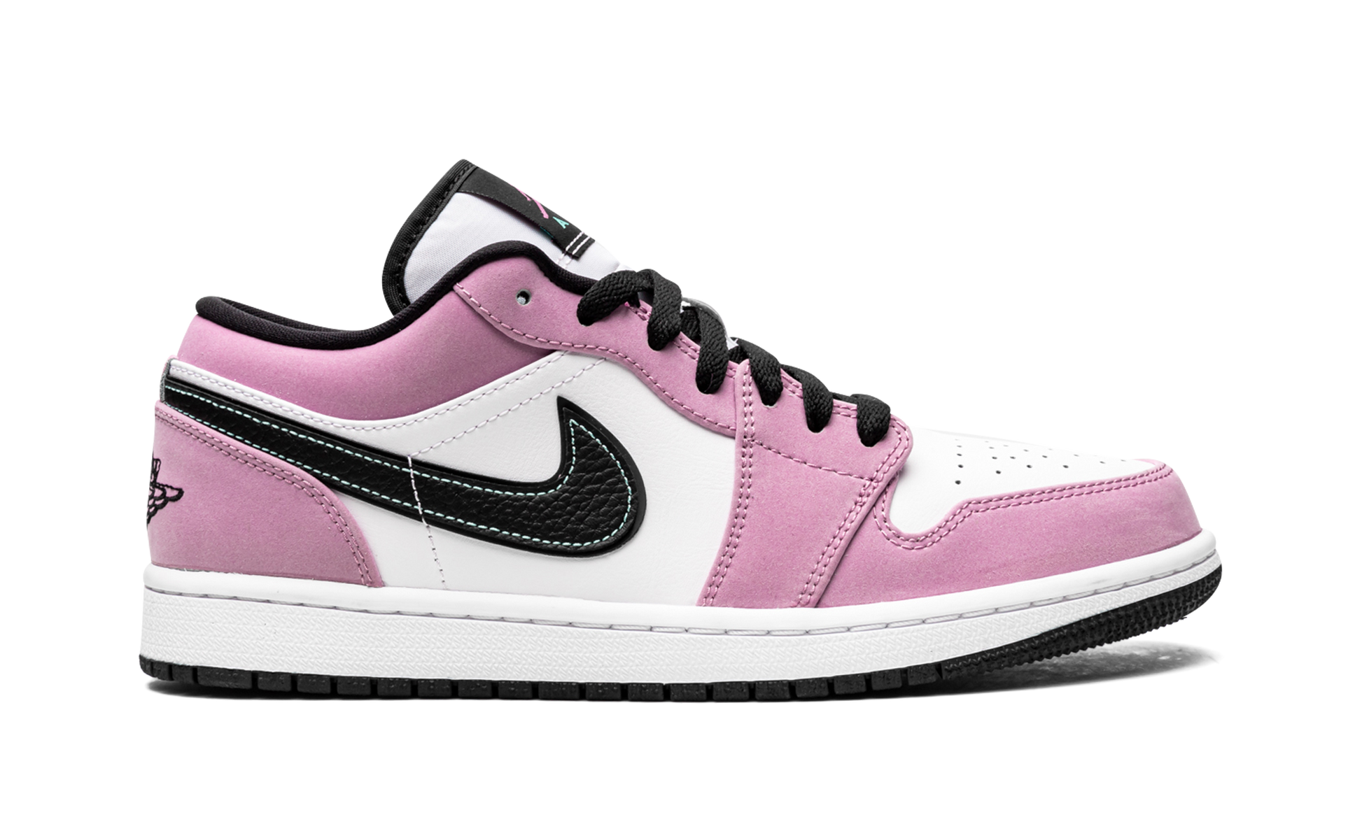 The Air Jordan 1 Low SE “Violet Shock” is a tropical take on the low-top edition of Michael Jordan’s first signature shoe. Debuting as part of Jordan Brand’s Spring/Summer 2021 release cycle, the “Violet Shock’s” purple-and-teal color block is slightly reminiscent of Nike’s popular “South Beach” design that has appeared on too-many-to name styles over the years. Plush Violet Shock suede can be found on the forefoot, eyelets, collar, and heel. The aforementioned pink panels contrast the white leather mid-panel and perforated toe. Contrast teal-colored stitching borders the black leather Swoosh on both sides and a black “Wings” logo is embroidered on the heel. A Violet Shock Jumpman is printed above teal “Air” branding on the black nylon tongue tag stitched onto the white nylon tongue. Violet Shock