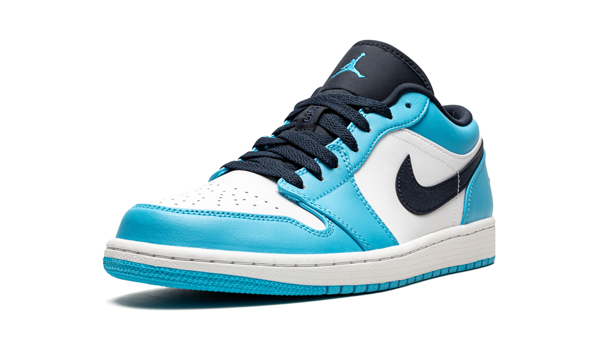The Air Jordan 1 Low “UNC” is a college basketball-themed colorway of the low-top edition of Michael Jordan’s first signature shoe. An original color option on the Air Jordan 1 by Nike from 1985, the “UNC” theme refers to the white-and-blue team uniform colors of the North Carolina Tar Heels, Michael’s alma mater. Where many “UNC” inspired Air Jordans feature University Blue accents, the Jordan 1 Low seen here opts for Powder Blue detailing. The Powder Blue shade previously appeared on the original Air Jordan 9 “Powder Blue” in 1993 and on the Air Jordan 10 of the same nickname in 1994. On this shoe, white leather can be found on the perforated toe and mid-panel. Contrasting Powder Blue overlays appear on the forefoot, eyelets, collar, and heel. An Obsidian (dark blue) leather Swoosh with subtle Powder Blue contrast stitching graces both sides and a “Wings” logo is embroidered onto the heel. A blue Jumpman appears on the dark blue nylon tongue and tonal “23” branding can be found on the black lace overlay. UNC