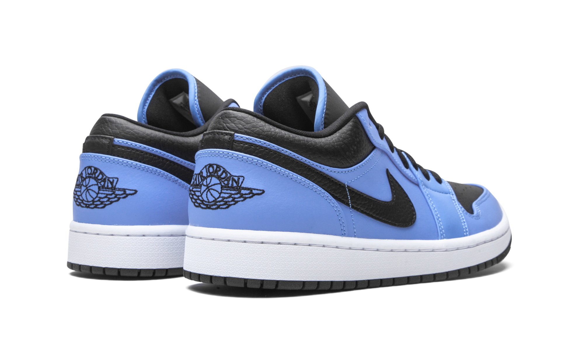 The Air Jordan 1 Low “University Blue/Black” is a collegiate inspired look for the low-top version of Michael Jordan’s first signature shoe. The “University Blue/Black” undoubtedly references the UNC Tar Heels by employing the school’s shade of light blue in its design. The Carolina Blue hue appears on the leather overlays on the forefoot, eyelets, mid-panel, and heel. Black leather can be found on the toe, collar, and Swoosh branding on either side of the shoe. Elsewhere, a black embroidered “Wings” emblem is stitched onto the heel and a University Blue Jumpman appears on the black nylon tongue. Jordan Brand finishes off the look with a white midsole and contrasting black outsole. University Blue / Black