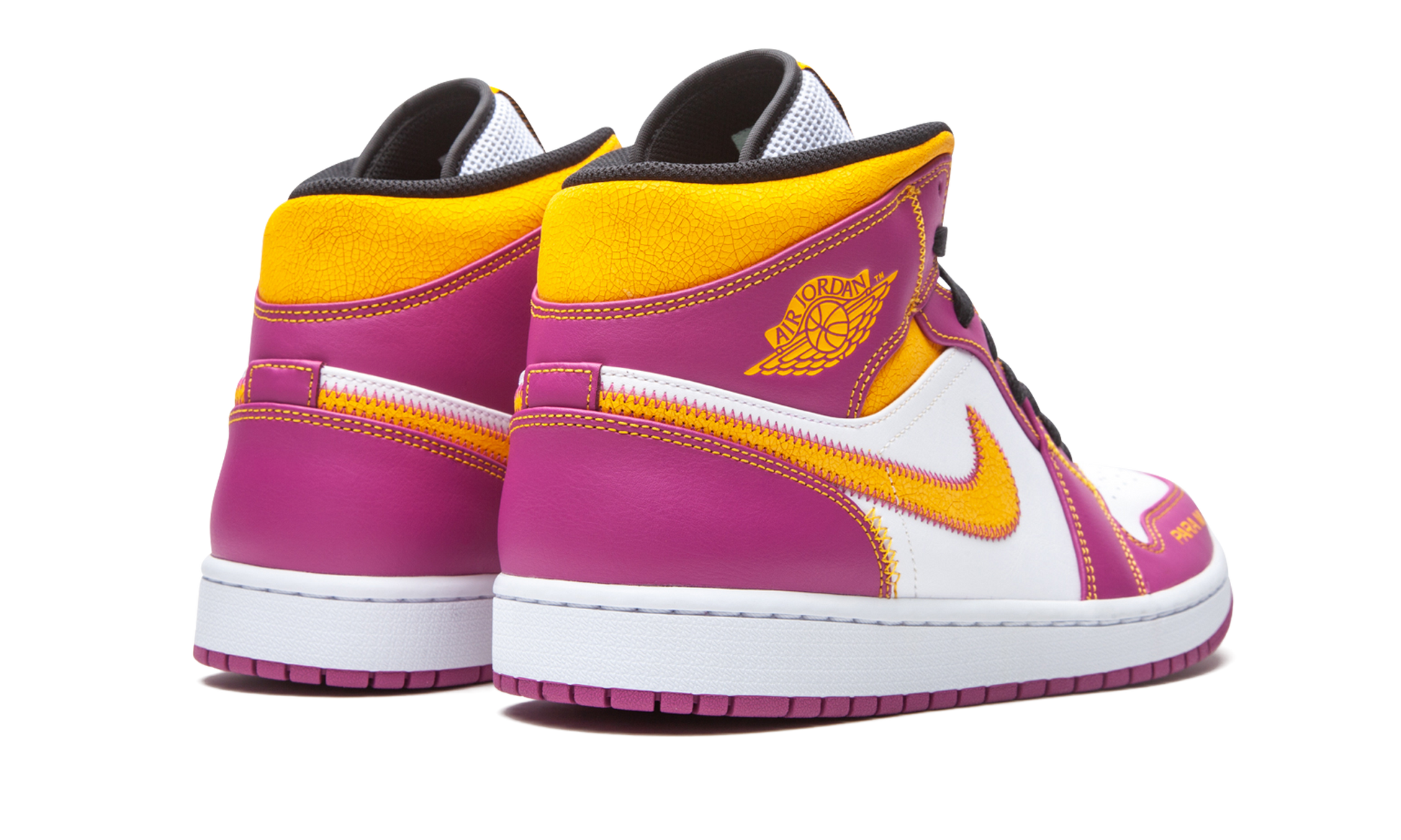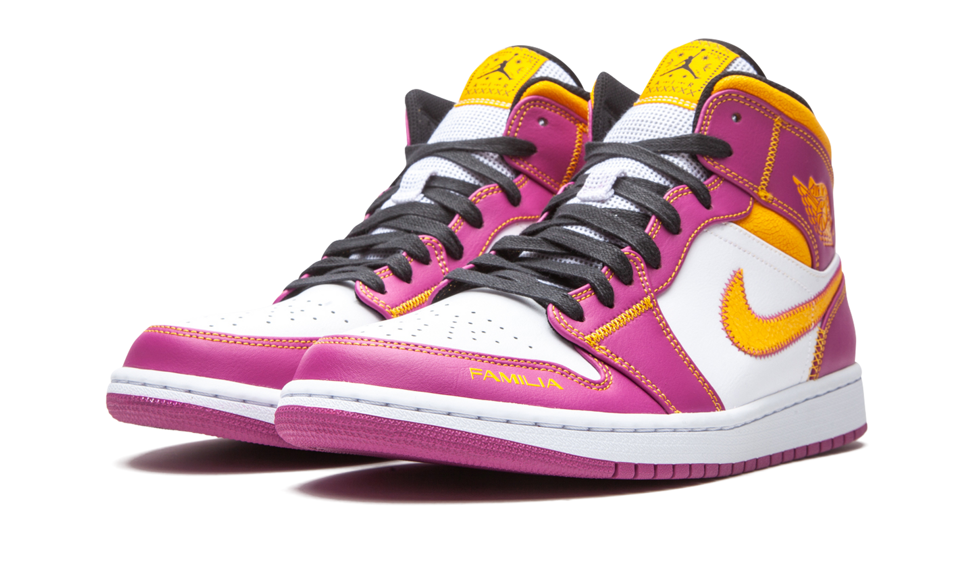 The Air Jordan 1 Mid “Dia de los Muertos” is a special colorway of Michael Jordan’s first signature shoe dedicated to the traditional Mexican holiday. Part of Nike’s Fall 2020 “Dia de los Muertos” collection, the mid-top version of the retro basketball and lifestyle shoe features a family-inspired design consisting of colors found in traditional floral ofrendas (also known as altars) that are displayed during the holiday to commemorate the lives of those who have transitioned. White leather appears on the perforated toe and the mid-panel. Jordan Brand contrasts the neutral base with fuchsia leather detailing on the forefoot, eyelets, collar, and mid-panel. The cracked yellow Swoosh and collar provide a personalized touch. The “Dia de los Muertos” features a heritage inspired gold nylon tongue tag and “Familia” embroidery on the forefoot. Release date: October 15, 2020. Dia de los Muertos