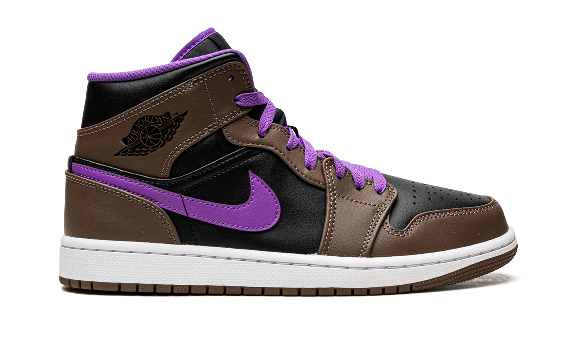 The Air Jordan 1 Mid “Palomino” is a unique colorway of the popular sneaker that features a neutral-colored design, but with a twist. The “Palomino” is complete with a black leather base that gives way to brown leather overlays throughout. A Wild Berry leather Swoosh appears on either side of the shoe. The purple hue reappears on the Jumpman and “Air” branding on the tongue, on the interior of the sneaker, and on the laces. Classic black “Wings” branding is found on the collar. Underfoot, a white midsole and brown rubber outsole put the finishing touches on the design. Palomino