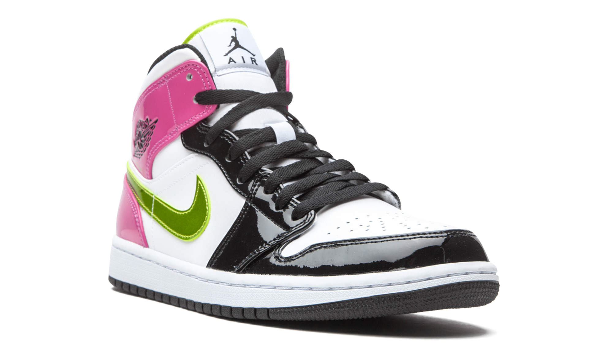 The Women’s Air Jordan 1 Mid SE “Cyber/Active Fuchsia” is a vivacious colorway of Michael Jordan’s first signature shoe in its mid-top silhouette. Fitted in women’s sizing, the “Cyber/Active Fuchsia” Jordan 1 Mid evokes summer’s casual and carefree vibes thanks to its eccentric design that combines materials, textures, and colors in a unique new way. Glossy black patent leather overlays appear on the forefoot, toe cap, and eyelets. The same premium patent leather detailing is used again on the Active Fuchsia collar and heel overlays. A variety of smooth white leather forms the base of the upper. Elsewhere, a dark neon green patent leather Swoosh logo can be found on each lateral side while blue Swooshes are present on the medial sides. A black leather “Wings” emblem is located on the collar. Other details include a white nylon tongue with green accenting on the top, a black Jumpman on the tonal nylon tongue tag, and a black liner. The white rubber outsole and black outsole finish off the look of this casual lifestyle look for the Women’s Air Jordan 1 Mid. Cyber / Active Fuchsia