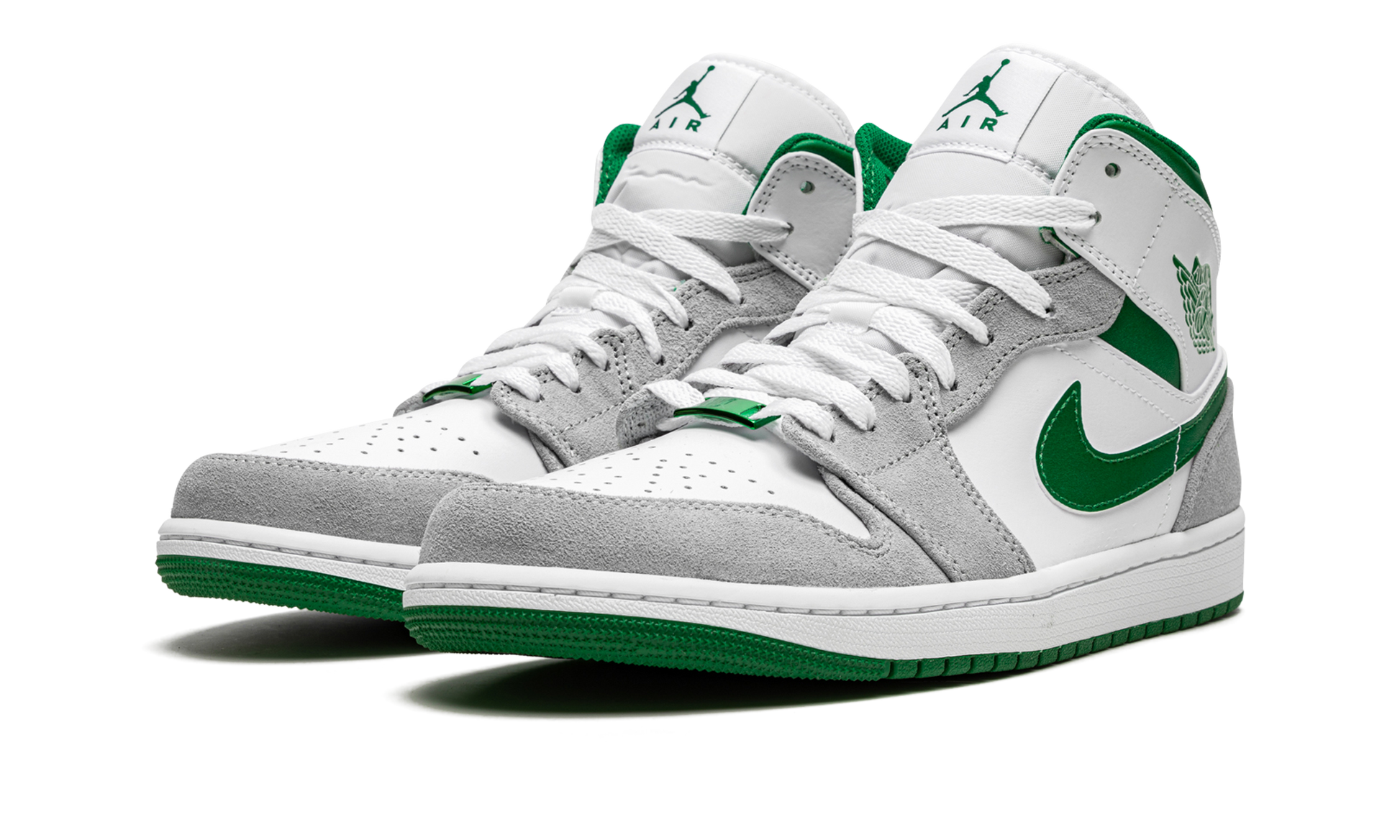 The Air Jordan 1 Mid SE “Grey/Pine Green/White” is clean look for the lifestyle shoe that combines suede and leather materials. From Jordan Brand’s 2021 collection, the “Grey/Pine Green/White” variation of Michael Jordan’s first signature shoe makes use of a Boston Celtics-esque team color palette of green and white, and also adds grey. The perforated toe and mid-panel appear in white leather. Light Smoke Grey suede overlays can be found on the forefoot, eyelets, and heel. A Pine Green leather Swoosh graces either side and a green “Wings” logo is located on the collar. Additional Pine Green detailing comes into play on the leather collar and on the Jumpman and “Air” branding on the white nylon tongue tag. A two-tone, white midsole and green rubber outsole complete the look. Grey / Pine Green / White