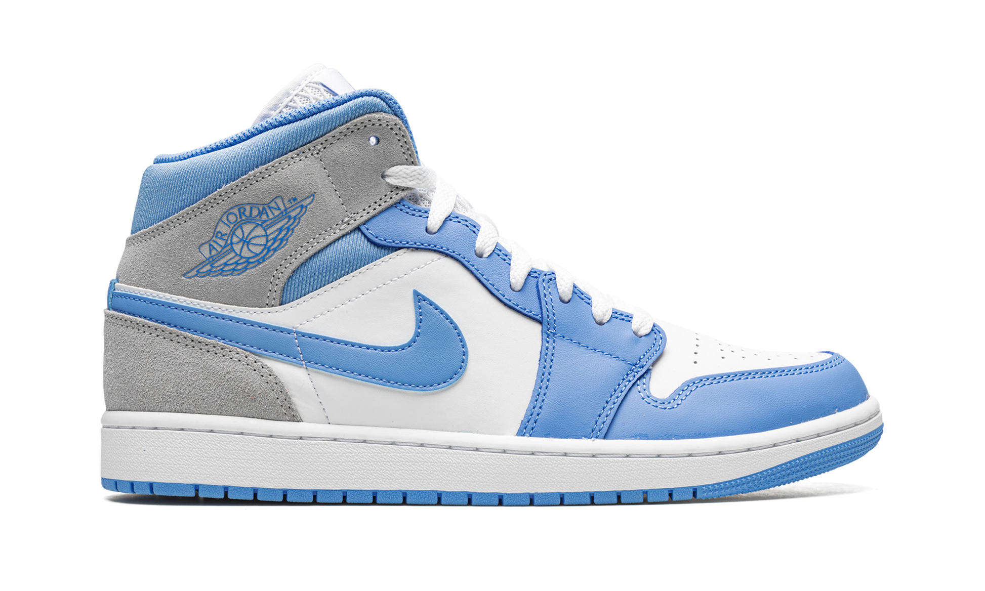 The Air Jordan 1 Mid SE “University Blue/Grey” is a colorway of the lifestyle shoe with a “UNC” inspired appearance. In no way affiliated with the University of North Carolina, the “University Blue/Grey” nonetheless shows appreciation for the school with its use of the school’s sports team’s uniform colors on its design. The shoe is complete with a white leather base with University Blue leather overlays and Swoosh branding. Grey suede can be found on the collar and heel. A classic “Wings” logo resides on the aforementioned ankle collar panel. University Blue Jumpman and “Air” logos appear on the tongue tag on the white mesh tongue. University Blue / Grey