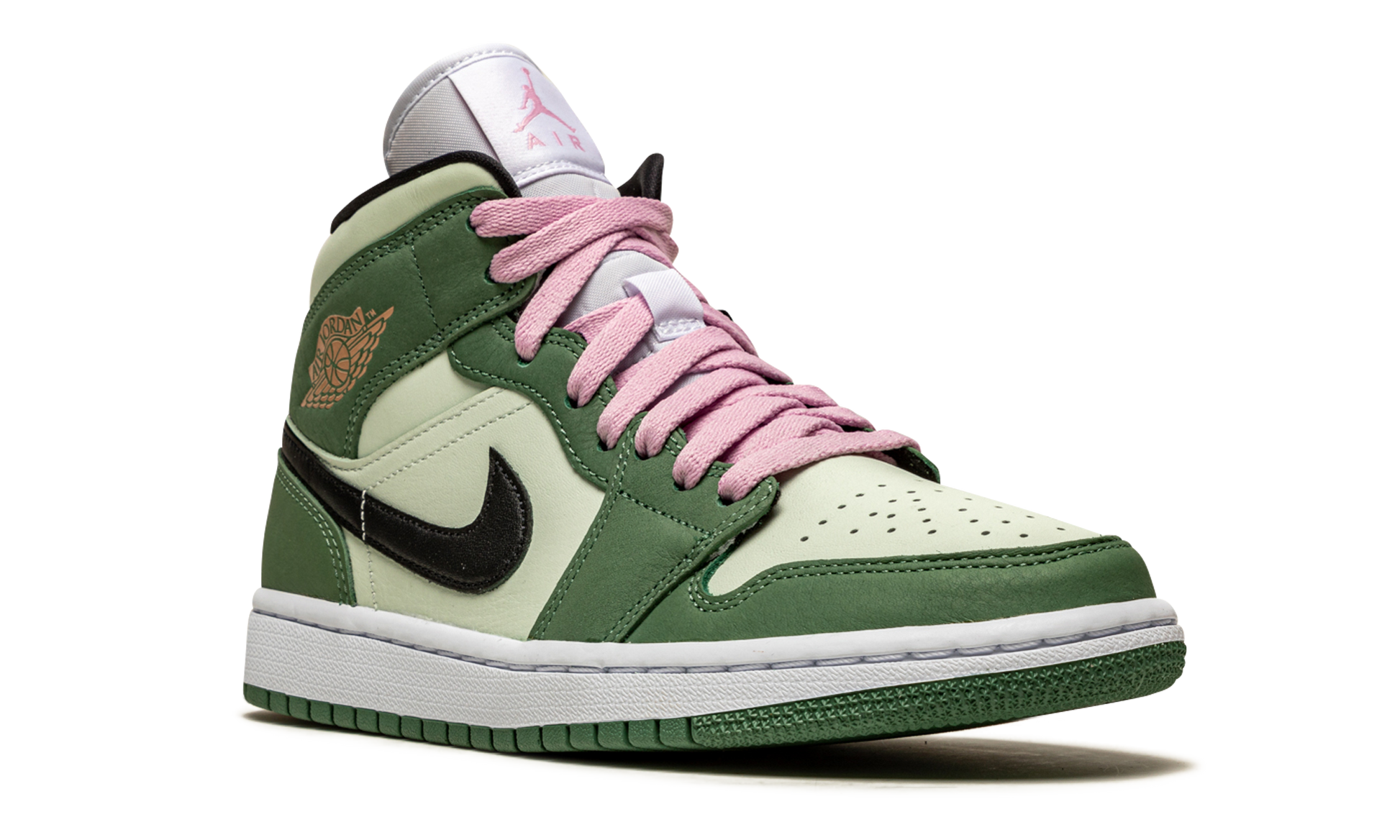 The Women’s Air Jordan 1 Mid SE “Dutch Green” is a unique look for Michael Jordan’s first signature shoe in women’s sizing. Featuring a distinctly earth tone color palette, the “Dutch Green” has a Barely Green or mint leather on the perforated toe and on the mid-panel and collar. Dutch Green leather detailing appears on the forefoot, eyelets, collar, and heel. A black leather Swoosh on the mid-panel breaks up the look. A dusty pink “Wings” logo appears on the collar and a pink Jumpman graces the tag on the white nylon tongue. Interestingly, Jordan Brand opts for pink laces here, a style move that may reference the laces found on Travis Scott’s limited Air Jordan 1 collaboration from 2019. A white midsole and Dutch Green outsole complete the look. Dutch Green