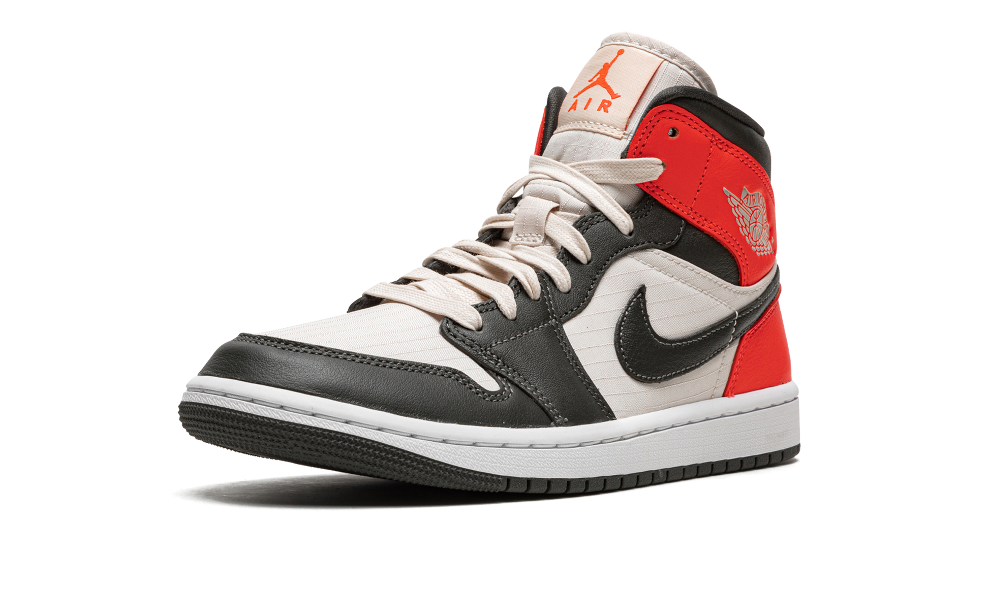 The Women’s Air Jordan 1 Mid SE “Newsprint” is a women’s-exclusive colorway of the vintage basketball shoe that features a unique combination of materials on its design. Released in December 2021, the “Newsprint” colorway is complete with a Light Orewood Brown-colored ripstop nylon base. The toe cap, forefoot, eyelets, and collar are designed in a black Newsprint-colored leather. Both the Swoosh and outsole are also featured in Newsprint, as well. A tan “Wings” logo is found on the Bright Crimson leather collar overlay. Additional Bright Crimson detailing appears in the form of a leather heel panel and a Jumpman logo on the tongue tag. Underfoot, a white midsole and black rubber outsole complete the look. Newsprint