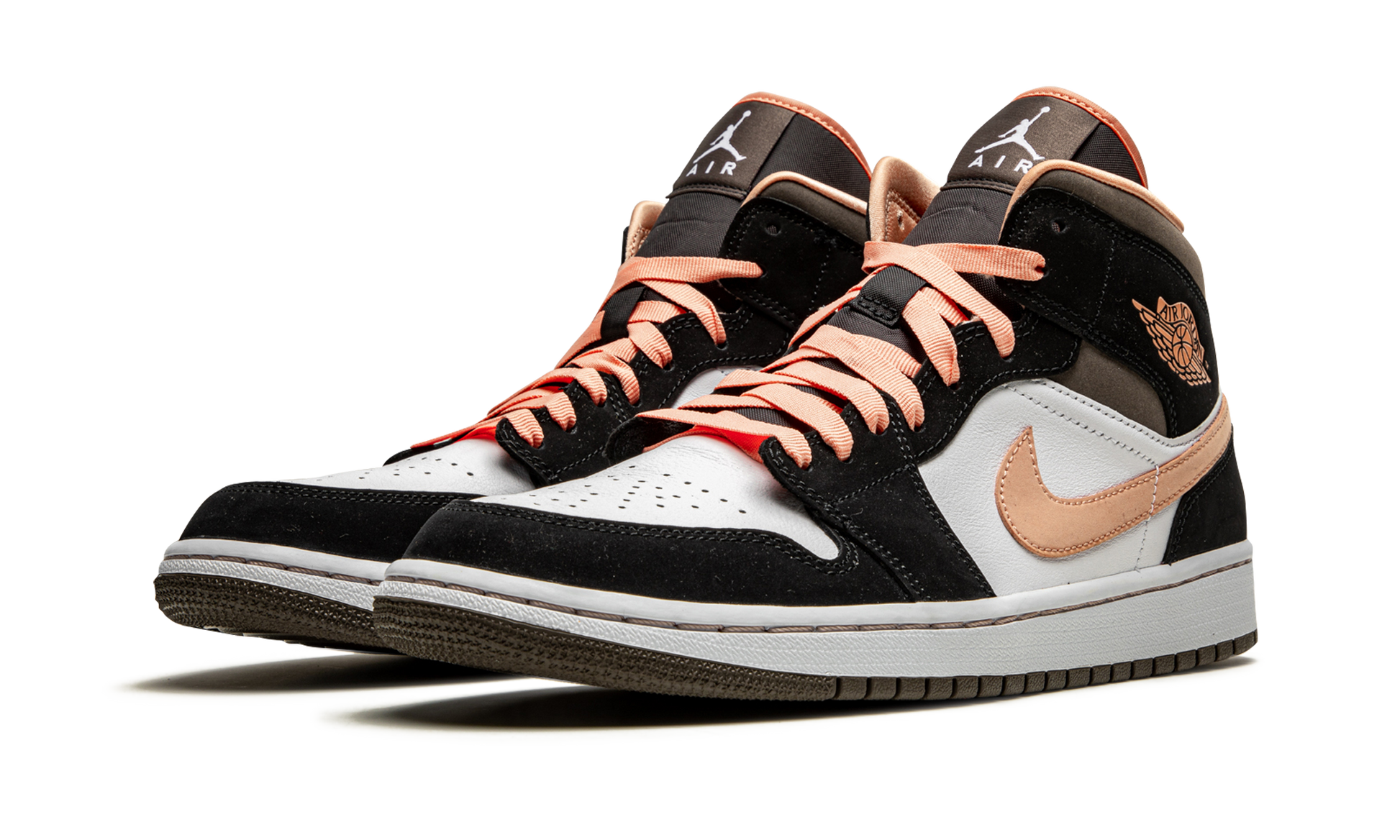 The Women’s Air Jordan 1 Mid “Peach Mocha” is a women’s edition of Michael Jordan’s first signature shoe in a spring and summer-ready colorway. The alternate Jordan 1 Mid debuted in 2007 as part of the “New/Old Love” pack that paid homage to Michael’s love of basketball and his newfound appreciation for competitive motorsports. In the years since, the Jordan 1 Mid has become one of the most popular and creative canvases for Jordan Brand, which is exemplified by this “Peach Mocha” design. Black synthetic nubuck overlays on the forefoot, eyestay, collar, and heel contrast the upper’s white leather base while a Peach leather Swoosh can be found on either side of the shoe. The same pinkish hue appears on the “Wings” branding on the collar and on the laces on top of the black nylon tongue. A white Jumpman logo graces the branding tag stitched onto the tongue to finish off the look. Peach Mocha