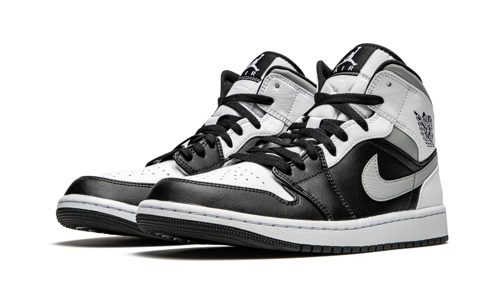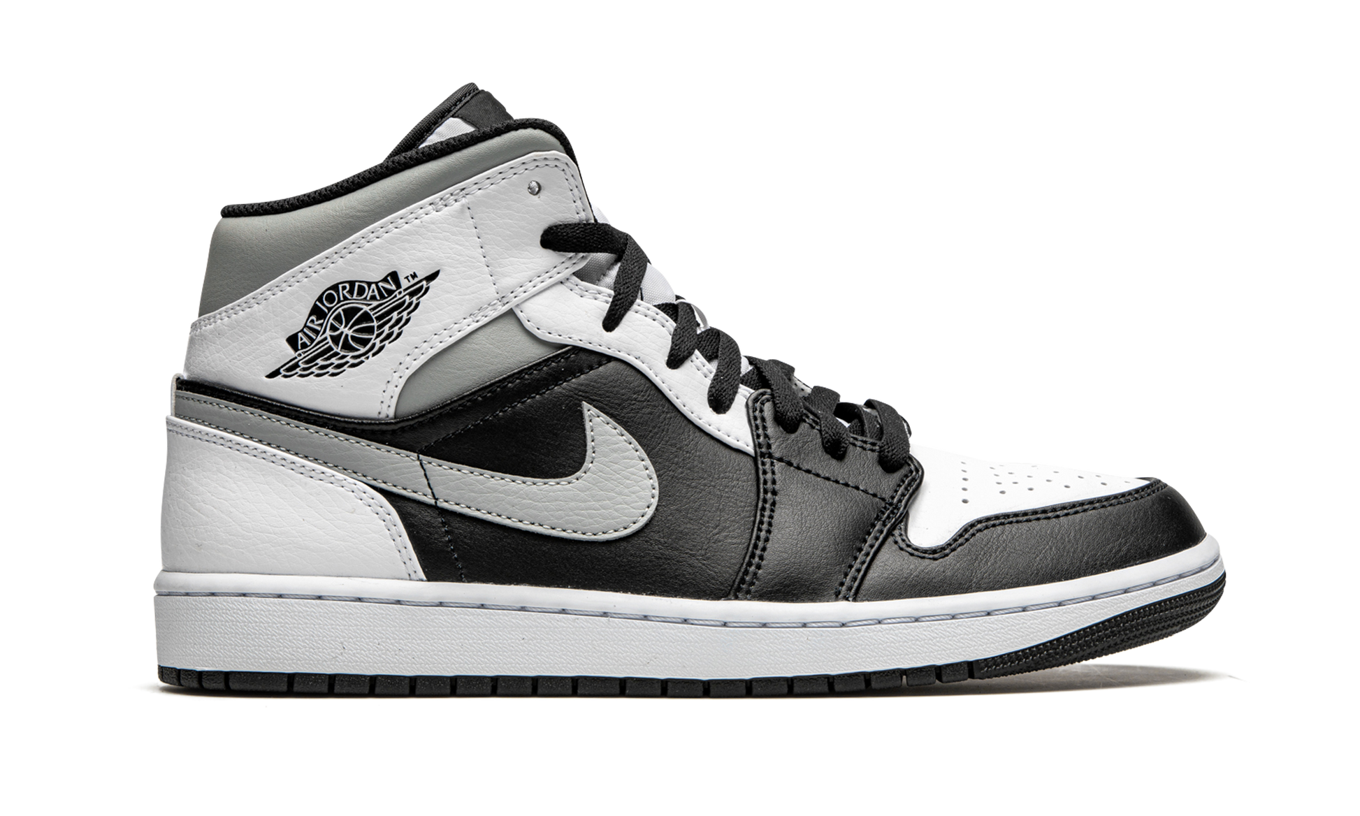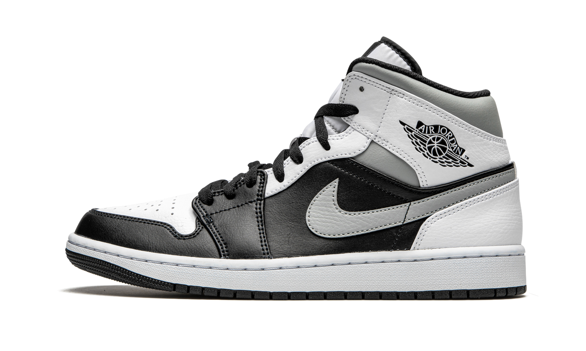 The Air Jordan 1 Mid “White Shadow” highlights the wearability of Michael Jordan’s first signature shoe in its mid-top design by making use of a clean, neutral based color scheme. The upper of this "White Shadow" colorway is complete with white leather on the perforated toe, upper eyelets, collar overlay, and heel. A variety of smooth black leather is located on the forefoot overlay and mid-panel. Light Smoke Grey Swoosh branding appears on the sides and a black leather “Wings” logo resides on the collar. A white Jumpman emblem can be found on the black nylon tongue tag stitched onto the white nylon tongue. The "White Shadow" nickname is in reference to this colorway appearing similar to the original black and grey "Shadow" colorway from 1985, just with added white panels. Release date: November 27, 2020. White Shadow