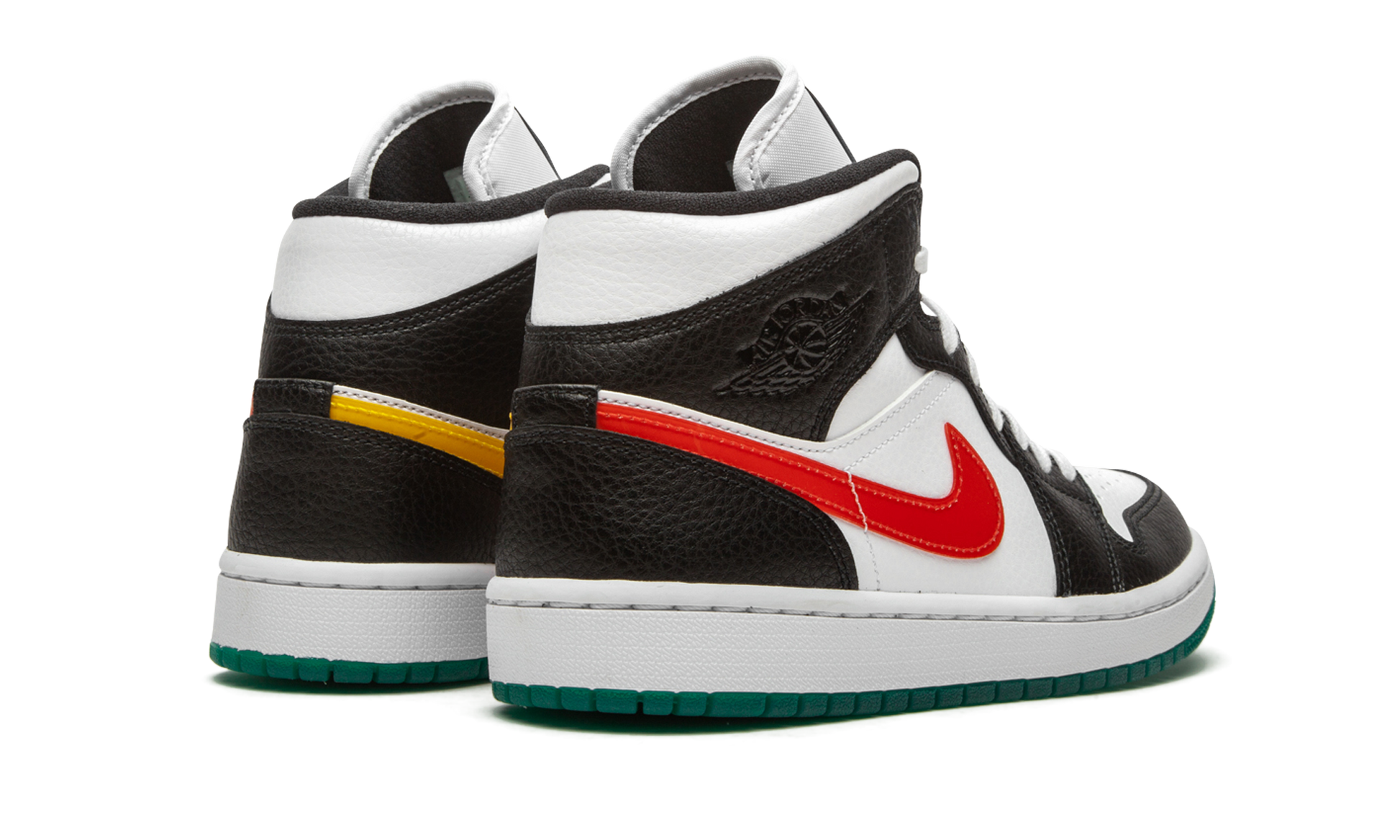 The Women’s Air Jordan 1 Mid “Alternate Swooshes” shuffles the design of Michael Jordan’s first signature shoe in mid-top height with alternating Swoosh logo colors. Fitted in women’s sizing, this Jordan 1 Mid features a unique appearance that caters to the lifestyle look. Key design elements include white leather detailing on the perforated toe, mid-panel, and collar. Contrasting black tumbled leather overlays on the forefoot, eyelets, collar, and heel stand out against the crisp white base. A University Red leather Swoosh can be found on the outside of the shoe and a yellow leather Swoosh dots the inside portion. Additional branding appears in the form of tonal “Wings” logos on the collar and white Jumpman motif on the black nylon tongue tab. A crisp white nylon tongue and white cotton laces finish off the look. Alternate Swooshes