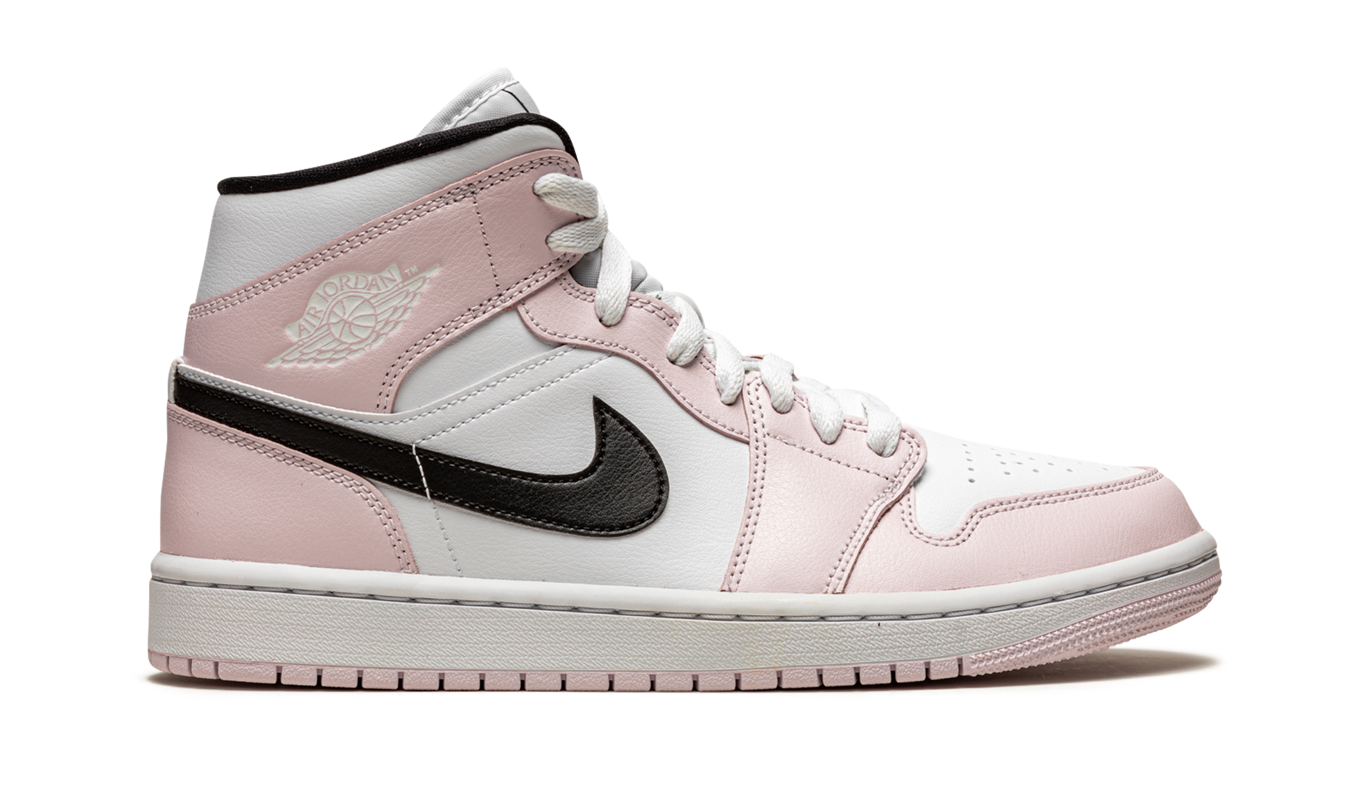 The Women’s Air Jordan 1 Mid “Barely Rose” is a women’s exclusive version of Michael Jordan’s first signature shoe in a soothing colorway. The Jordan 1 Mid is a popular model for women, and it’s easy to see why that is based on the appealing color block of the “Barely Rose.” Jordan Brand contrasts the overlay panels in Barely Rose with a white leather base. Branding wise, a black leather Swoosh appears on both sides and a white “Wings” logo can be found on the collar. Additionally, a black Jumpman graces the branding tag stitched onto the top of the white nylon tongue. A black liner and white shoelaces provide additional detailing. The “Barely Rose” is finished off with a white midsole and contrasting light pink outsole. Barely Rose