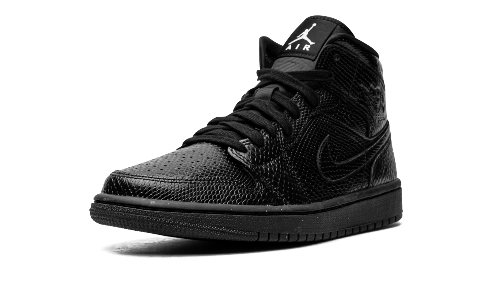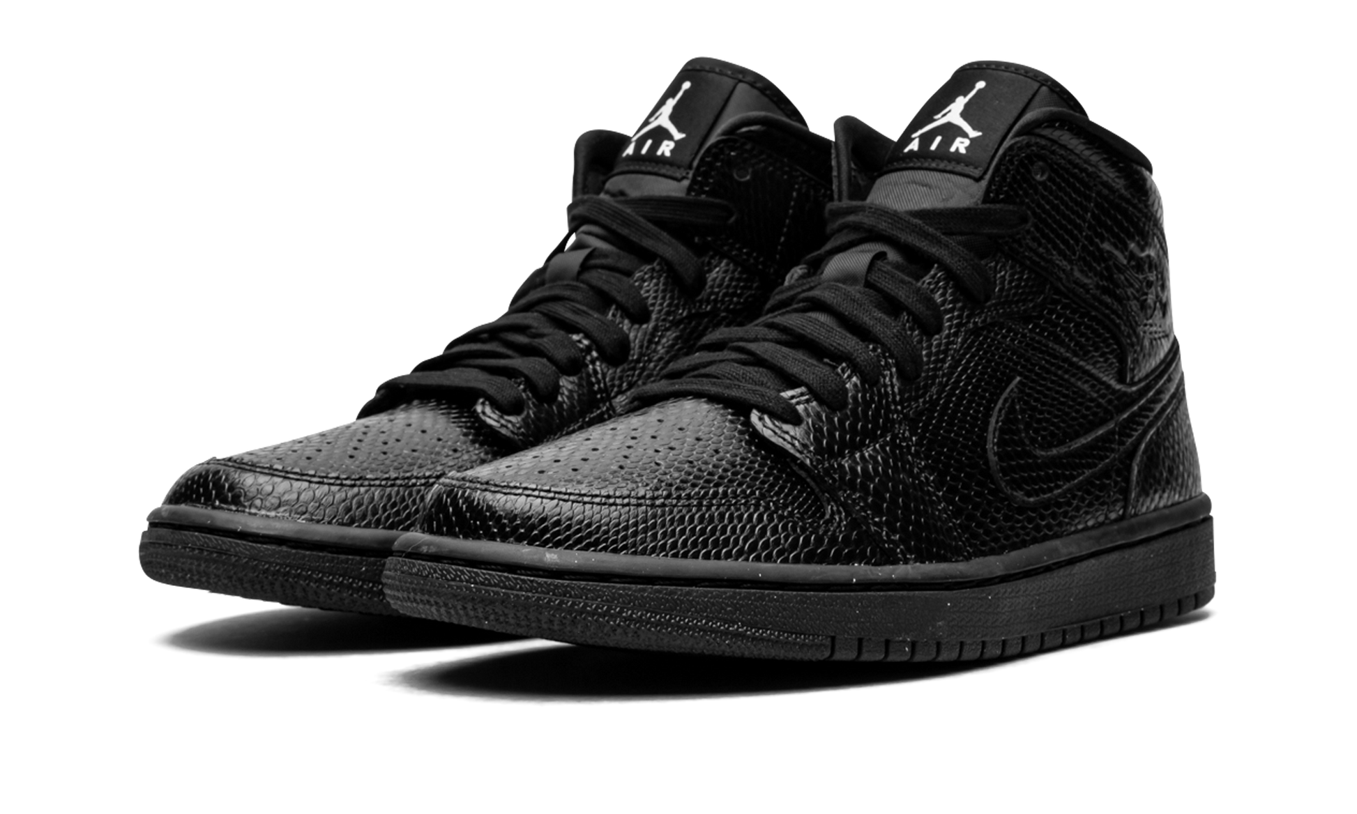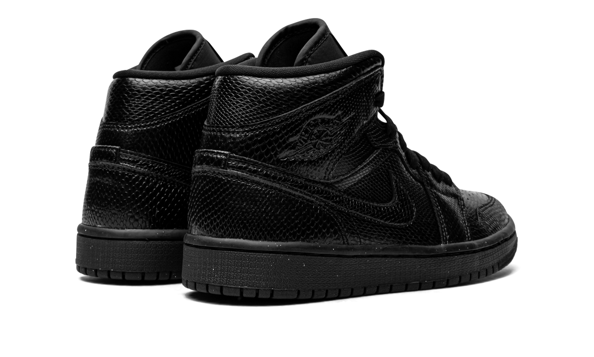 Black leather Air Jordan 1 Mid from JORDAN featuring signature Swoosh logo detail, signature Air Jordan Wings logo, round toe, front lace-up fastening, logo patch at the tongue, ankle-length, branded insole and rubber sole. These styles are supplied by a premium sneaker marketplace. Stocking only the most sought-after footwear, they source and curate some of the most hard to find sneakers from around the world.. Black Snakeskin