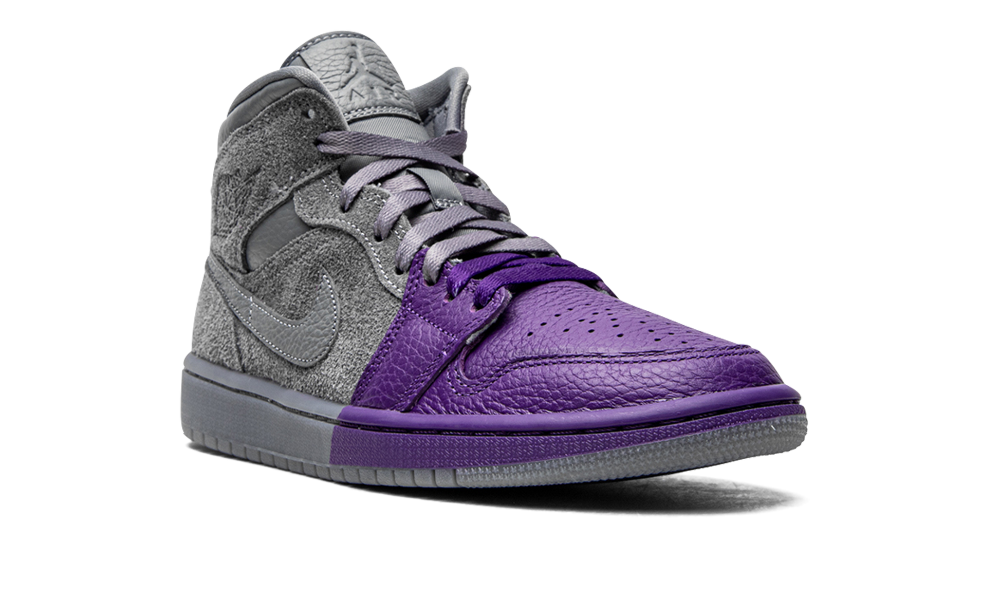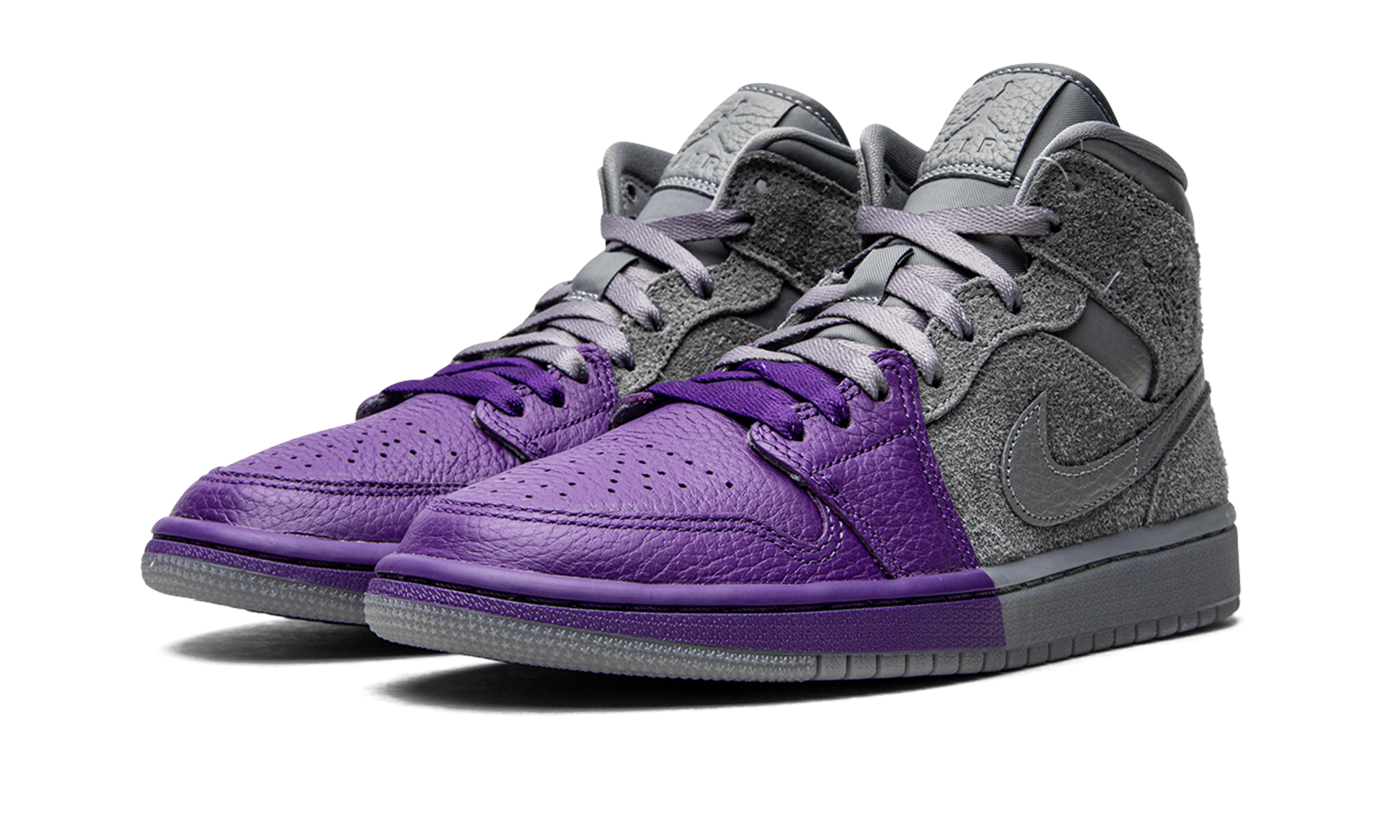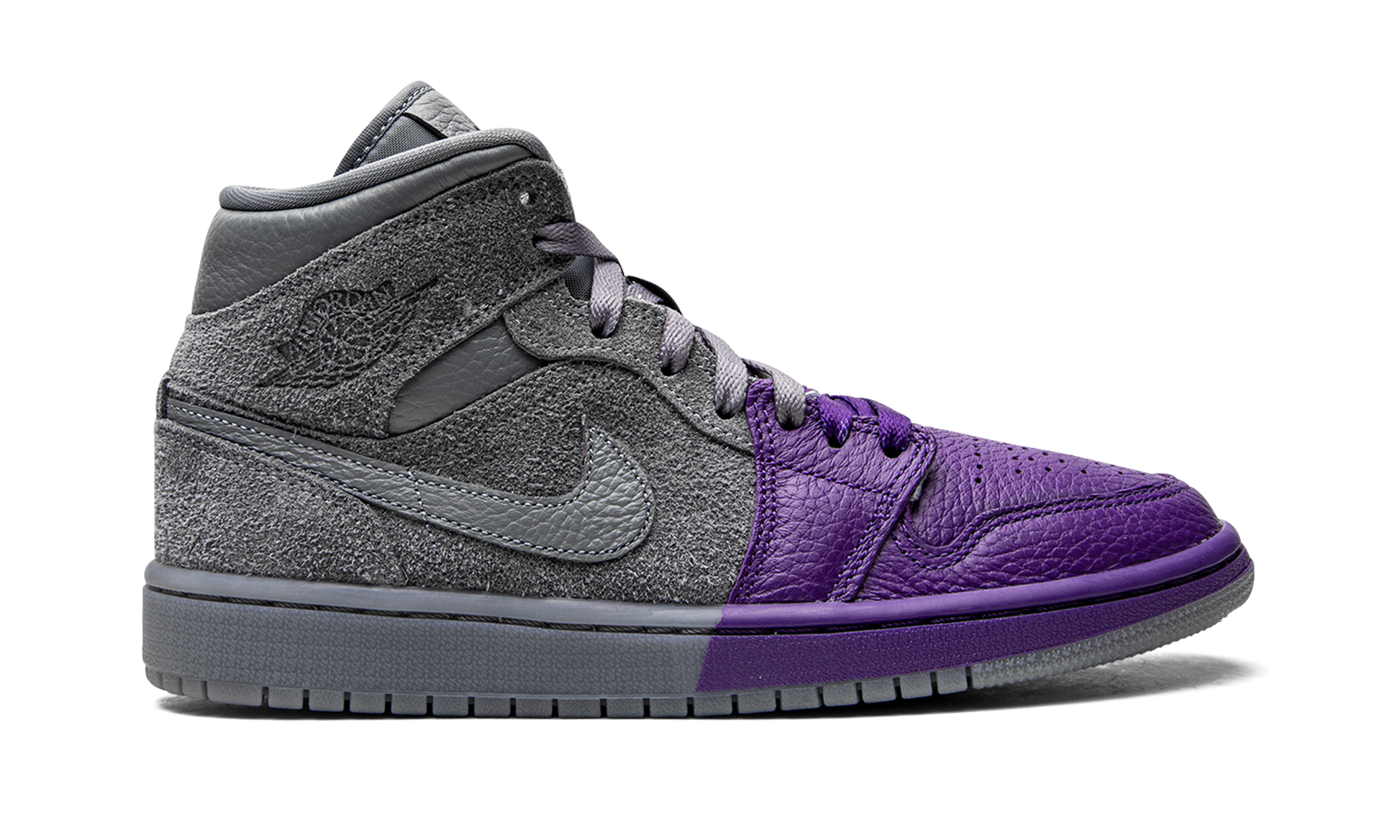 The Sheila Rashid x Air Jordan 1 Mid “Unite” is a collaboration between the bespoke designer and Jordan Brand as part of the Unite campaign. Here, Michael Jordan’s first signature shoe is lowered in height to the mid-top silhouette, and features a distinct color block. Court Purple tumbled leather appears on the perforated toe and forefoot. From the mid-panel on, grey suede detailing is introduced into the design. The hairy material dots the mid-panel, collar overlay, and heel. Tonal “Wings” insignia is located on the collar. Leather Swooshes appear on either side of the shoe. The grey nylon tongue and tongue tag with Jumpman detailing are contrasted by purple accenting on the throat and laces. The midsole continues the split color blocking with purple paint in the same area as the upper. Release date: March 2, 2020. Sheila Rashid - Unite