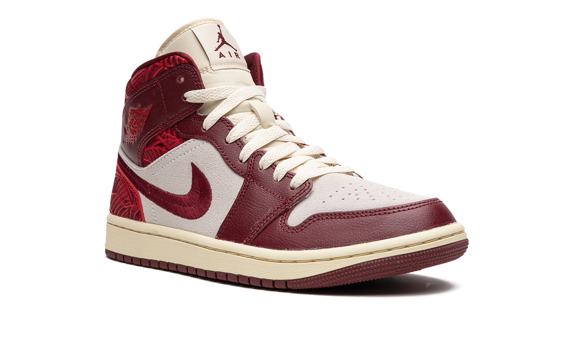 The Women’s Air Jordan 1 Mid “Tiki Leaf” is a women’s-exclusive colorway of the lifestyle shoe with tropical-inspired detailing. The always popular Jordan 1 Mid receives a warm weather inspired design on the “Tiki Leaf” colorway. The shoe features a Sail suede base with contrasting red leather overlays. A red Swoosh is embroidered on the sides and a red “Wings” logo can be found on the collar. Additional red branding appears in the form of Jumpman and “Air” logos on the tongue tag. The red leather overlays on the collar and heel are treated with a tonal tiki leaf pattern. Release date: March 1, 2023 Tiki Leaf