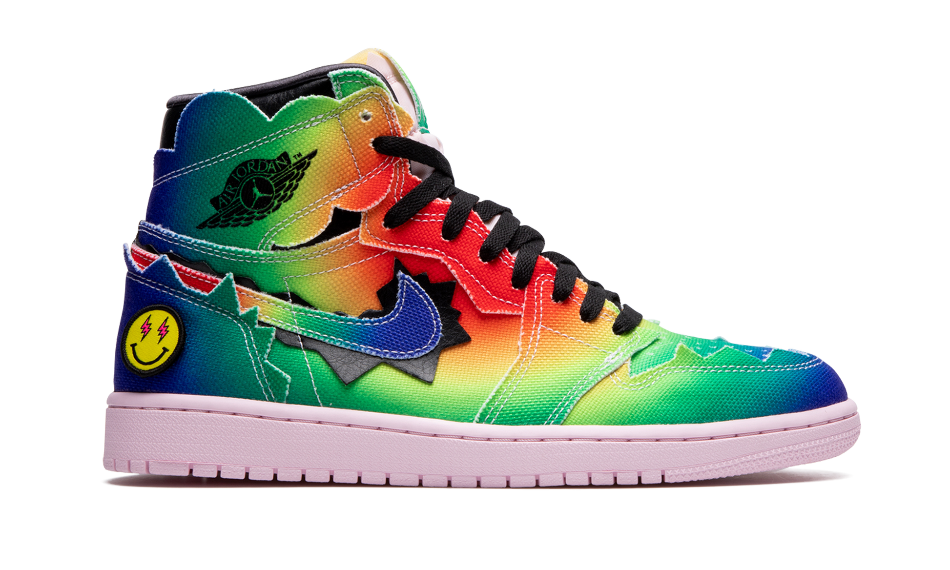 The J Balvin x Air Jordan 1 High OG “Colores Y Vibras” is a Holiday 2020 collaboration between the popular Latin artist and Jordan Brand on Michael Jordan’s first signature shoe. With the release of the “Colores Y Vibras,” which translates to “Colors and Vibes” in English, the Colombia native becomes the first Latin musician to collaborate with Jordan Brand, a monumental achievement. As for the design, the upper features a canvas construction with a rainbow-like assortment of colors baked into its look. Jagged panels on the collar, eyelets, heel, and forefoot further the singular look of J Balvin’s design. Other details include multicolor sewn-on Swooshes on either side, a black “Wings” emblem on the collar, and a pink nylon tongue with mismatching tongue tags that feature an orange patch with a black Jumpman on the right shoe and a green patch with a yellow smiley face on the left shoe. Exposed foam breaks through the top of the jagged collar and the artist’s yellow smiley face arrives in patch form on the heel. A light pink sole completes the look of one of most eccentric Air Jordan 1s ever designed. Release date: December 8, 2020. J Balvin