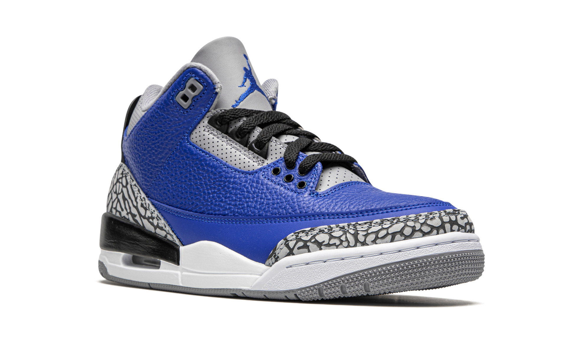 The Air Jordan 3 “Blue Cement” is a desirable non-original colorway of Michael Jordan’s third signature shoe that was released in Fall 2020. Dressed in a color scheme reminiscent of the “Red Cement” Jordan 3 that debuted to much fanfare during the NBA’s All-Star Weekend in 2020, the “Varsity Royal” plays up on the silhouette’s throwback styling while remaining fresh in every aspect of its design. Appearing in the same color block of the “Black/Cement” colorway, the upper swaps black tumbled leather with Varsity Royal leather. The iconic elephant print panels are found on the toe and heel. White Jumpman detailing appears on the heel and an Air window in the heel of the midsole helps retain the original look of the Jordan 3. Release date: October 10, 2020. Blue Cement