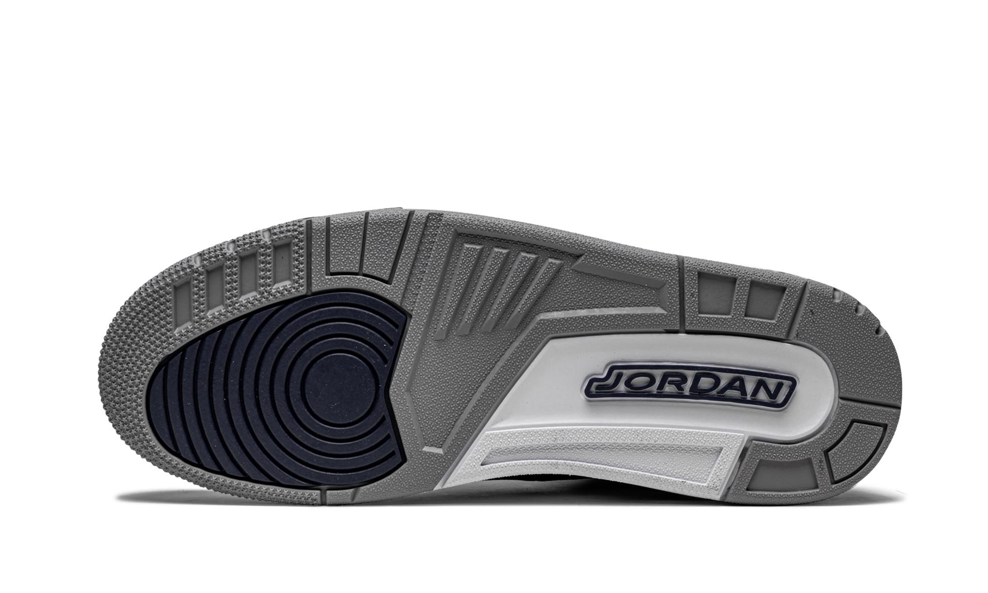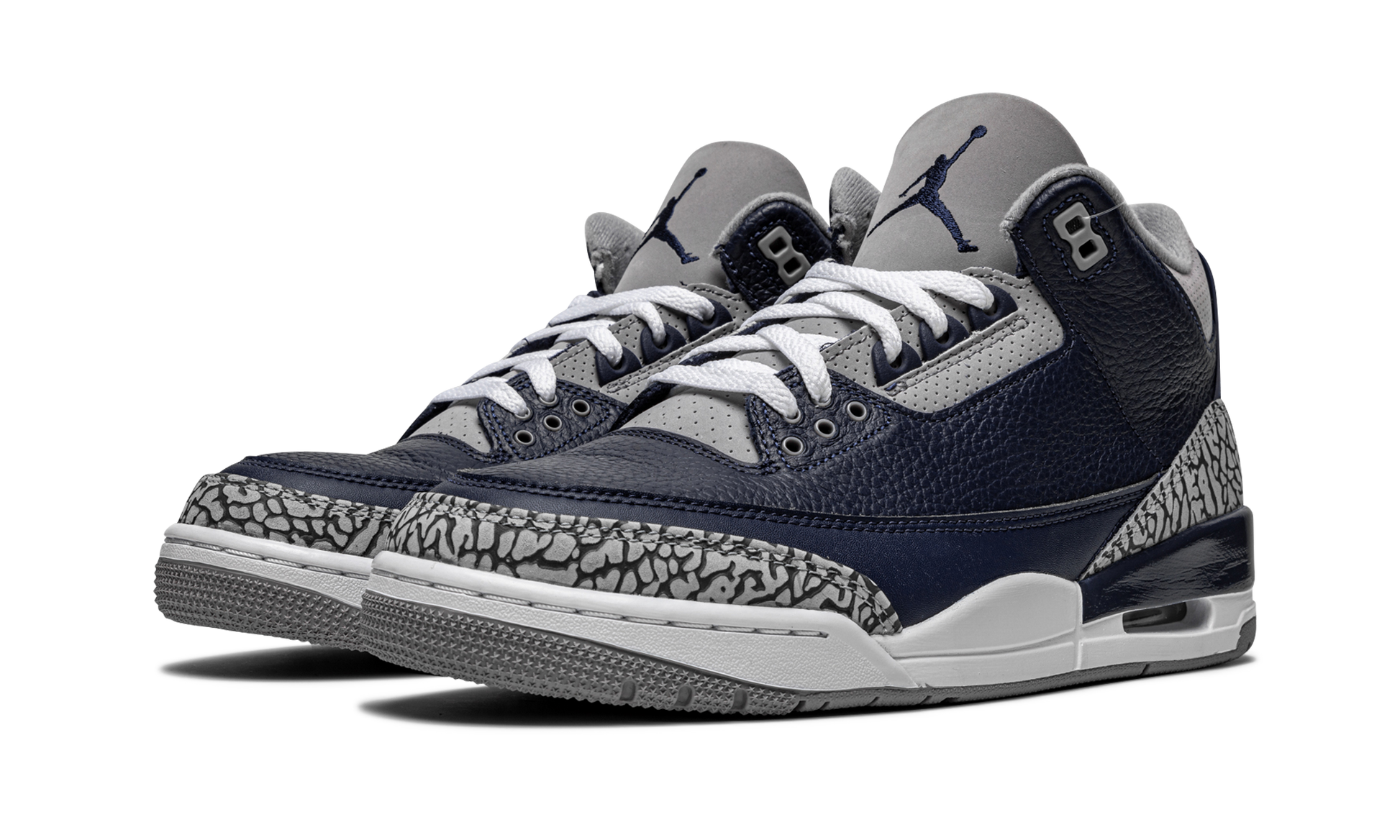 The Air Jordan 3 “Georgetown” is a March 2021 release of Michael Jordan’s third signature shoe in a Georgetown Hoyas inspired colorway. Unofficially, the “Georgetown” honors the college basketball powerhouse by employing the team’s uniform colors in its design. The look references many of the Player Exclusive “Georgetown” colorways given to members of the Hoya family by Jordan Brand. Details include a Midnight Navy tumbled leather upper with contrasting dotted Cement Grey leather panels on the eyelets, collar, and tongue. Classic elephant print appears on the heel and toe as per the original styling of the Air Jordan 3. Additional design cues include a navy blue embroidered Jumpman on the grey leather tongue, white laces, and a white Jumpman on the heel. A visible Air unit in the heel of the white midsole completes the look of this “Georgetown” edition of the Jordan 3. Release date: March 20, 2021. Georgetown