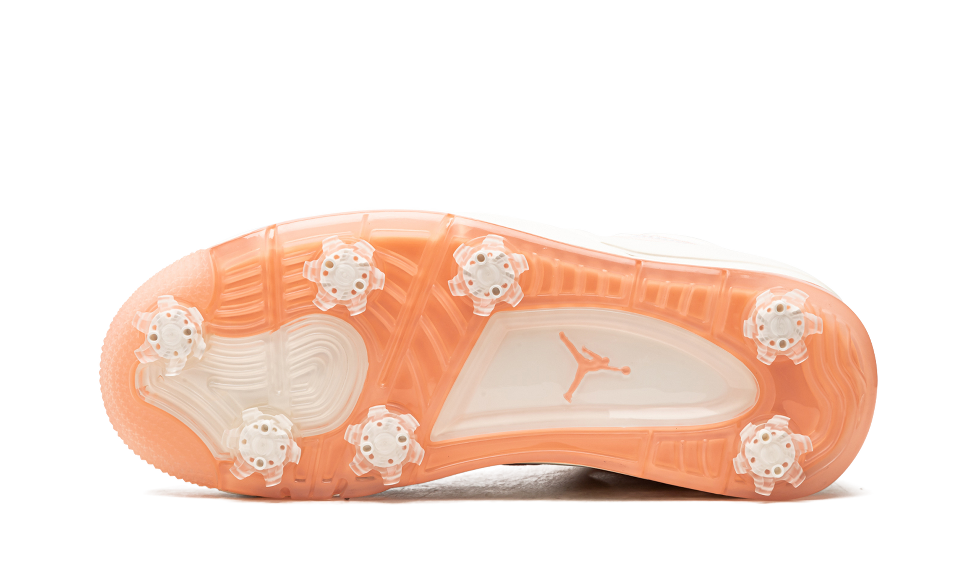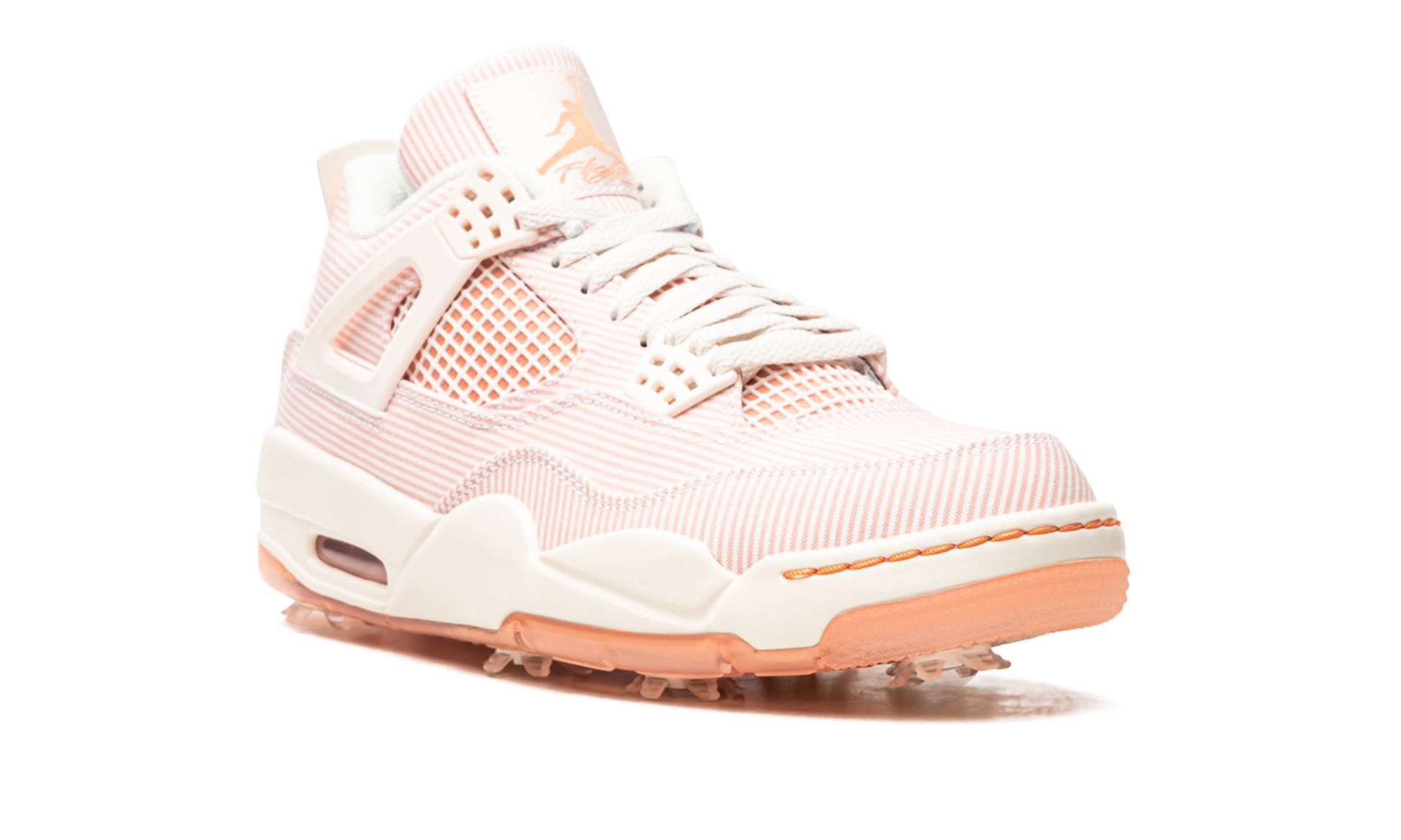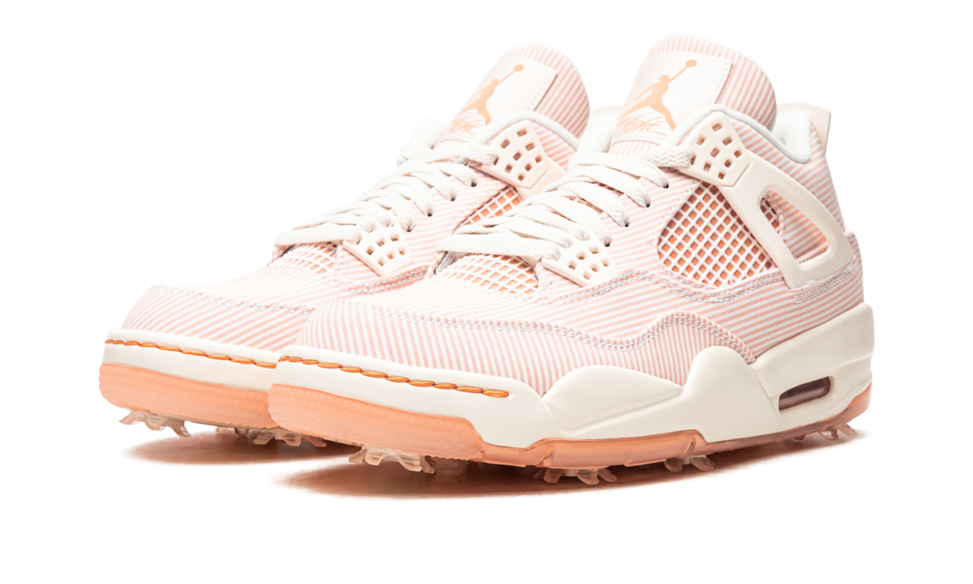 The Air Jordan 4 Golf “Seersucker” is a golf shoe by Jordan Brand that is based on Michael Jordan’s legendary fourth signature basketball shoe. Released just prior to the 2021 PGA Championship in May 2021, the Jordan 4 Golf “Seersucker” appears in a summer-ready, striped, light orange design. Lightweight seersucker material covers the entire upper, save for the white netting on both the mid-panel and tongue, both of which are original design components of the first Air Jordan 4 by Nike. Sail “wings” lace holders can be found on either side. A pink/light orange Jumpman logo graces the nylon tongue tag and the heel. The small visible Air bubble in the heel of the cream-colored midsole is a true-to-original look for the retro basketball shoe. Jordan Brand adds rubber spikes to the semi-translucent outsole. Release date: May 21, 2021 Seersucker