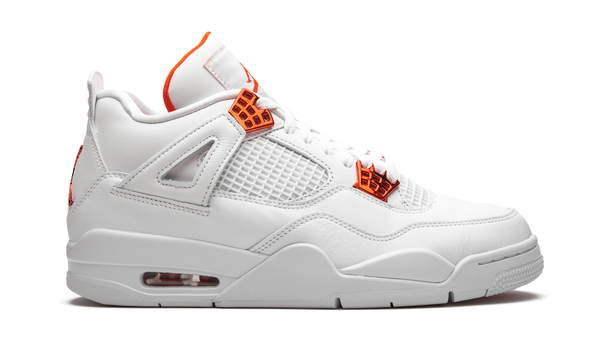 The Air Jordan 4 “Metallic Pack - Orange” is part of Jordan Brand’s 2020 collection of “Metallic” colorways inspired by an original design from the 1980s. One of several “Metallic Pack” Jordan 4s, this “Orange” design is reminiscent of the Air Jordan 1 of the same nickname from 1985, which was an original makeup of Michael Jordan’s first signature shoe. The two-toned appearance features a white leather upper with tonal netting on the mid-panel and throat. Metallic Orange hits on the lace eyelets and Jumpman detailing on the heel provide a stark contrast to the neutral base. Additional orange Jumpman branding can be found on the nylon tongue tab. The hue also appears on the inner lining of the tongue. The classic Air Jordan 4 appearance of this “Metallic Orange” design includes a small visible Air window in the heel. Release date: May 20, 2020. Metallic Pack - Orange