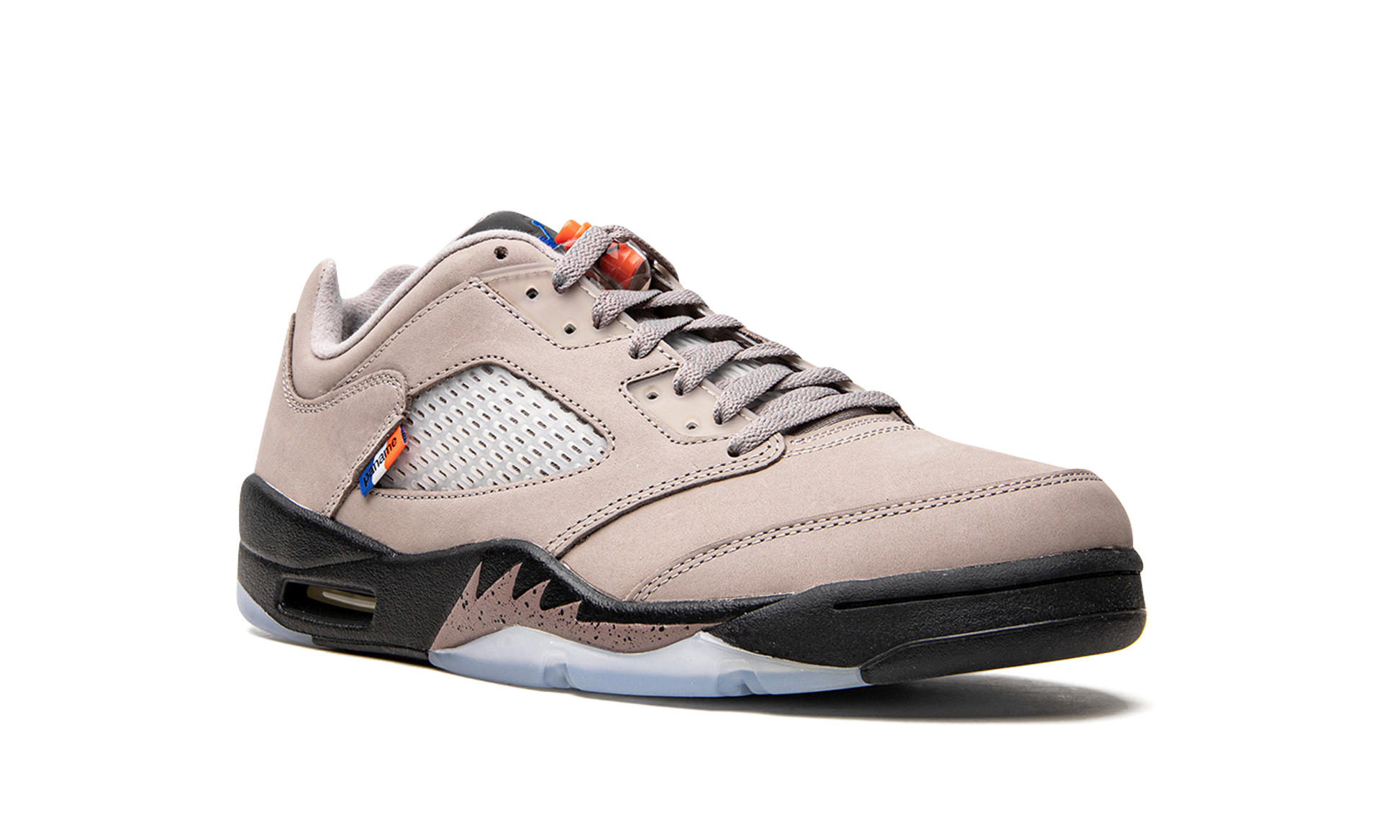 The PSG x Air Jordan 5 Low is a collaboration between the Parisian soccer team and Jordan Brand on a neutral colorway of Michael Jordan’s fifth signature shoe. Prior to releasing this shoe in September 2022, Paris Saint Germain and Jordan Brand collaborated on a colorway of the Air Jordan 5 in 2018 that was released to the public as well as a colorway made exclusively to friends and family of both brands. The upper features a grey nubuck construction with translucent netting on the mid-panel and tongue. The lateral side of the shoe features a “Paname” tab. A red waxed “PSG” seal can be found on the heel. The black painted midsole is contrasted with grey speckled shark tooth detailing. Release date: September 3, 2022 PSG