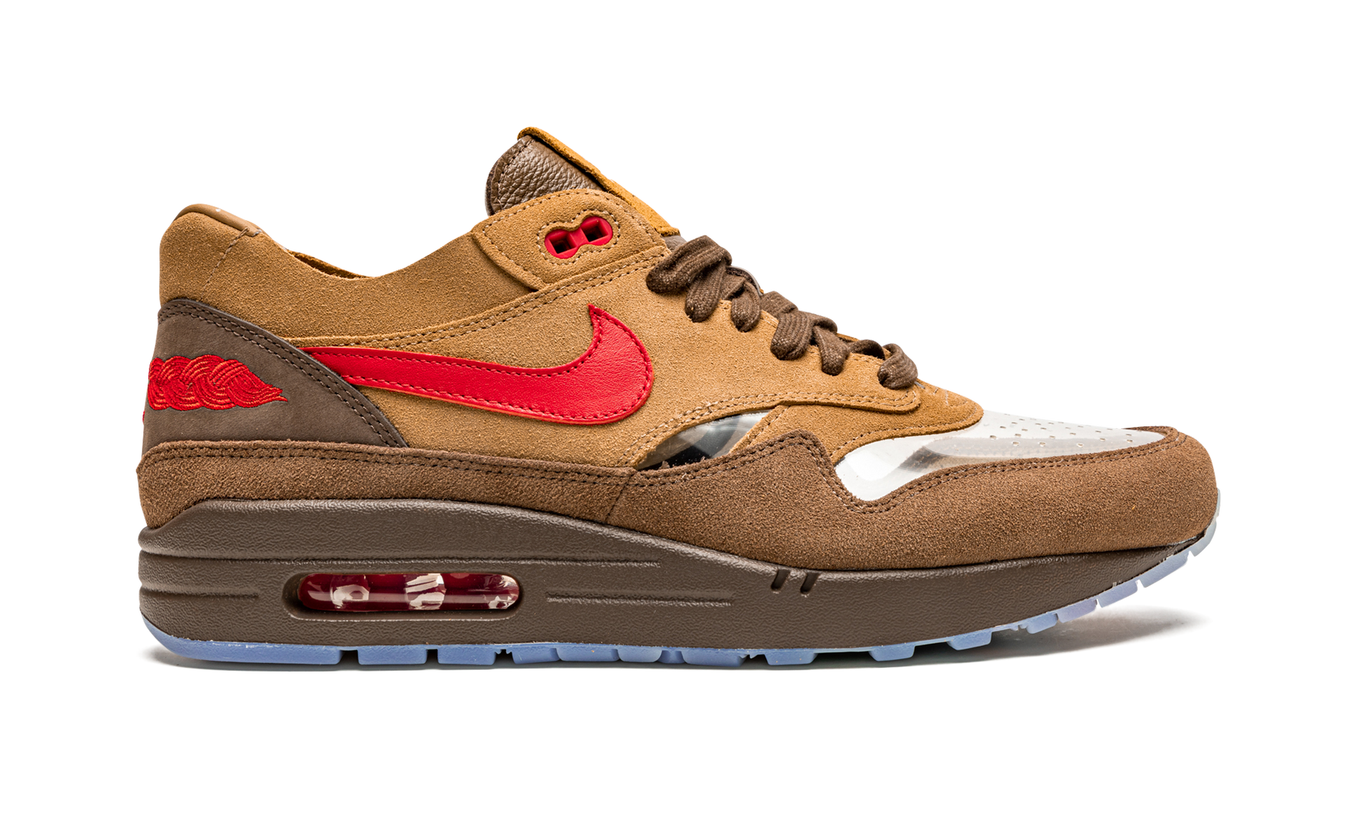 The Clot x Nike Air Max 1 “Kiss of Death Cha” is a collaboration between Edison Chen’s streetwear imprint and Nike on the retro running shoe in a colorway inspired by different varieties of Chinese tea. Succeeding Clot’s popular “Kiss of Death” Air Max 1, the “Kiss of Death Cha” adopts a similar construction to its predecessor. Both colorways feature a beige suede upper with translucent panels on the perforated toe and forefoot. The similarities end there, however, as the “Kiss of Death Cha'' displays a red leather Swoosh where the original “Kiss of Death” donned an orange leather Swoosh. Moreover, a chocolate brown suede mudguard appears on the “Cha.” The OG “Kiss of Death” features a beige suede mudguard. Red embossed detailing can be found on the heel and red accenting appears on the eyelets. A tan suede “Nike Air” tongue tag contrasts the brown leather tongue. Traditional Chinese symbols are printed on the insole. Underfoot, a red-tinted visible Air bubble appears within the heel of the brown midsole. Release date: March 27, 2021. Clot - Kiss of Death CHA