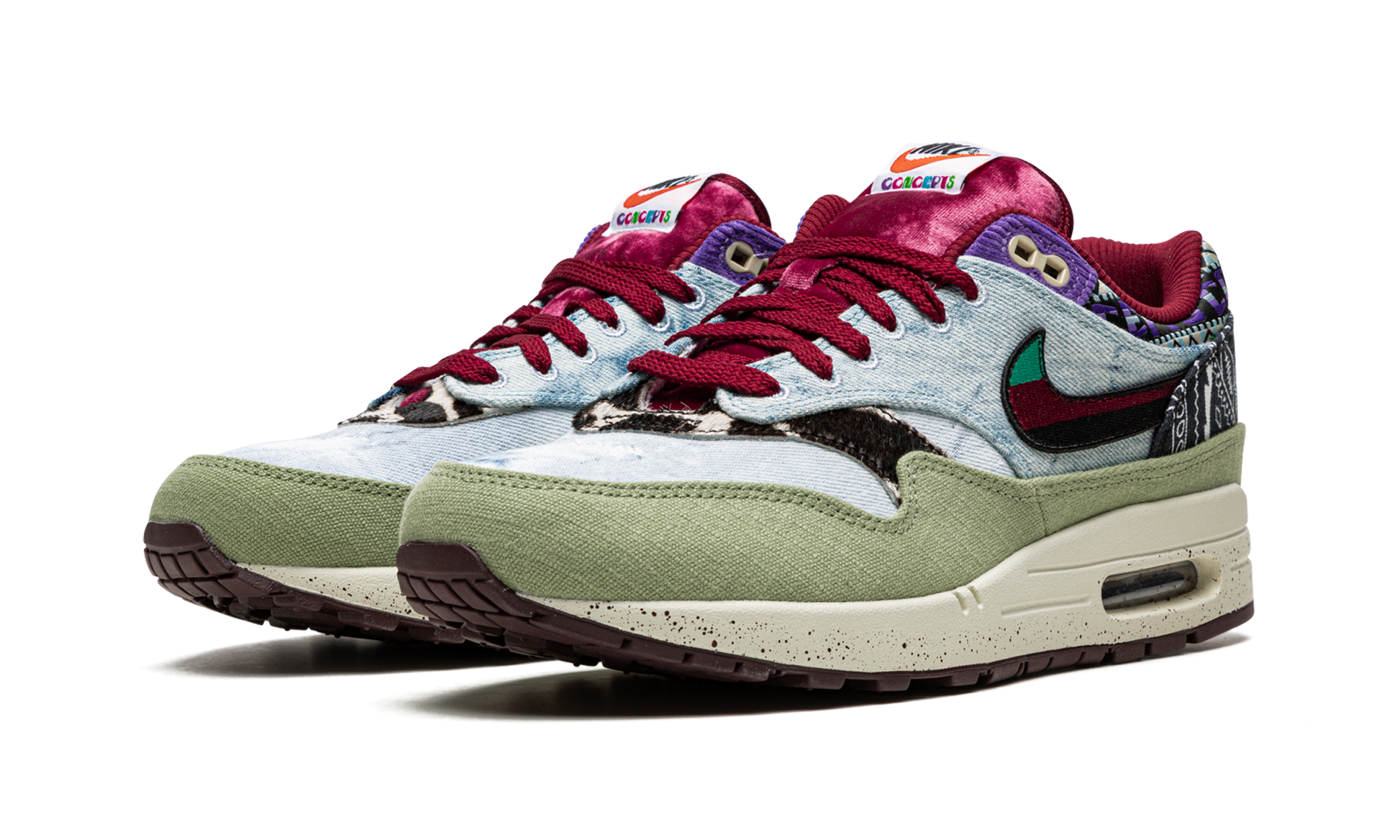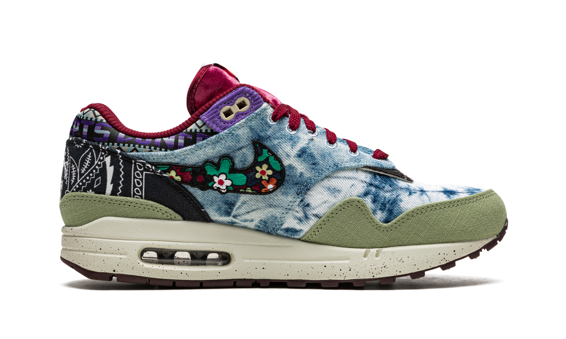 The Concepts x Nike Air Max 1 “Mellow” is a collaboration between the Boston based sneaker boutique and Nike on the vintage running shoe in a colorway inspired by 1960s and 1970s youth culture. The “Mellow” colorway draws favorably from the era’s music festivals, specifically the ‘69 Harlem Cultural Festival, which was headlined by the likes of Stevie Wonder, Nina Simone, and many more. The unique fashion worn by the festival’s headlining acts and concert goers informs the eye-catching bandana, cowhide, denim, and woven materials found on the “Mellow’s” design. Velvet accenting, frayed edges, and a multicolor Swoosh accentuate the shoe’s “flower power” design ethos. Release date: March 5, 2022 Concepts - Mellow