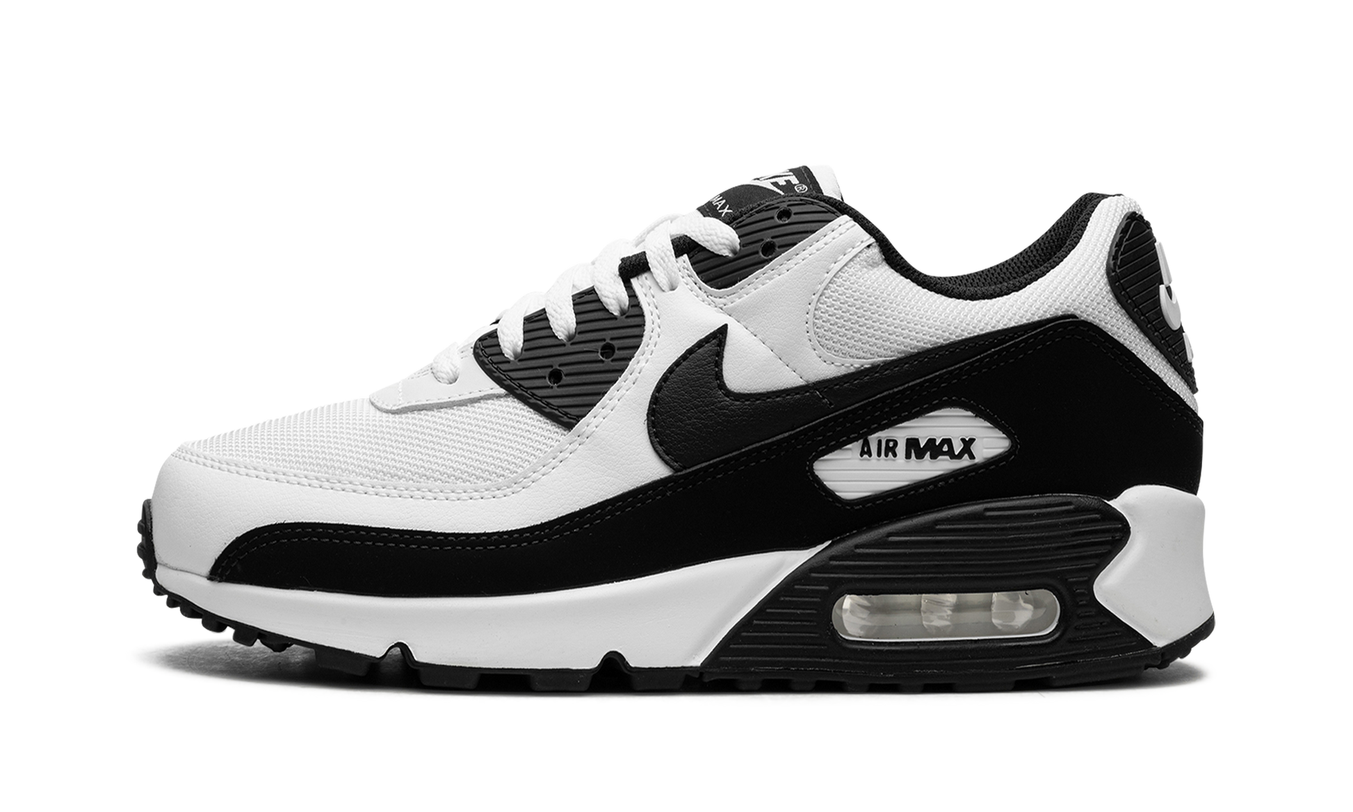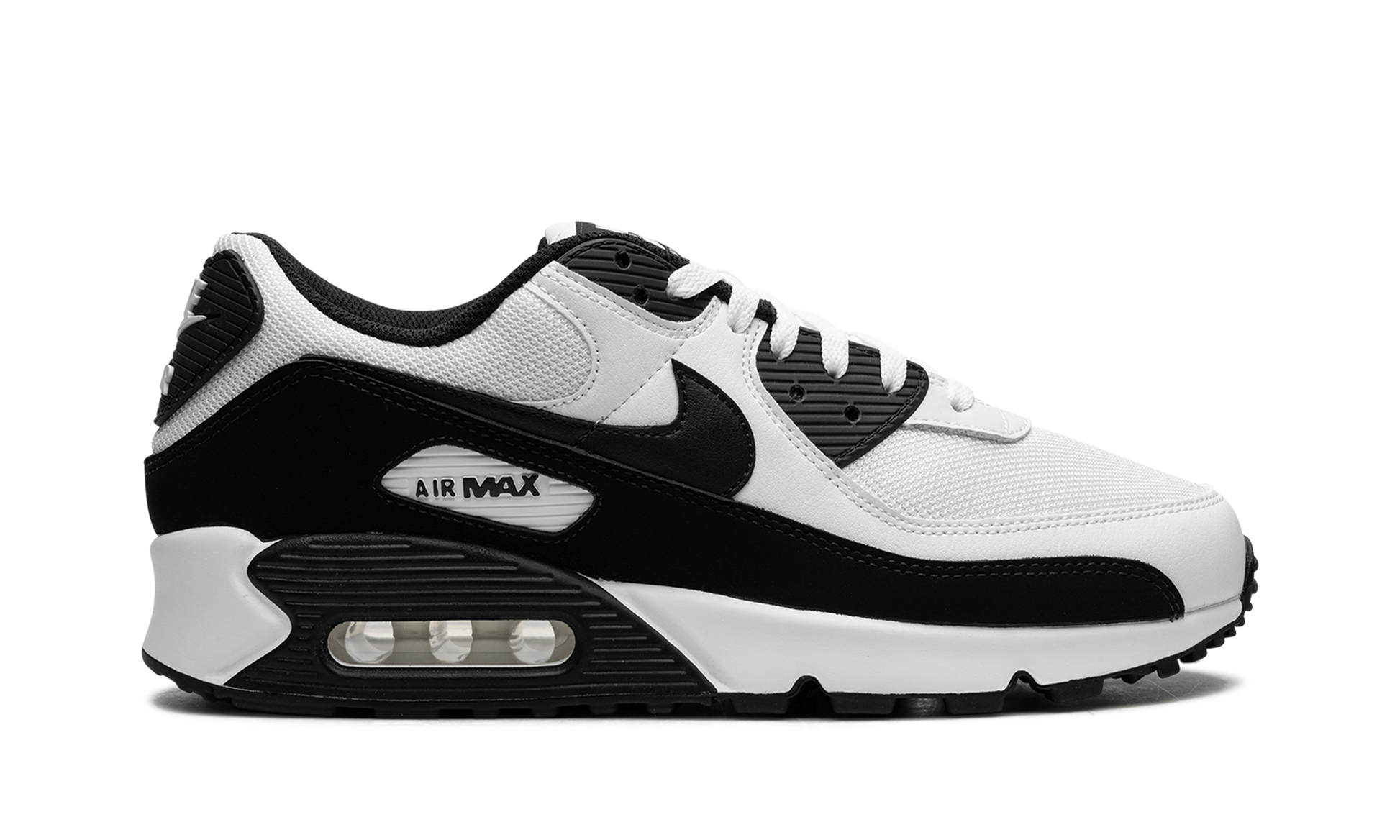 The Nike Air Max 90 “Panda” features the popular black and white color scheme for the iconic retro running shoe. The Air Max 90 was designed by Tinker Hatfield and originally released in 1990 as a running shoe. Today, the retro sneaker is beloved for its comfort and its classic styling. The “Panda” features a white mesh base with white leather overlays on the toe and forefoot, and on the mid-panel and collar. A black leather Swoosh appears on each side. Additional black accenting appears on the mudguard, on the eyelets, and on the heel counter featuring “Nike Air” branding. More “Nike” detailing is found on the tongue tag. Underfoot, a black panel surrounds the visible Air cushioning unit in the heel of the midsole. Release date: June 26, 2023 Panda