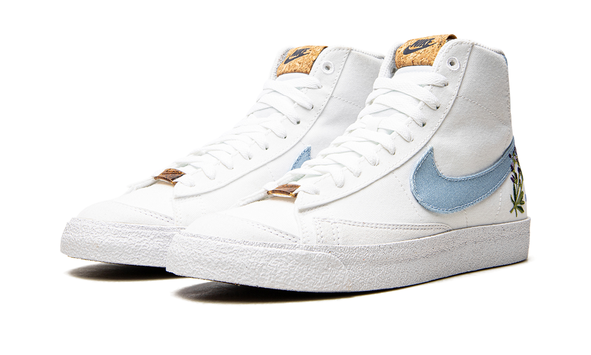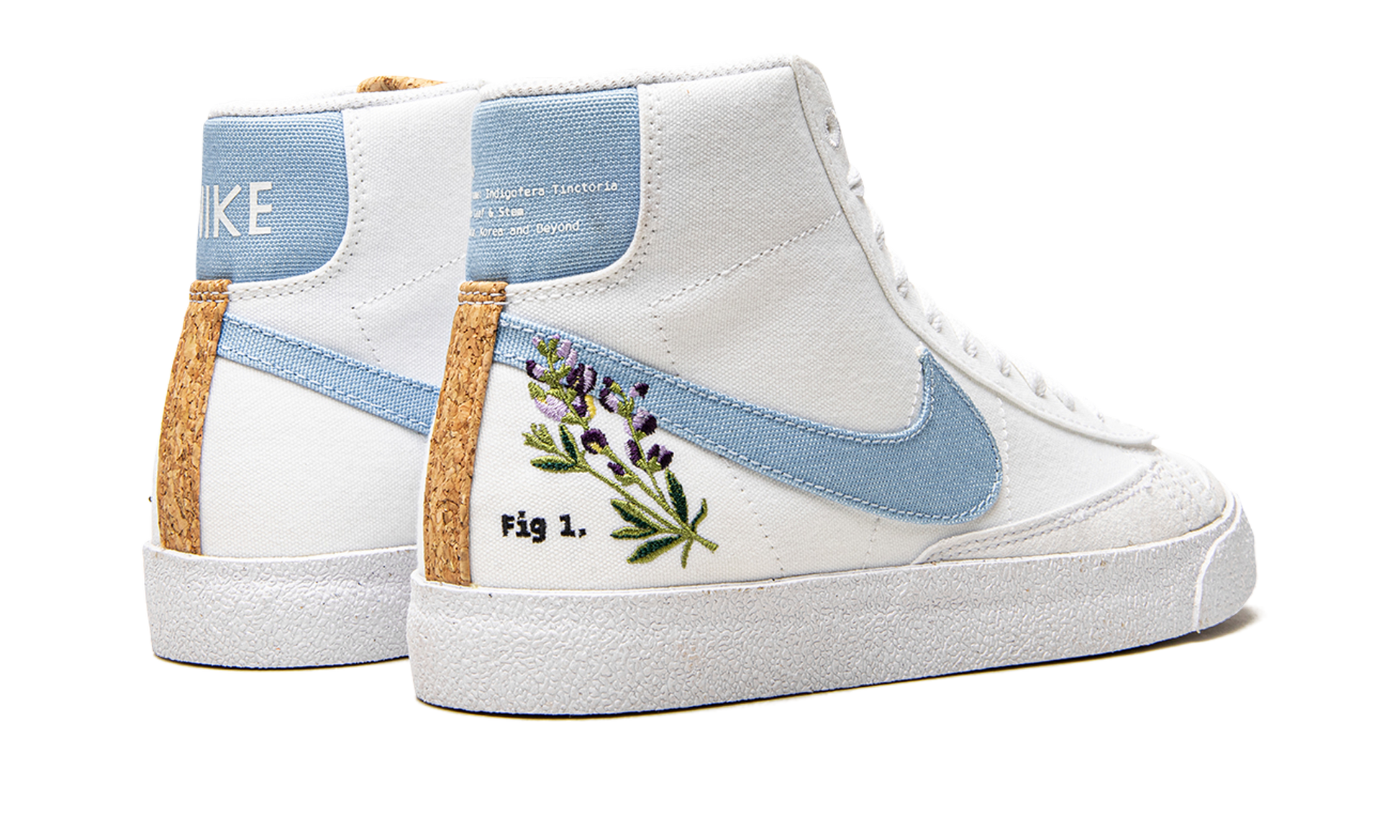 The Women’s Nike Blazer Mid '77 "Indigo" shoe is a retro-inspired style with a modern touch. Dating back to the '70s, the Blazer Mid has remained a footwear staple for sneaker lovers, and now, the style can add sustainability to its list of premium features. This release of the Blazer features at least 20% of recycled content by weight in its construction, plant-based dyes, and recycled cork on the tongue tag and heel strip. This pair features a white canvas and suede upper, light blue accenting on the Swoosh and heel, and an indigo plant graphic embroidered on the right lateral heel. Indigo