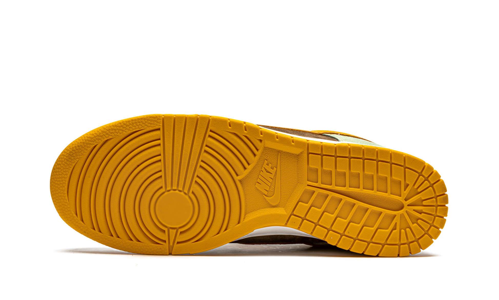 The Nike Dunk Low “Dusty Olive” is a June 2021 release of the retro basketball and lifestyle shoe by Nike that references the brand’s Japan-exclusive “Ugly Duckling” pack from the early 2000s. The “Dusty Olive” is not an original colorway from the collection, but is instead a flip on the color block of the three pairs that appeared in the whimsically-named collection from the early aughts. The forefoot, eyelets, collar, and heel display a Dusty Olive suede construction. Contrasting chocolate brown suede appears on the perforated toe, mid-panel, collar, and heel. A Pro Gold suede Swoosh breaks up the look on both sides. The same yellow hue appears on the suede heel tab with green “Nike” embroidery, on the laces, and on the classic “Nike” and Swoosh branding on the brown nylon tongue tag on the brown nylon tongue. A two-tone white midsole and Pro Gold-colored rubber outsole complete the look. Release date: June 17, 2021 Dusty Olive