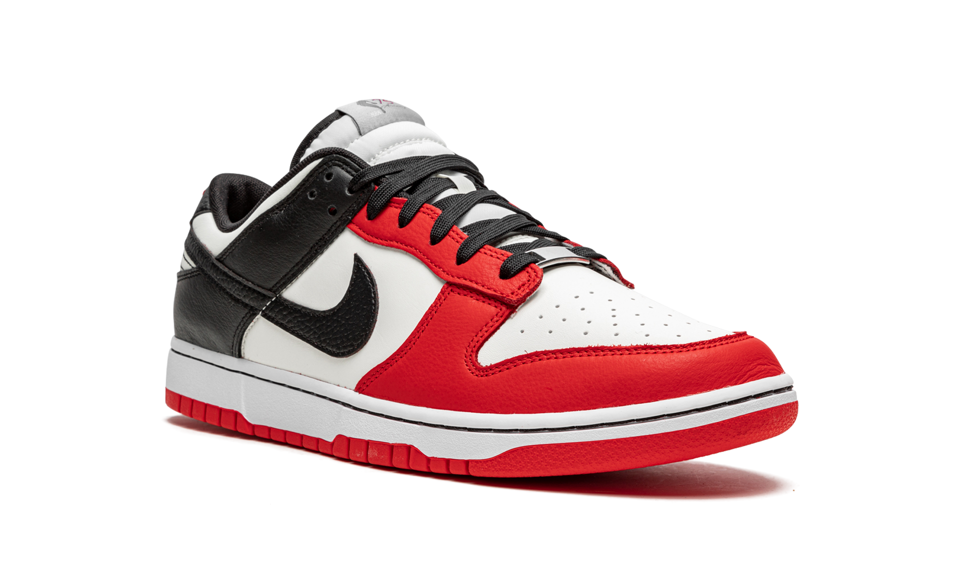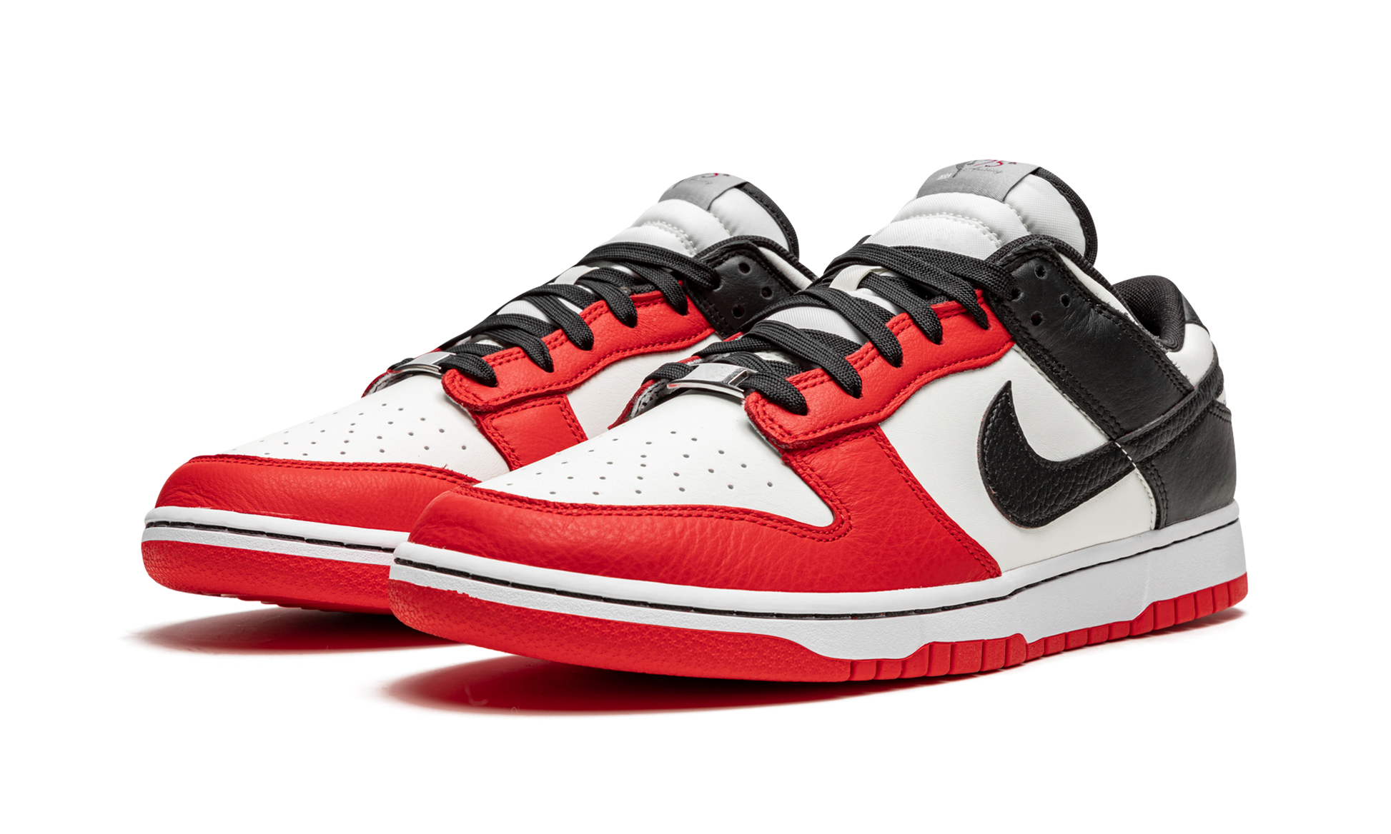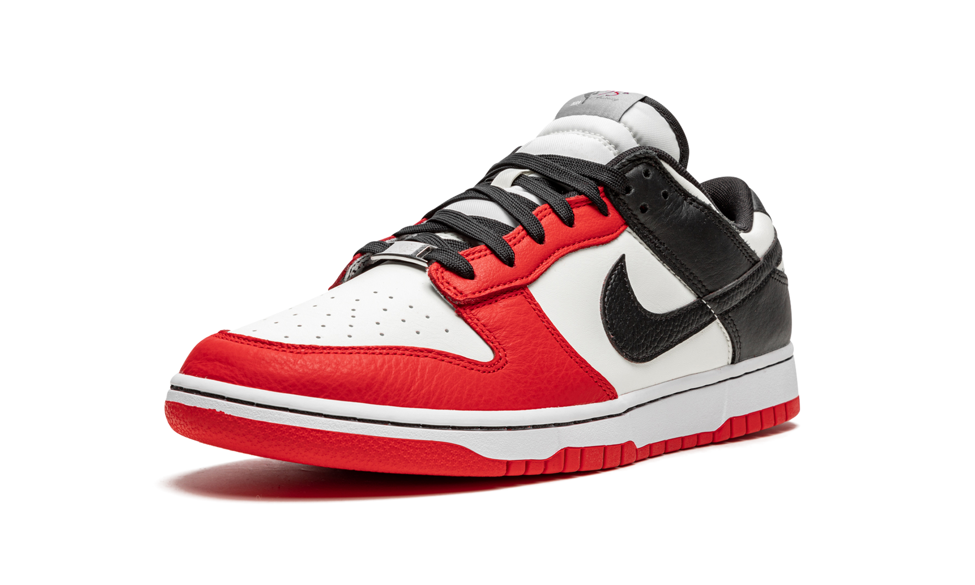 The NBA x Nike Dunk Low EMB “Chicago” is a special edition colorway of the classic basketball and lifestyle shoe that celebrates the NBA’s 75-year anniversary. As its name implies, the “Chicago” edition is inspired by the Chicago Bulls and its red, black, and white team uniform colors. The shoe features a crisp white leather base with contrasting Chile Red-colored leather panels on the toe cap, forefoot, and eyelets. Black leather can be found on the collar and heel, and on the Swoosh logo that appears on either side of the shoe. A red “Nike” logo is stitched onto the heel. Unique branding celebrating the NBA’s 75-year anniversary appears on the tongue. A two-tone, white midsole and red rubber outsole complete the look. Release date: October 23, 2021 NBA 75th Anniversary - Chicago Bulls