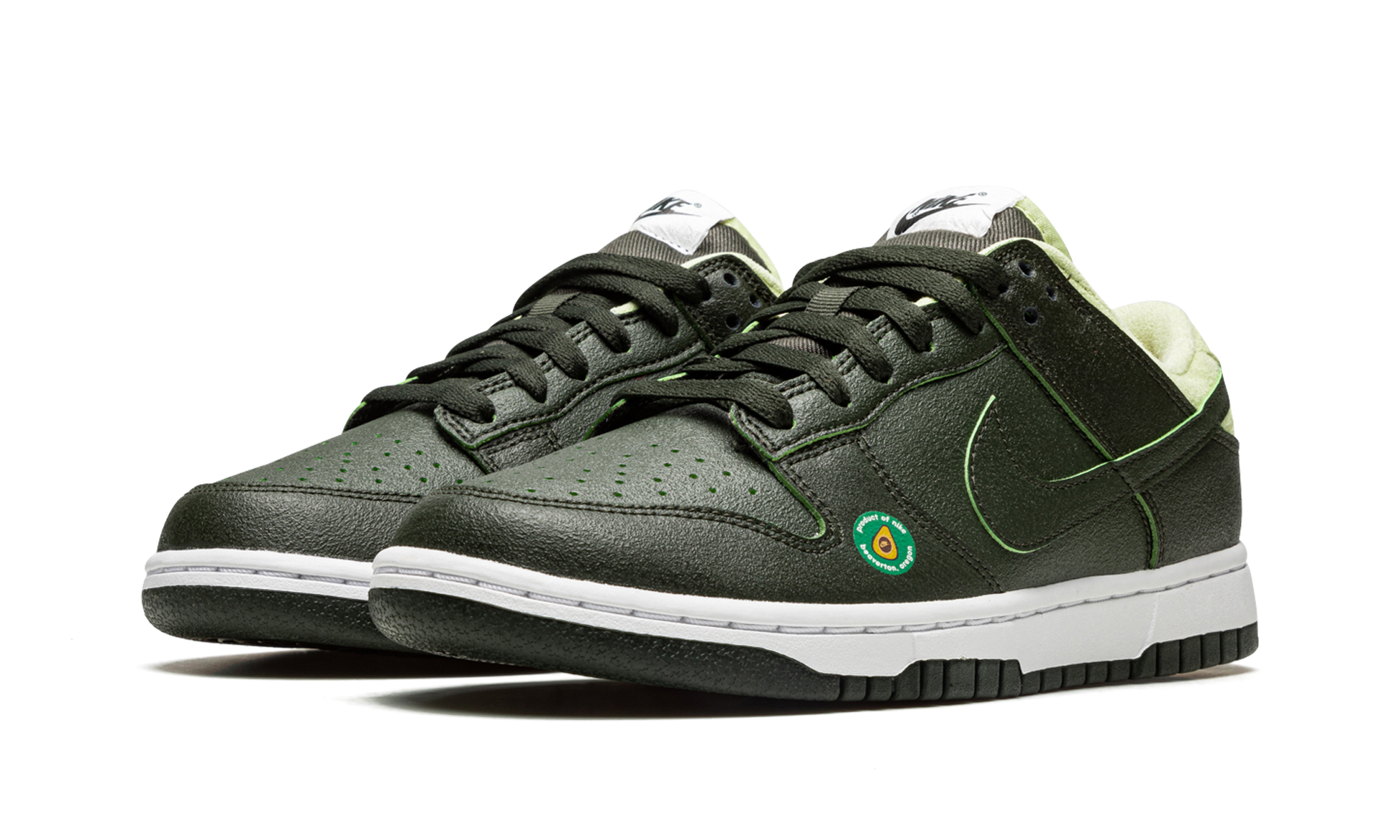 Nike nods to a popular food with the Women’s Nike Dunk Low “Avocado.” The shoe features a textured dark green base, similar to the outer skin of an avocado, paired with green contrasting accents resembling the inside of the fruit. Additional details include an avocado “sticker” on the lateral forefoot and insole along with a Nutrition Facts tag hiding on the inner side of the tongue tag. The “Avocado” Dunks come housed in a special packaging along with mesh shopping bag. Avocado