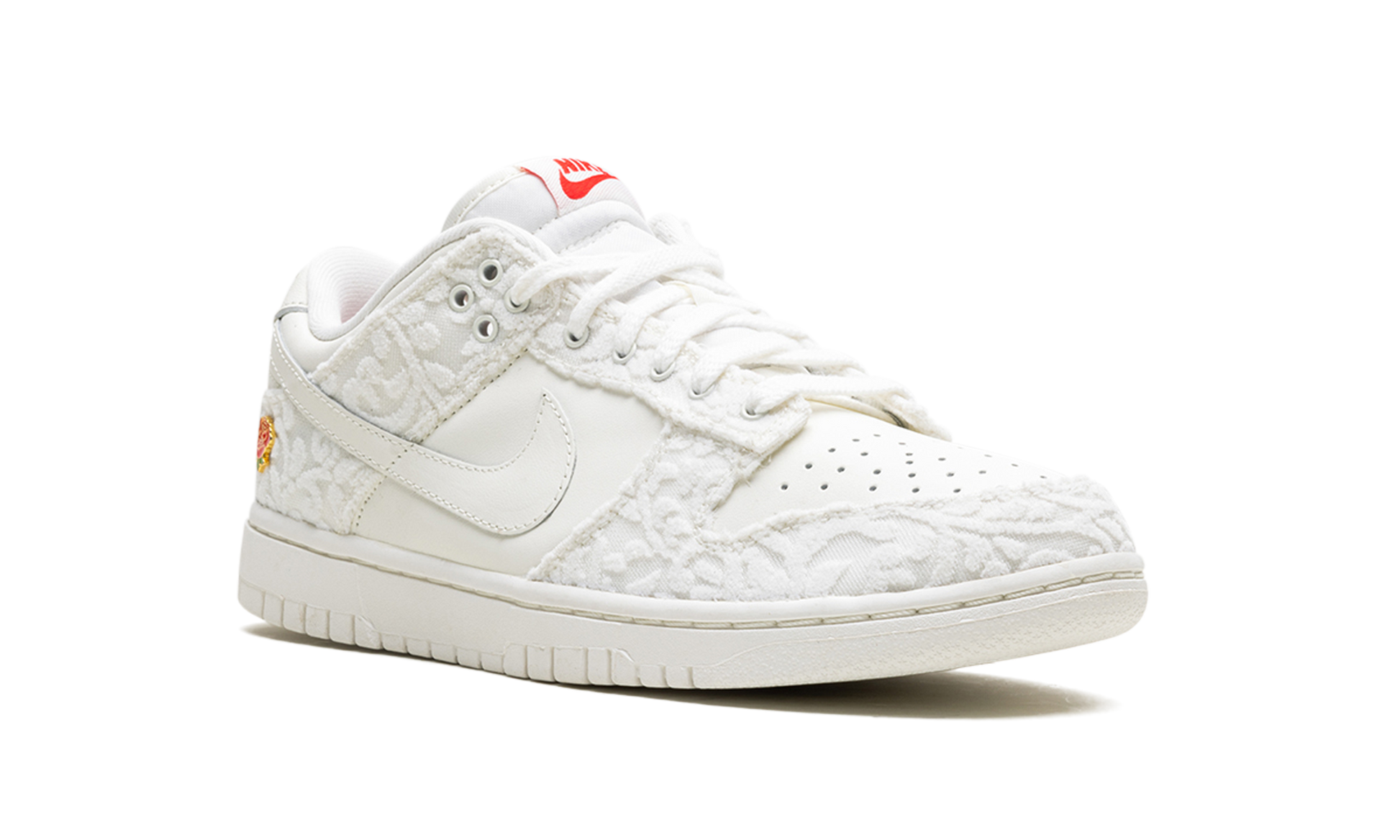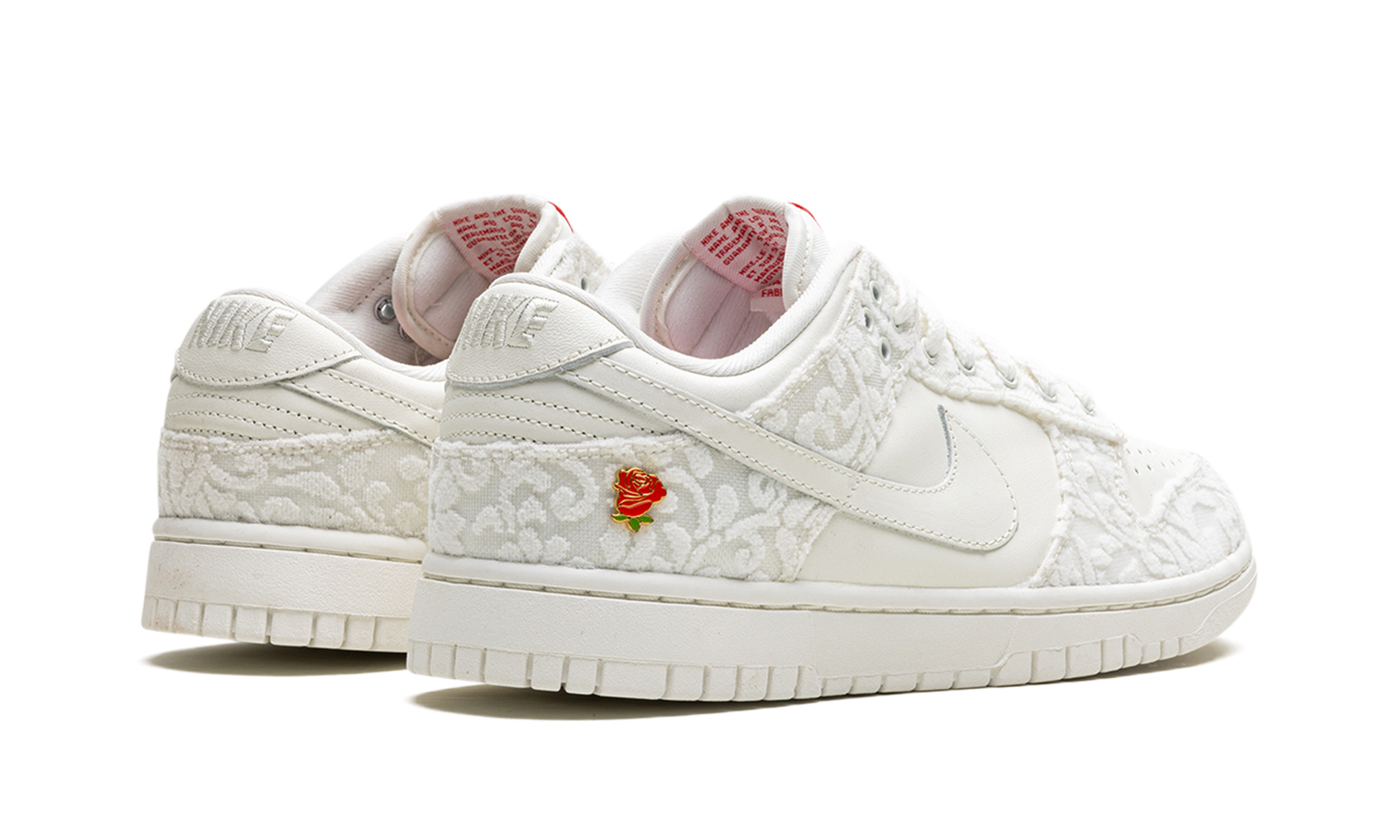 The Women’s Nike Dunk Low "Give Her Flowers" is a women’s-exclusive colorway of the retro shoe dedicated to Valentine’s Day. The “Give Her Flowers” Dunk Low has smooth Sail leather base with overlay panels that feature an elegant floral design. A rose pin appears on the lateral side of the heel, while the phrase, “You Deserve Flowers” is printed on the insole. University Red-colored “Nike” and Swoosh logos appear on the tongue tag, while white “Nike” embroidery can be found on the heel. Giver Her Flowers