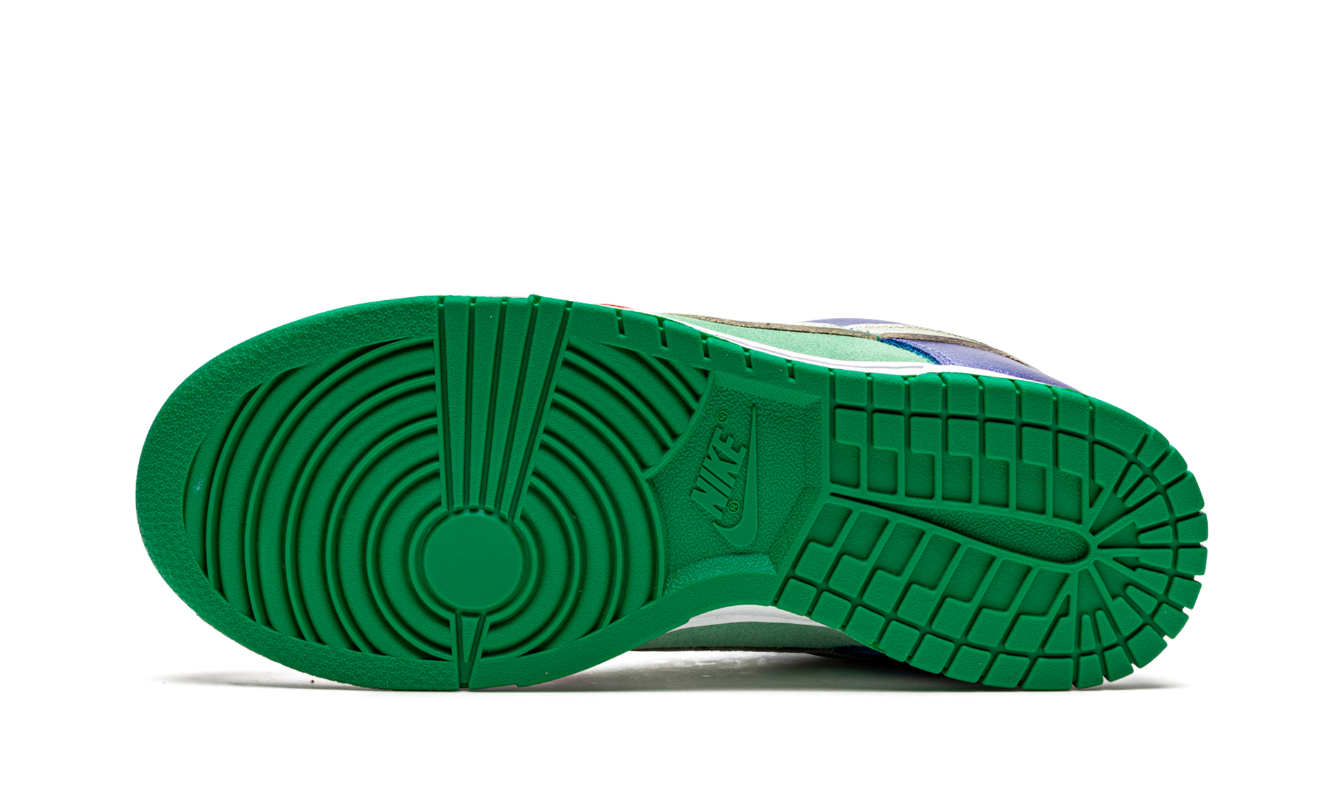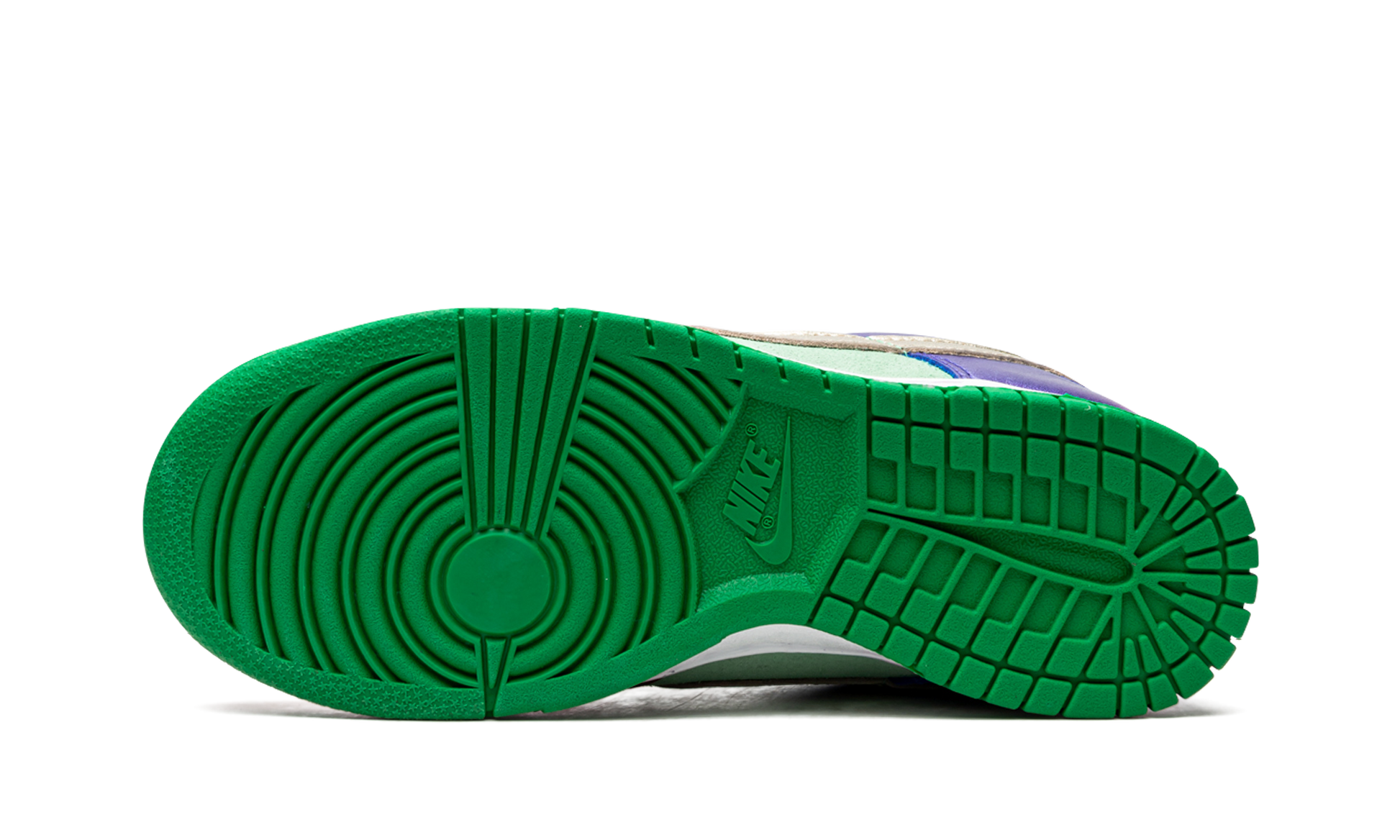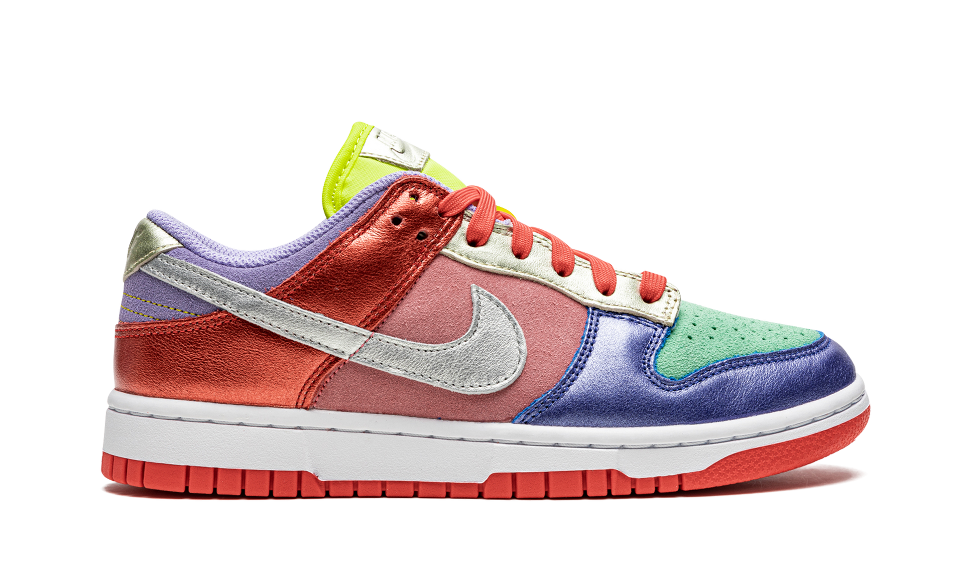 The Women’s Nike Dunk Low “Sunset Pulse” is a women’s exclusive colorway of the venerable lifestyle silhouette that features a mismatching color block of the left and right shoe. A June 2021 release, the “Sunset Pulse” is one of several Dunk releases for women that features a vibrant mixture of colors. On the left shoe, both the toe cap and forefoot display a glossy metallic red leather construction. The perforated toe and mid-panel are cast in lavender and mint green suede, respectively. A metallic royal blue leather panel can be found on the collar and pink suede appears on the heel. A metallic silver leather Swoosh graces both sides of the left shoe. The color block is rearranged on the right shoe. Metallic blue leather appears on the toe cap and forefoot. The perforated toe and mid-panel display a mint green and suede construction, respectively. A metallic red leather panel breaks up the look on the collar and lavender suede dots the heel. Just as it does on the left shoe, a metallic silver Swoosh appears on both sides of the right shoe. The left shoe has a light blue leather tongue with green laces and the right shoe features a yellow leather tongue with red laces. Release date: June 10, 2021. Sunset Pulse