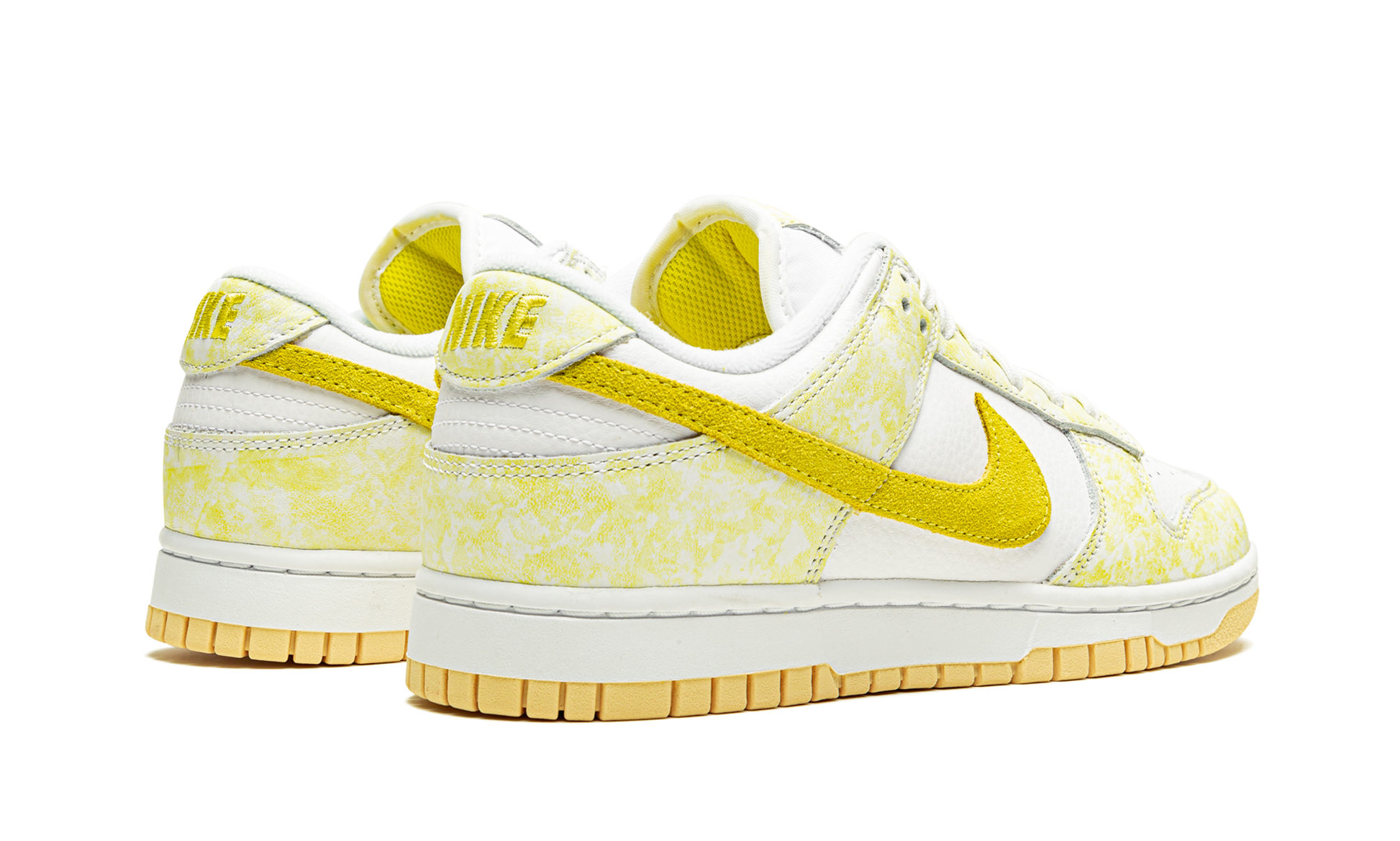 The Women’s Nike Dunk Low “Yellow Strike” is a women’s-only colorway of the retro basketball shoe that was released in August 2021. Similar to the shoe’s “Purple Pulse” style, the “Yellow Strike” displays white leather on the perforated toe and mid-panel with contrasting blotted patterning on the overlaid panels, in this case, yellow instead of purple. A yellow suede Swoosh appears on either side and yellow “Nike” branding is stitched onto the back of the shoe. Moreover, yellow “Nike” with a Swoosh appears on the tongue tag. The “Yellow Strike” features a unique design trait: the laces change color when exposed to sunlight. Release date: August 18, 2021 Yellow Strike